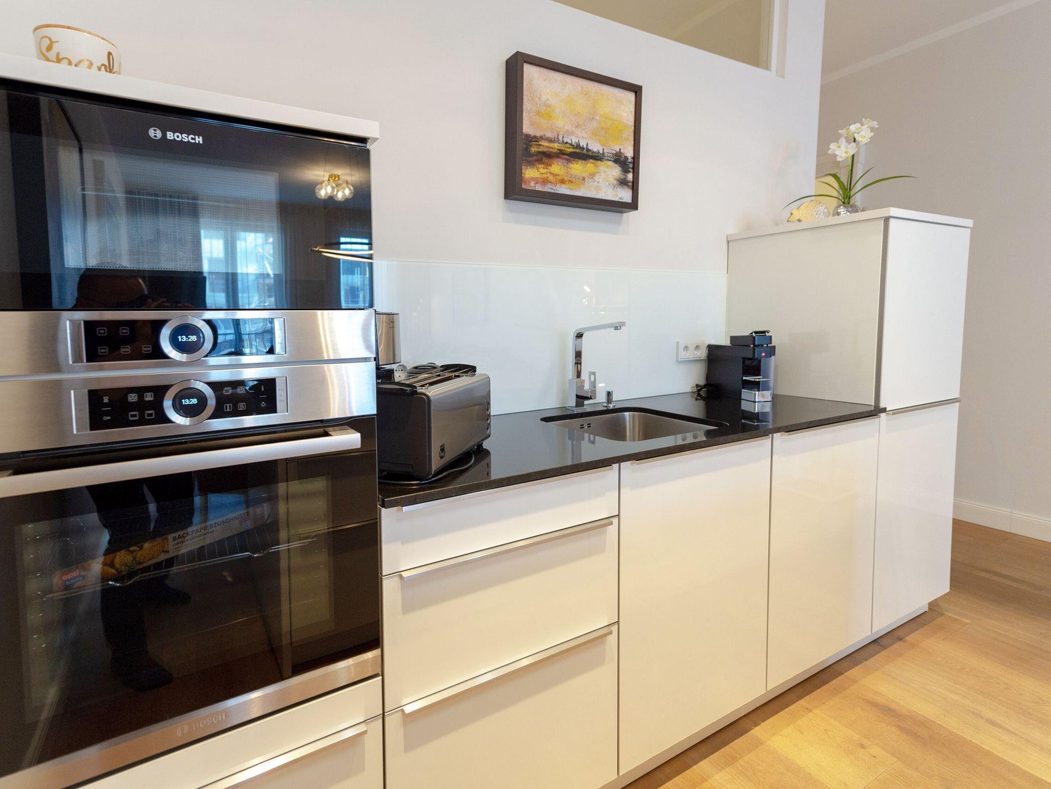 Die Küche sieht nicht nur äußerst elegant aus, sondern überzeugt natürlich auch mit ihrer Ausstattung. Dazu zählen u.a. ein Induktionsherd mit Backofen, ein geräumiger Kühlschrank mit Gefriermöglichkeit, eine Mikrowelle, eine Spülmaschine sowie Kaffeemaschine, Wasserkocher und Toaster. Wenn Sie also nicht unterwegs in einem der wirklich sehr empfehlenswerten Lokale der Insel Rügen einkehren, können Sie sich hier allerbestens selbst versorgen. Der nächste Bäcker für die frischen Frühstücksbrötchen ist nur zwei Gehminuten entfernt.