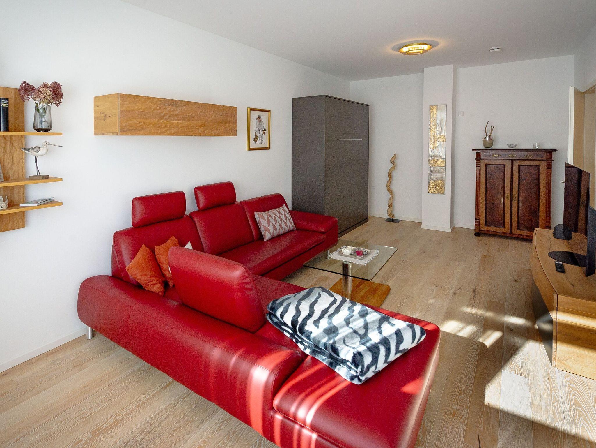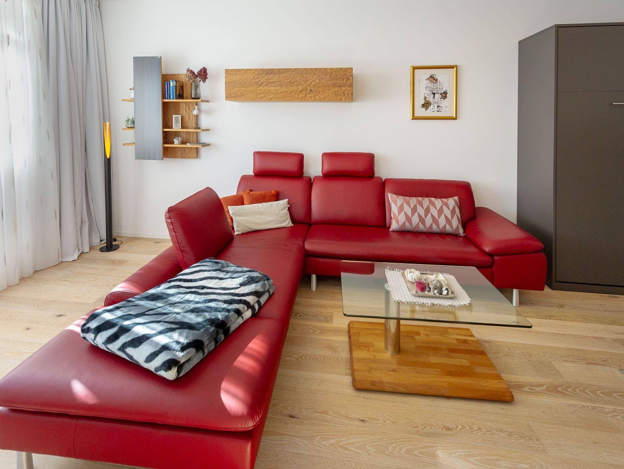 Unter dem Echtholzparkett sorgt eine Fußbodenheizung dezent für angenehmes Raumklima. Der Blick schweift wohlgefällig über liebevoll arrangierte Dekorationen und Bilder, kuschelige Kissen und Decken bis hin zum runden Esstisch an der bodentiefen Fensterfront.