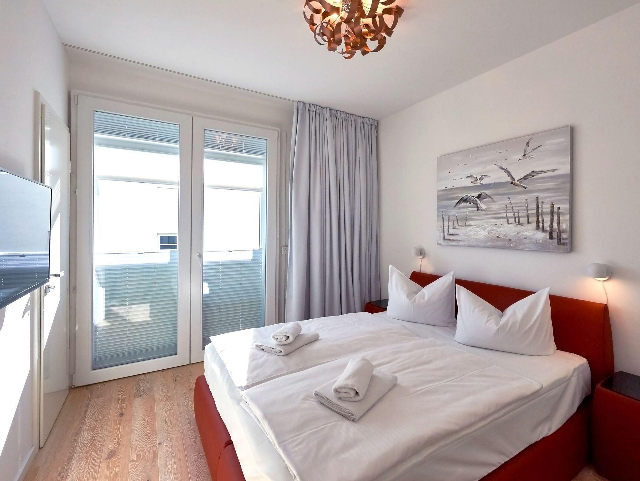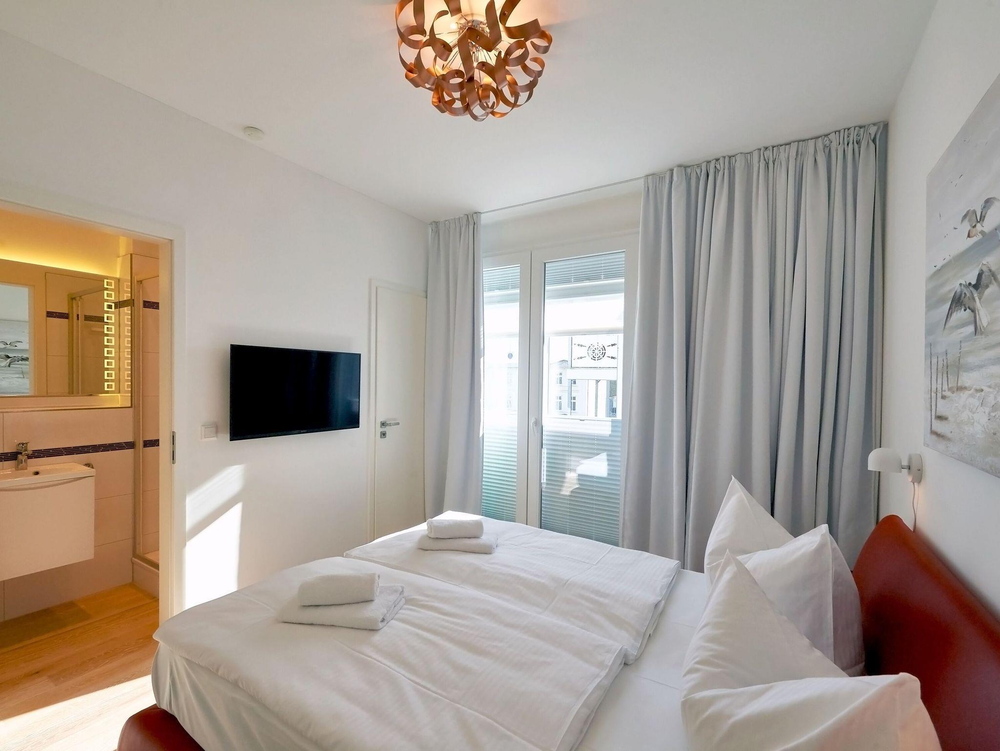 Im Schlafzimmer mit zusätzlichem Smart-Fernseher und begehbarem Kleiderschrank verspricht ein herrlich bequemes Boxspring-Doppelbett (1,80 x 2,00m) allerbesten Schlafkomfort. Selbstverständlich lassen sich dieser und auch alle anderen Räume mit Plissees und Verdunkelungsvorhängen gegen die Sonne abschirmen.