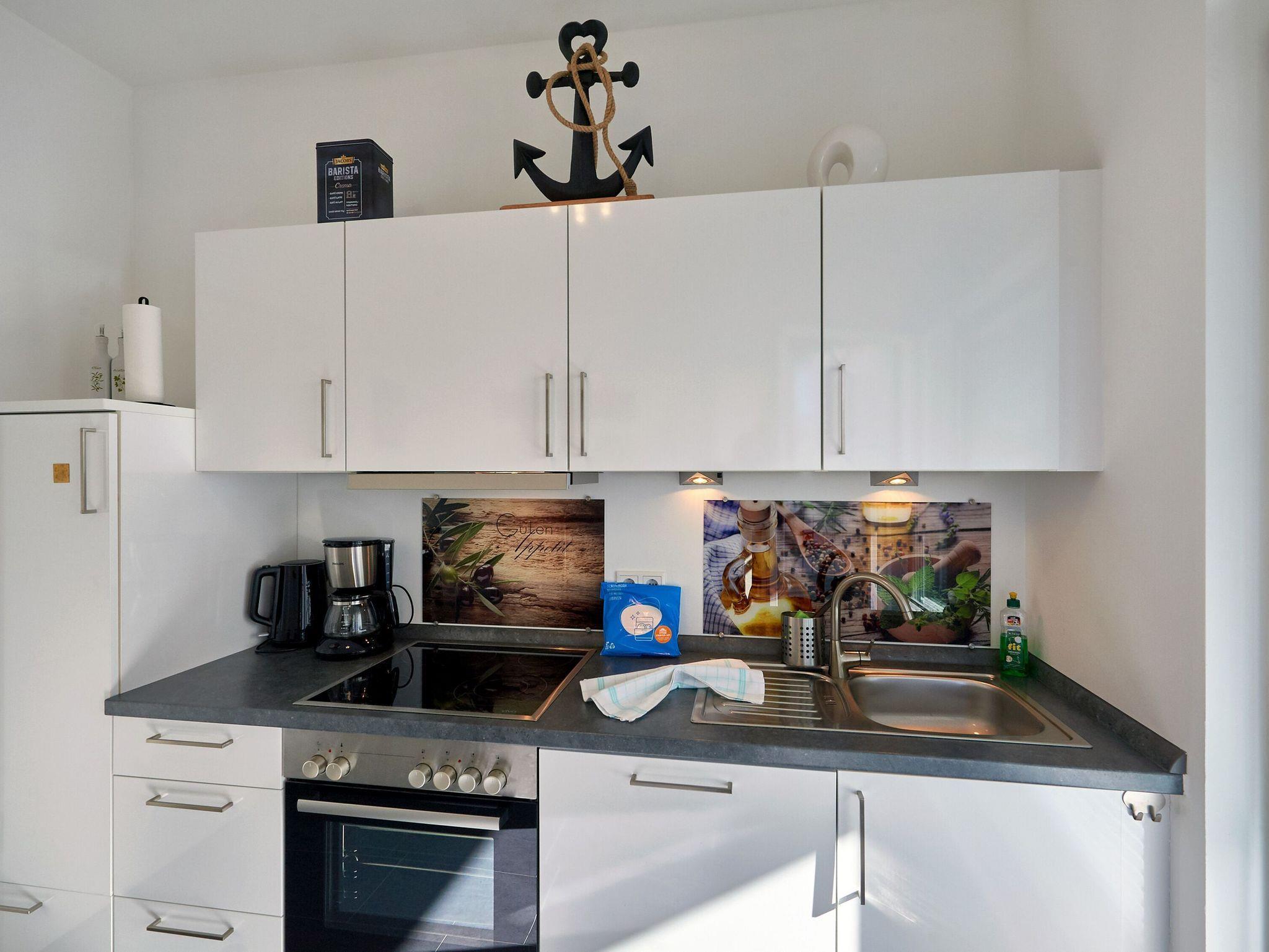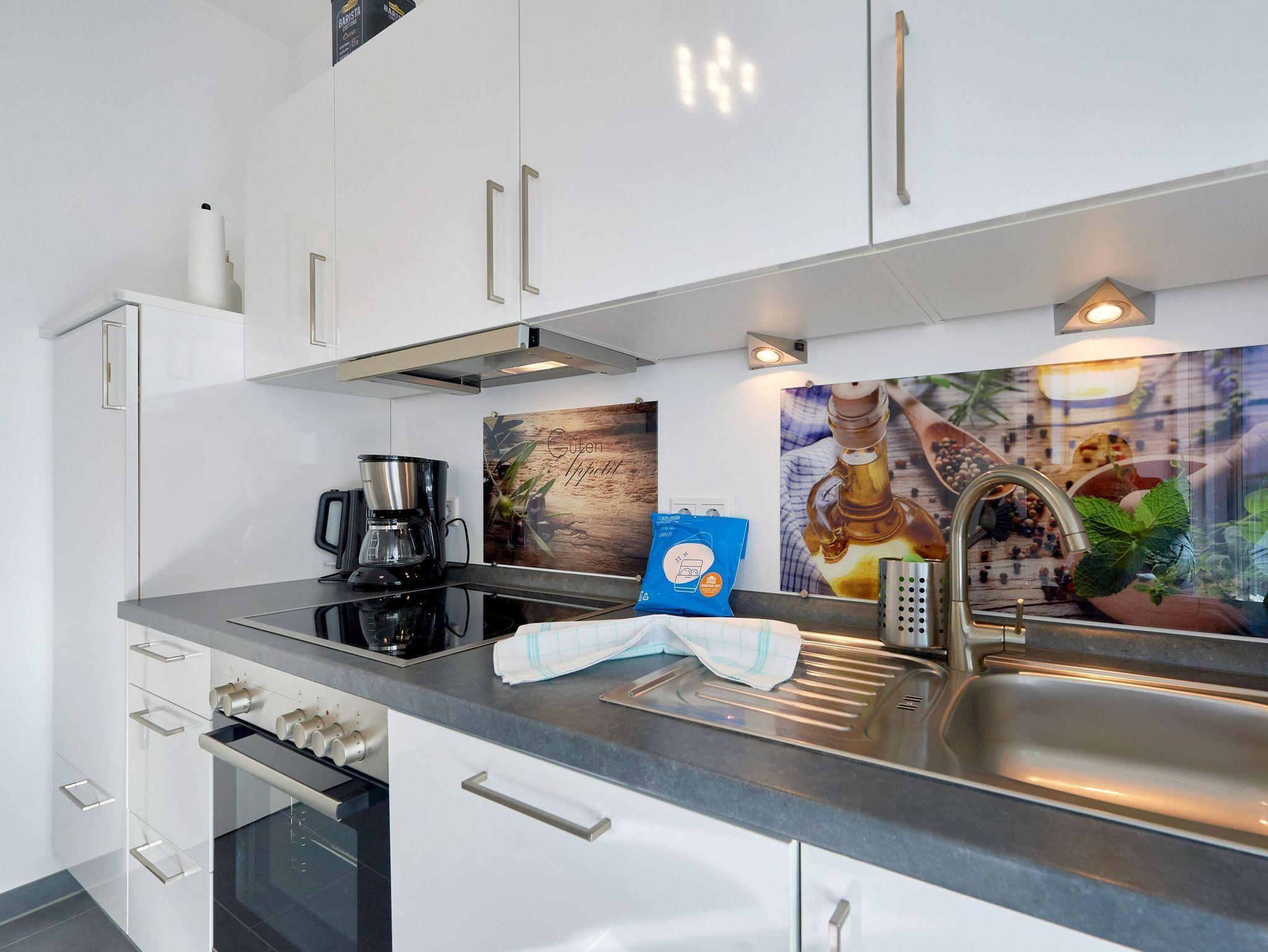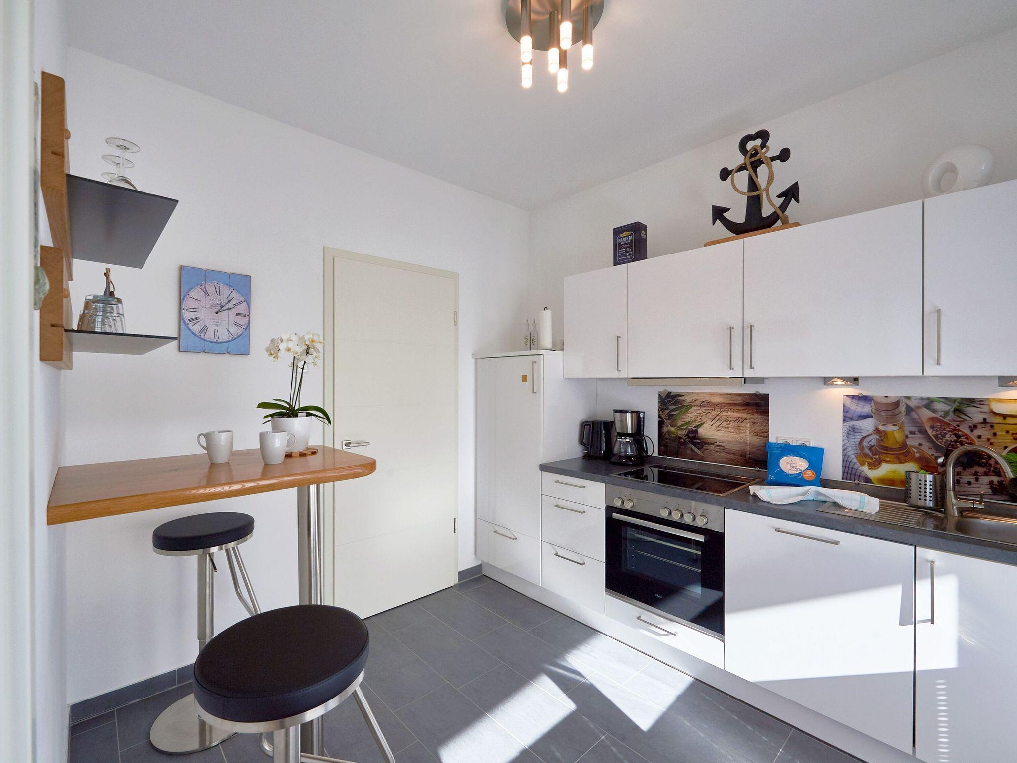 Die separate Küche gleich nebenan ist mit allem Erdenklichen ausgestattet, um sich selbst zu „bekochen“, falls man nicht gerade in einer der überaus empfehlenswerten Lokalitäten des Ortes einkehrt. Neben einem 4-Zonen-Ceranherd inkl. Backofen und Abzugshaube, einem Geschirrspüler, einem Kühlschrank mit Gefrierfach sowie Kaffeemaschine, Wasserkocher und Toaster zählt dazu natürlich auch das passende Geschirr und sonstiges Kleininventar.