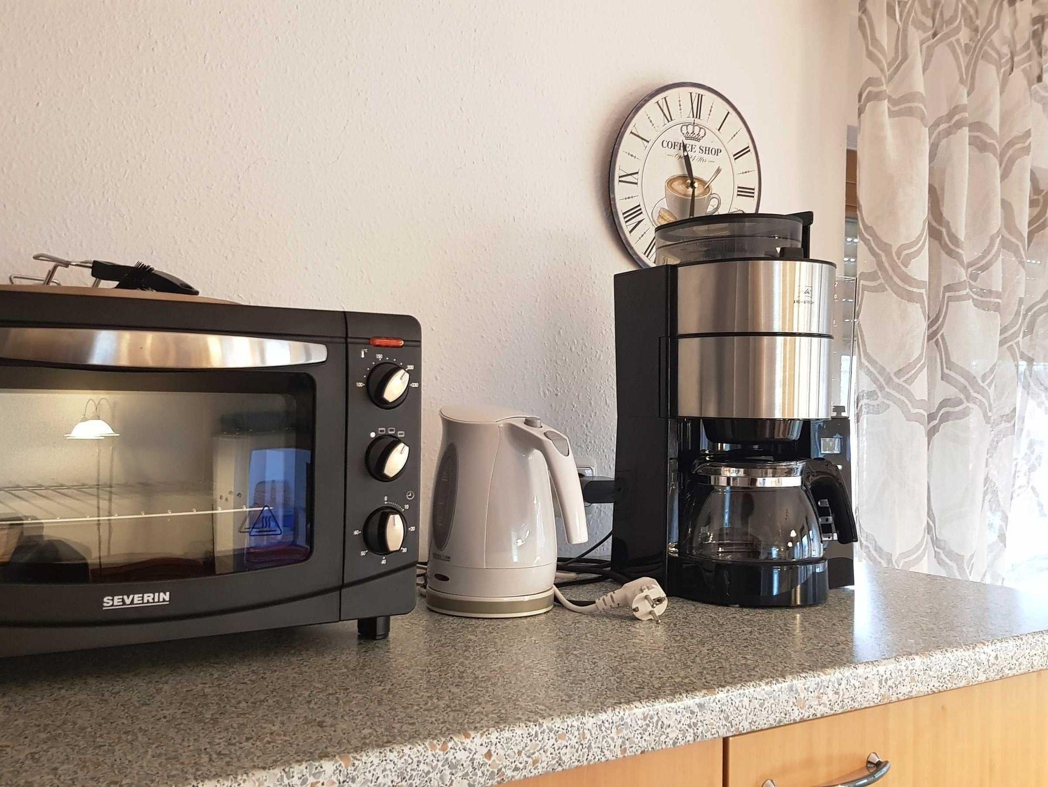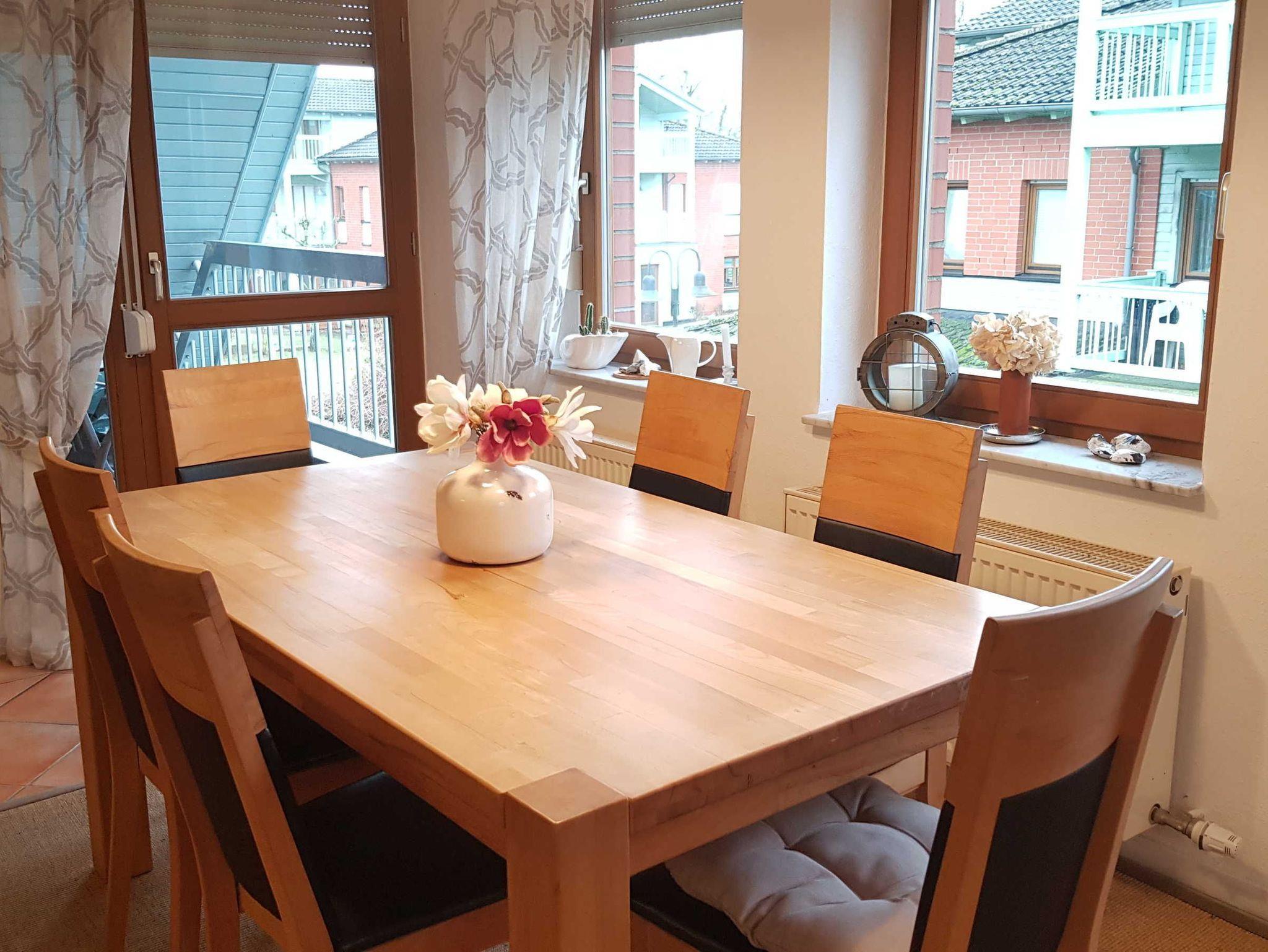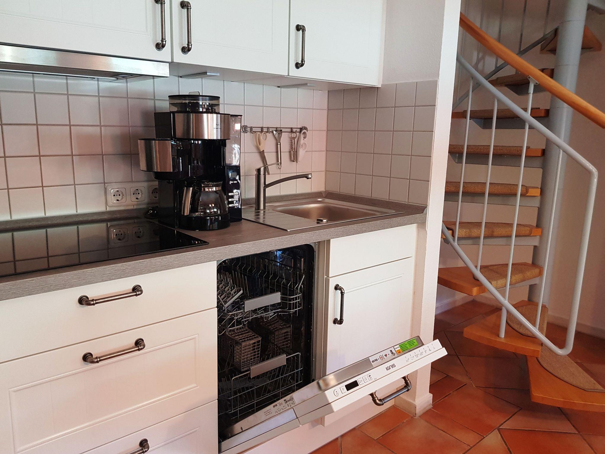 Der Essbereich schließt sich direkt an den Wohnbereich und die offene Küche an. Die Küchenausstattung beherbergt alles, was geübte Selbstversorger benötigen; einen Kühlschrank, eine Mikrowelle, ein 4-Platten-Cerankochfeld und eine Geschirrspülmaschine.