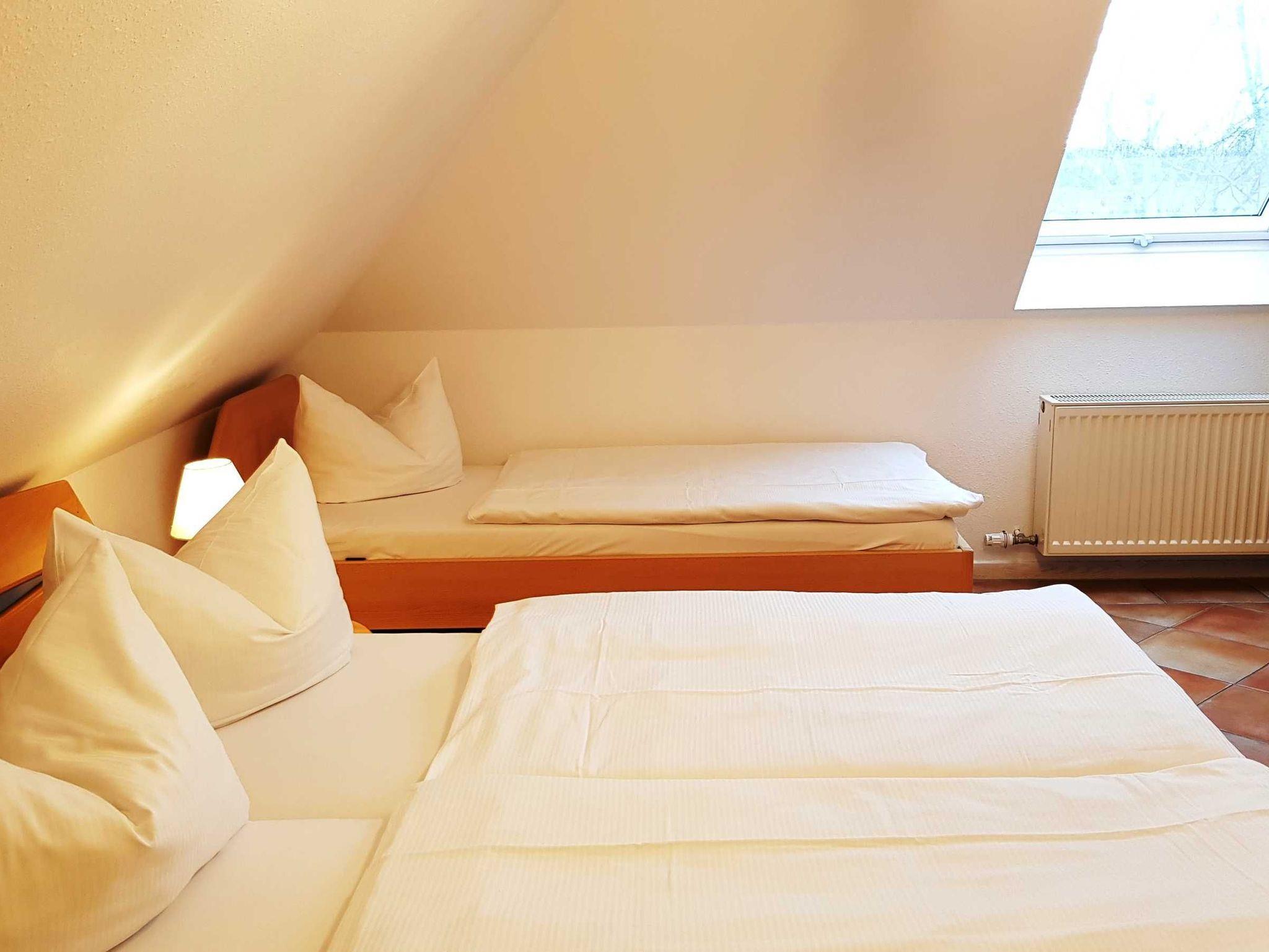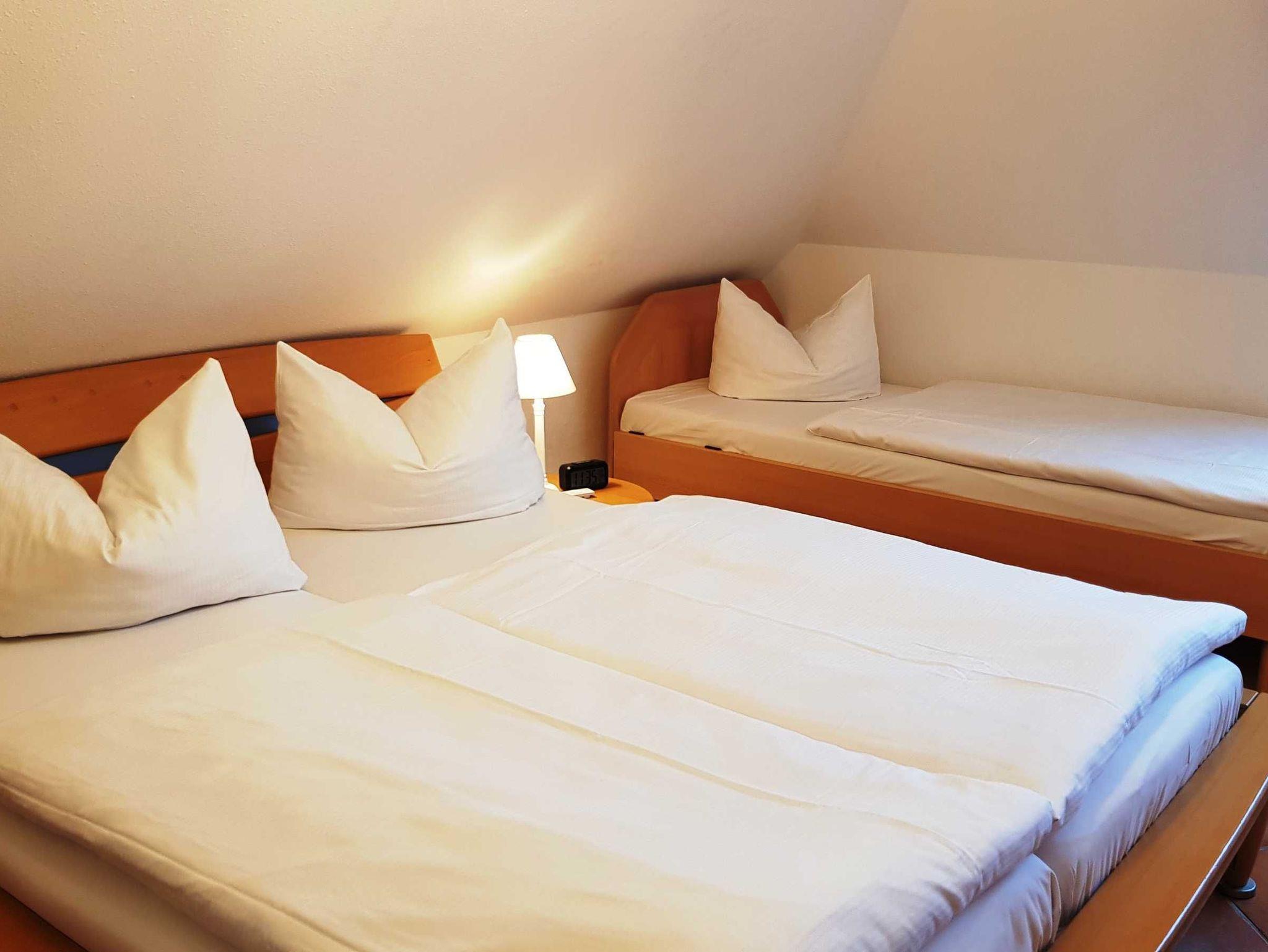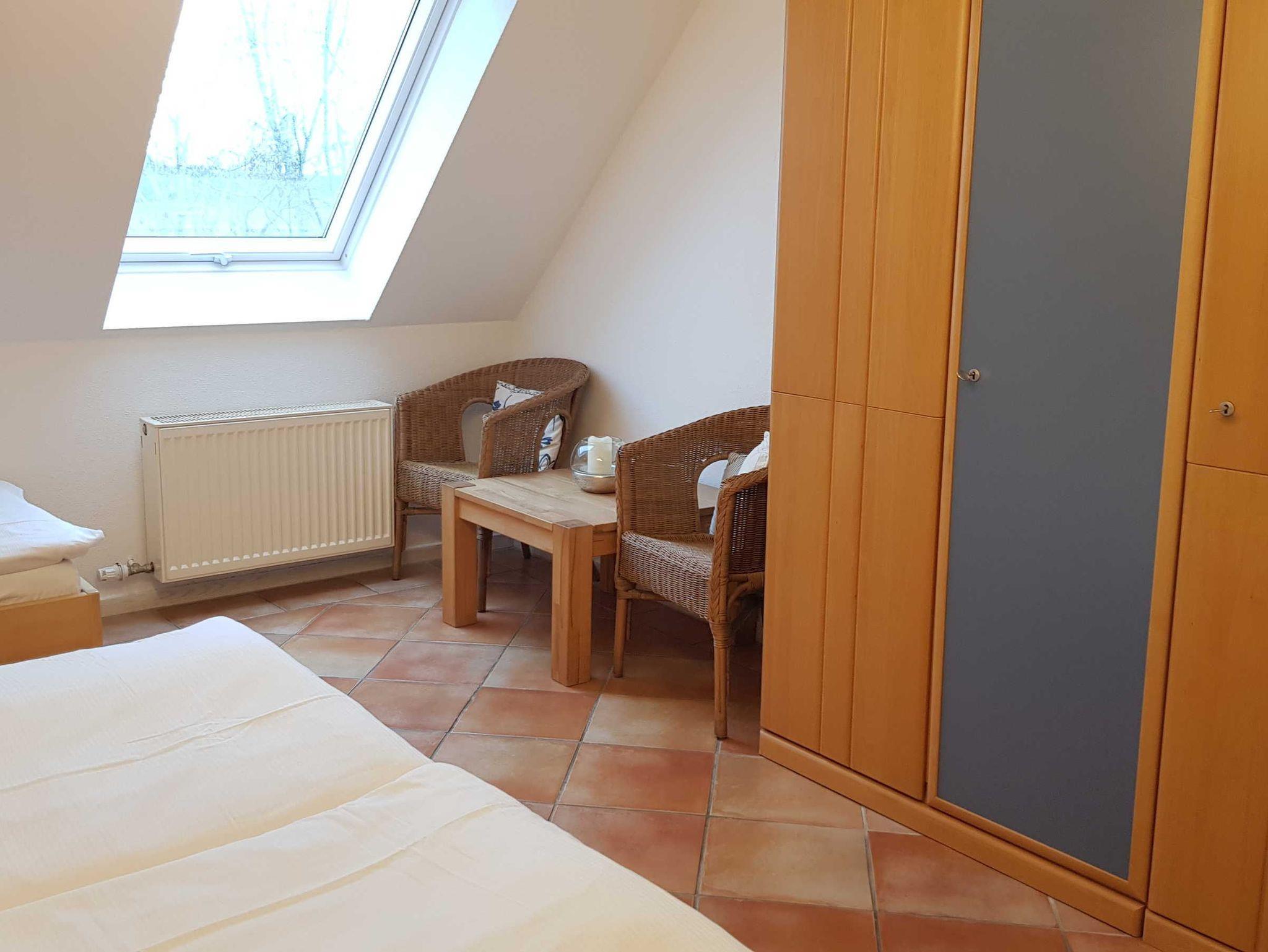 Im oberen Teil der Wohnung befindet sich das Schlafzimmer, welches Platz für bis zu 3 Personen bietet. Dank einem Doppelbett und einem zusätzlichen Einzelbett sind hier erholsame Schlafstunden garantiert.
