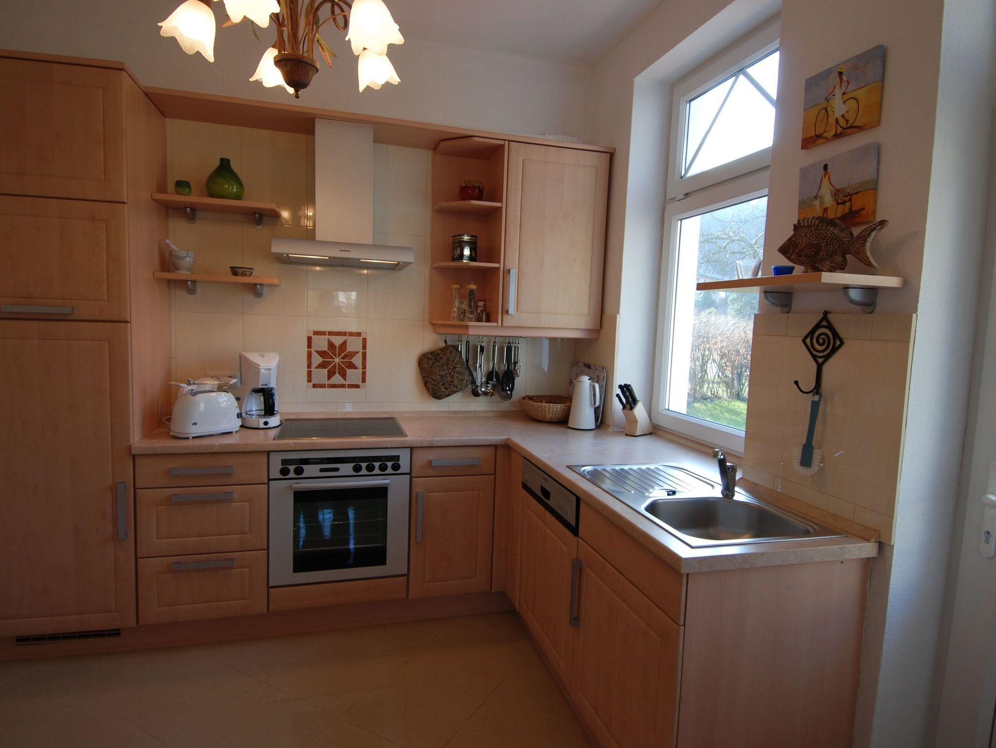 Die separate, sehr gut ausgestattete Küche lässt mit einem 4-Zonen-Cerankochfeld, einem Kühlschrank, einem Backofen, einer Mikrowelle und diversem Kleininventar keine Wünsche offen. Von der Küche aus haben Sie einen direkten Gartenzugang.