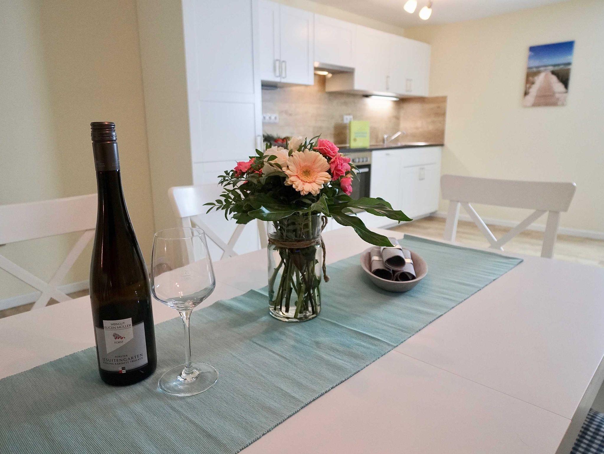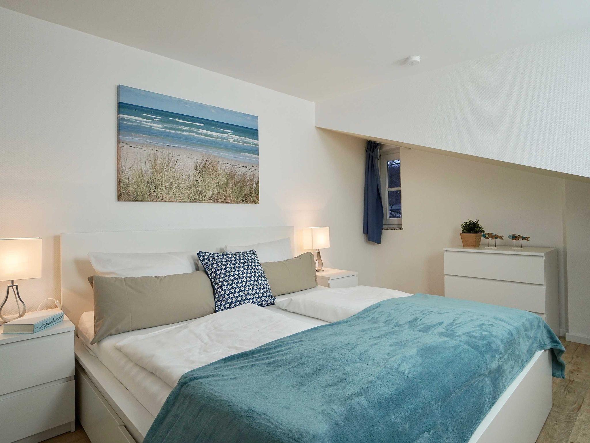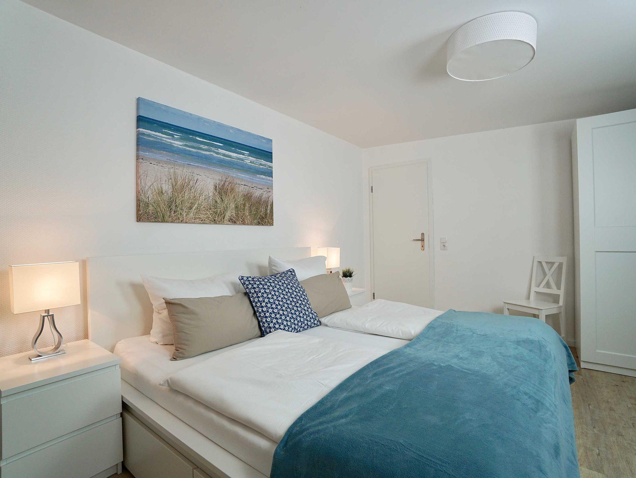 Starten Sie hier idyllisch in Ihren Urlaubstag und genießen Sie ein leckeres Frühstück direkt auf Ihrem Balkon. Die Ausrichtung der Balkone sind nach Süd bzw. Nord. Eine Treppe führt Sie direkt in den Küchenbereich, in dem die große Küchenzeile über alles verfügt, was das Herz zum Kochen begehrt. Nutzen Sie den Backofen sowie das moderne 4-Platten-Cerankochfeld und lassen Sie doch den Geschirrspüler das Abwaschen übernehmen. Am großzügigen Esstisch finden alle Gäste dieser Wohnung bequem Platz. Von hier aus erreichen Sie auch die beiden separaten Schlafzimmer, die jeweils mit einem bequemen Doppelbett und einem großen Kleiderschrank ausgestattet sind. Ebenso grenzt hier das Tageslicht durchflutete, moderne Bad mit 2 Waschbecken, WC und ebenerdiger Dusche an.