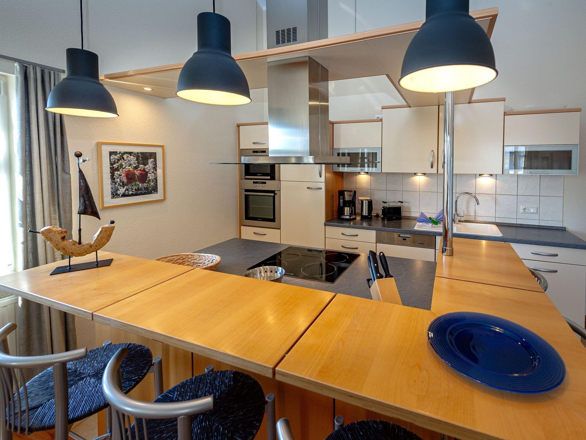 Die harmonisch im Wohnbereich integrierte Küche ist komplett ausgestattet mit einem Kühlschrank mit Gefrierfach, einer Geschirrspülmaschine, Wasserkocher, Kaffeemaschine, Toaster und diversem Kleininventar, das die Küchenausstattung komplettiert. Der Backofen und die Mikrowelle befinden sich auf Augenhöhe und sind bequem erreichbar. Ein separater Küchenblock mit einem 4-Platten-Cerankochfeld und einem Esstresen mit Barhockern vervollständigen den sehr guten Eindruck.