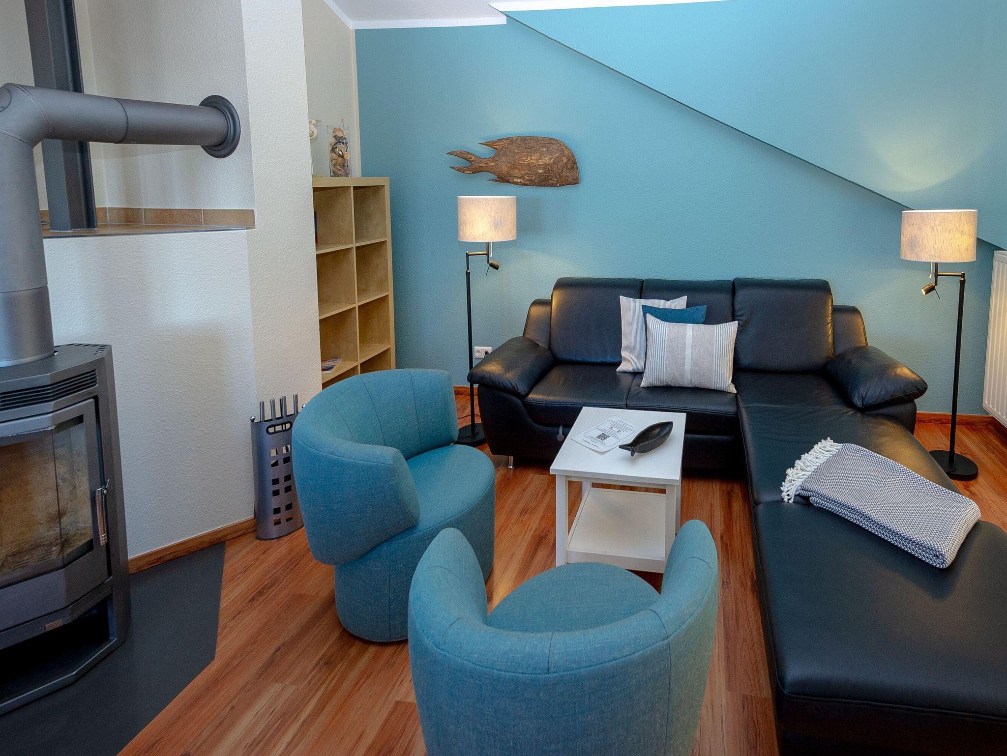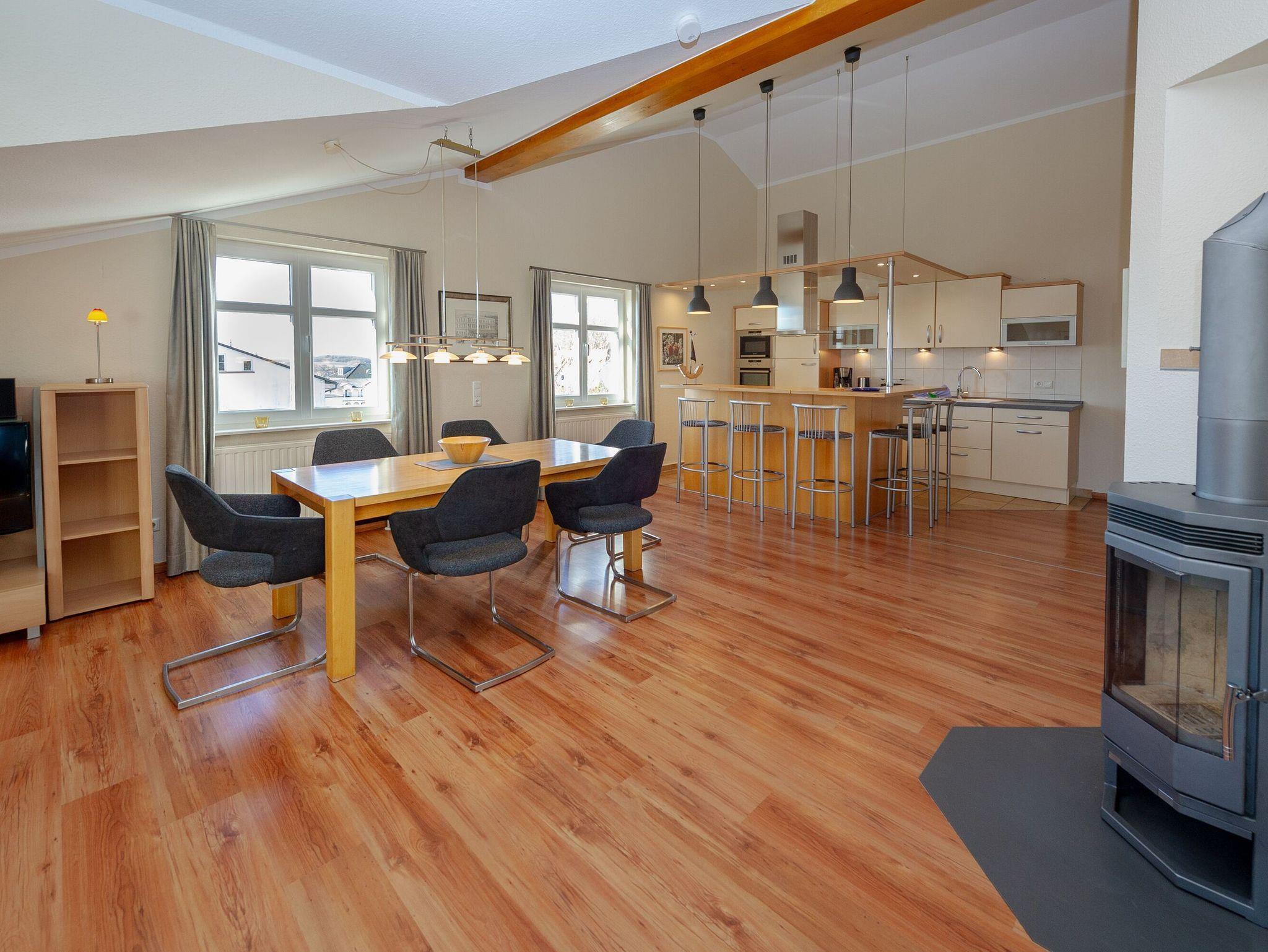 Der helle, großzügige Wohnraum ist mit einer bequemen Couch, zwei Sesseln, zwei Korbsesseln, einem Kaminofen, einem Flachbild-TV, einer Mini-Stereoanlage mit CD-Player und einem Esstisch passend für die Personenanzahl in der Wohnung ausgestattet. Die leichten Dachschrägen mit den offenen Balken vermitteln eine besondere Gemütlichkeit.