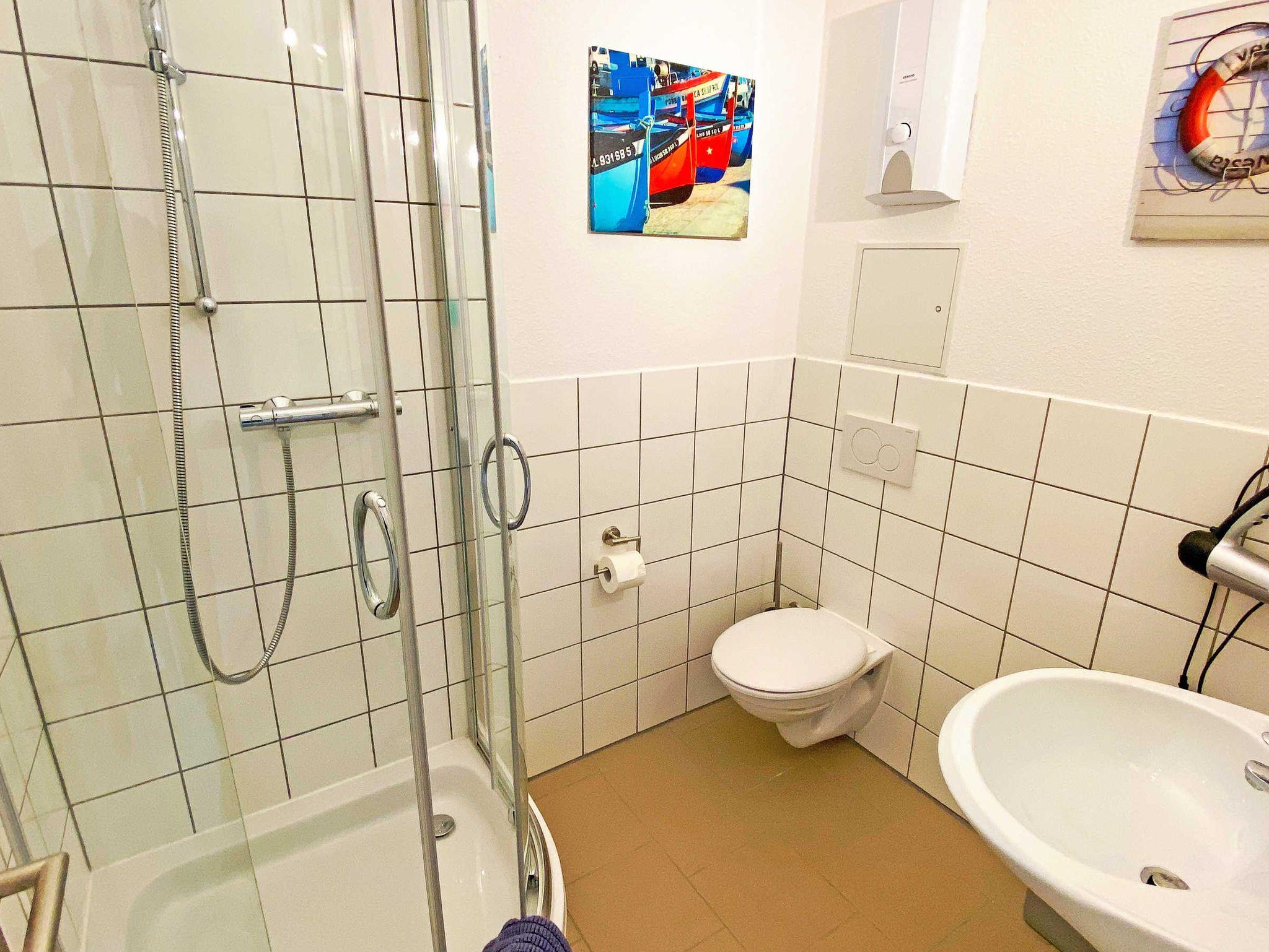 Es gibt zwei moderne Bäder. Das erste Bad ist mit Spiegel, Waschbecken, WC und Waschmaschine ausgestattet. Das zweite Bad verfügt über einen Spiegel, ein Waschbecken und eine Dusche.