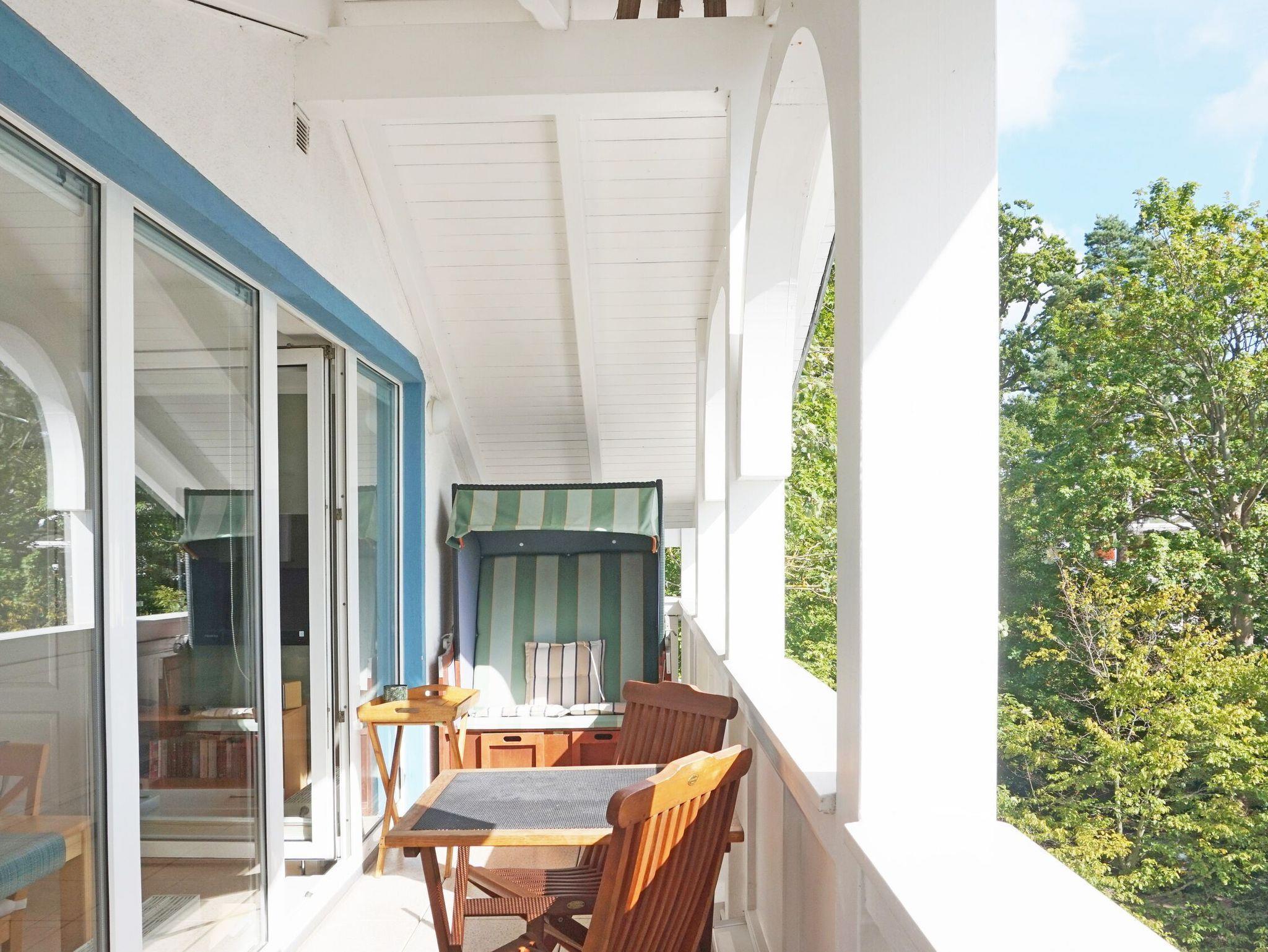 Von hier aus erreichen Sie auch den großen, überdachten Balkon. Komfortable Gartenmöbel mit entsprechenden Auflagen und ein eigener Strandkorb stehen Ihnen beispielsweise für ein sonniges Frühstück zur Verfügung.