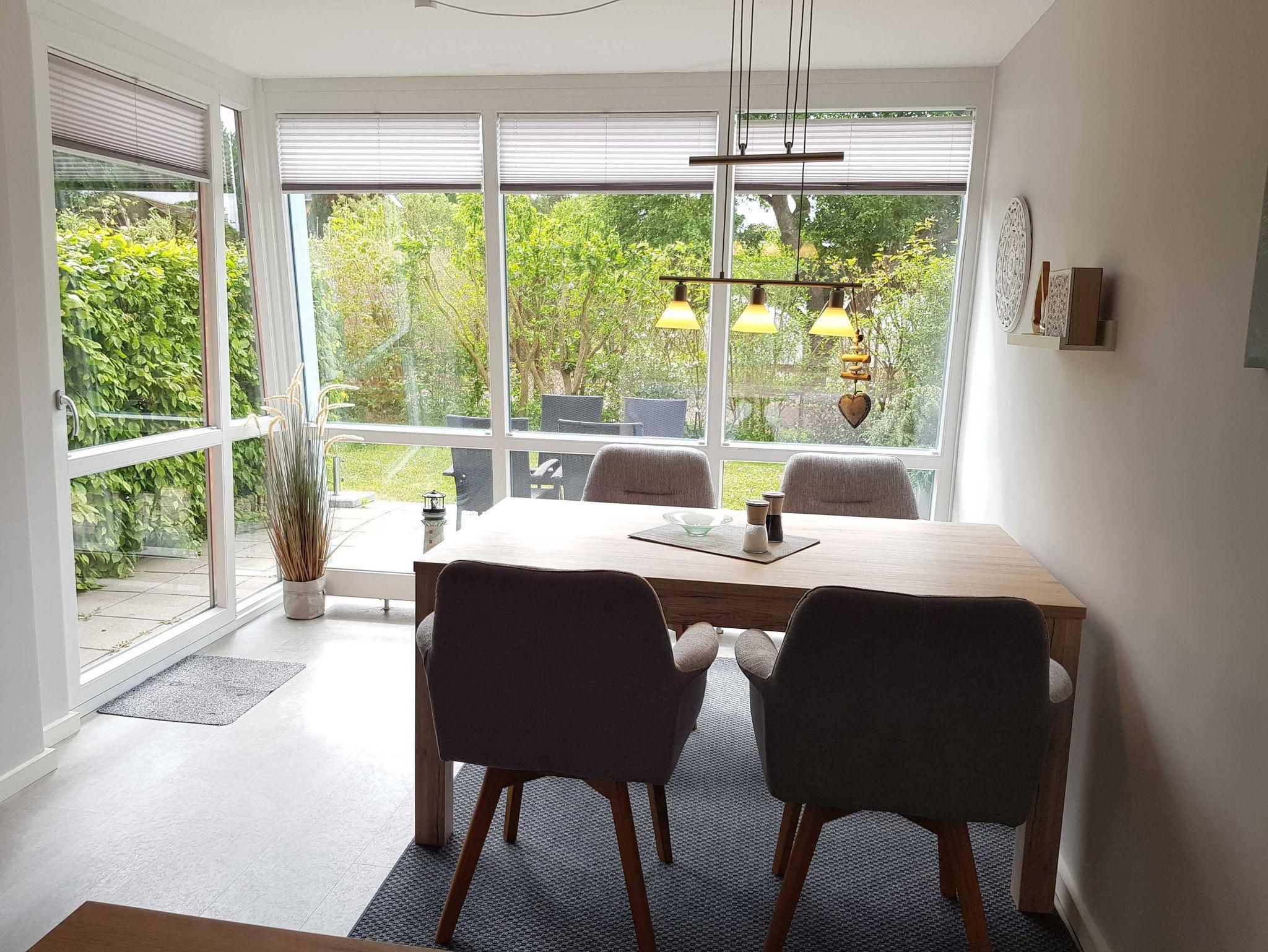 Liebevoll eingerichtete 2,5 Raum-Ferienwohnung (52m²) für bis zu 4 Personen im EG, mit Terrasse und gemütlichem Wintergarten im Wohnbereich, Sitzecke mit Flachbild-TV und Relaxstuhl, Essbereich im Wohnzimmer/Wintergarten.