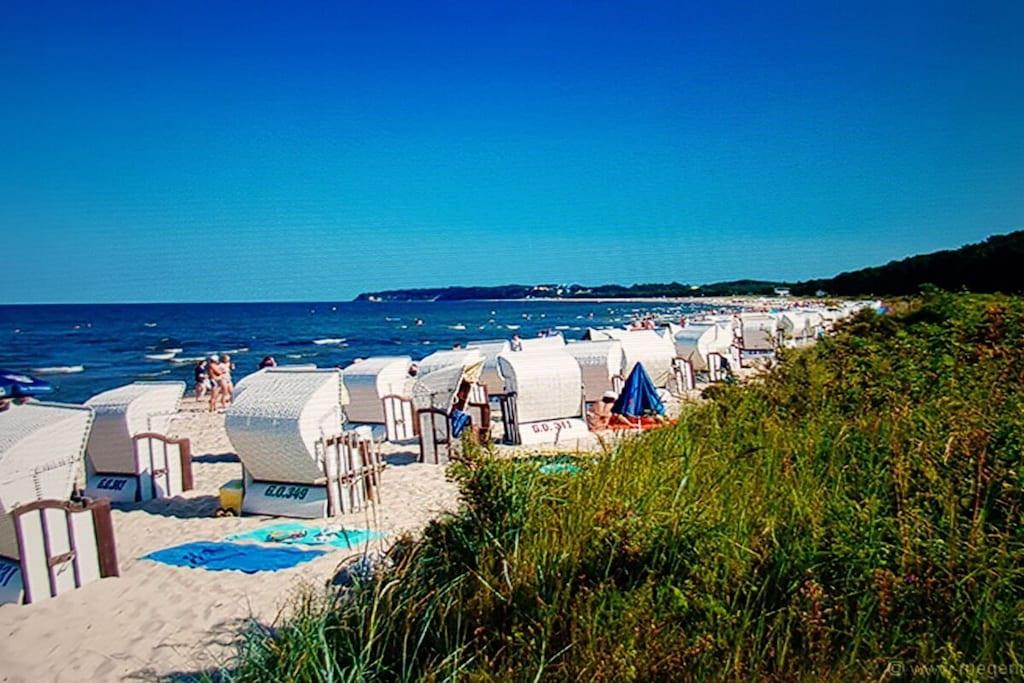 Leiligheten i toppetasjen har et soverom med dobbeltseng og garderobe, samt et andre soverom med enkeltseng. Det fullt utstyrte kjøkkenet med spiseplass går over i stuen, hvor en sovesofa gir ekstra soveplass. Fra kjøkkenet har du tilgang til den sørvestvendte balkongen, perfekt for å slappe av etter en solrik dag på stranden eller for å utforske den vakre øya Rügen, og som tilbyr en fantastisk utsikt over innsjøen Sellin. Badet med dusj, dobbel servant og vindu fullfører leiligheten. Sengetøy og håndklær er ikke inkludert, men kan leies separat. Parkeringsplass nummer 18 i den underjordiske garasjen er tilgjengelig for din bruk. En heis gir direkte og praktisk tilgang fra garasjen i første etasje til leiligheten i 3. etasje. Vaskemaskin og tørketrommel er tilgjengelig på vaskerommet (mot et gebyr). Sykkelbod er også tilgjengelig. Wi-Fi er tilgjengelig. Leiligheten ligger rett ved skogkanten, bare ca. 500 meter fra stranden.