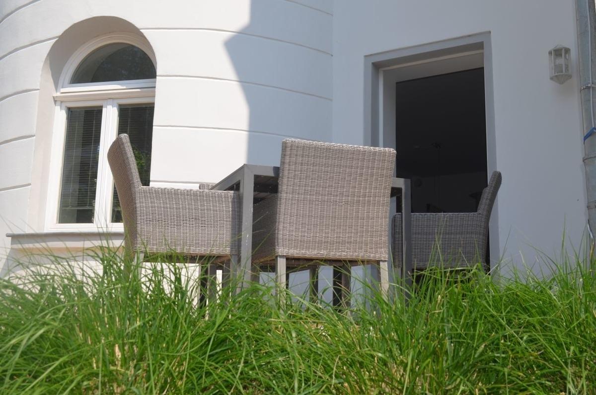 Genießen Sie die schönste Zeit im Jahr, in einer der schönsten Villen Rügens, der Villa Odin in Sellin. Die Villa Odin bietet dieses außergewöhnliche, großzügig und helle Apartment. Die Wohnung ist hochwertig und geschmackvoll möbliert, hat ein Abluftsystem und einen direkten Zugang zu der in Richtung Westen gelegenen Terrasse, auf der man einen schönen Blick über die tiefergelegene Wilhelmstraße genießt. Dieses Apartment lässt keine Wünsche offen. Hier erwarten Sie 85 qm zum Wohlfühlen und Entspannen. Der großzügige Wohn- Ess- & und Kochbereich enthält eine moderne Miele Küche mit Kühlschrank, Gefrierfach, Backofen, Mikrowelle, Induktionsfeld mit Bora-Abluftsystem, Spülmaschine, Toaster, Wasserkocher, Kaffeemaschine und ist mit hochwertigen Küchenhelfern bestückt. Der Wohnbereich ist mit einer gemütlichen Sitzecke im Turmbereich, einen Flachbild-TV und einen bequemen Ledersofa, welche zum Verweilen einladen, ausgestattet. Das luxeriöse Apartment beinhaltet ein großes und ein kleines Schlafzimmer, jeweils mit Doppelbetten und geräumigen Kleiderschränken. Das Badezimmer ist sehr modern, mit einer großen Regendusche, Waschbecken und WC (softclosing) ausgestattet.
