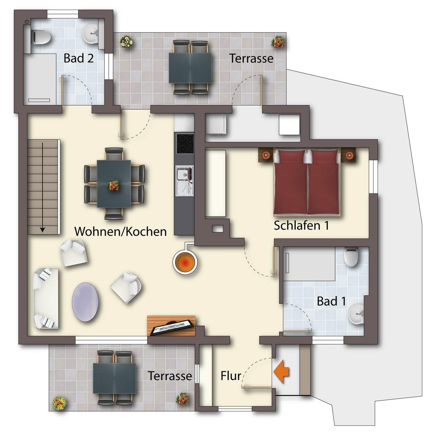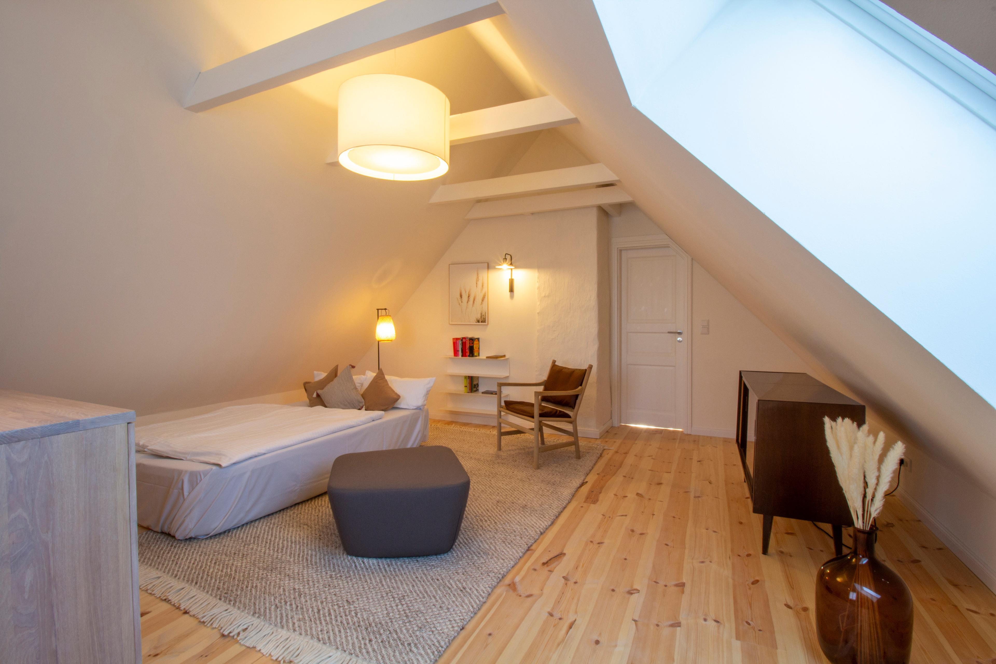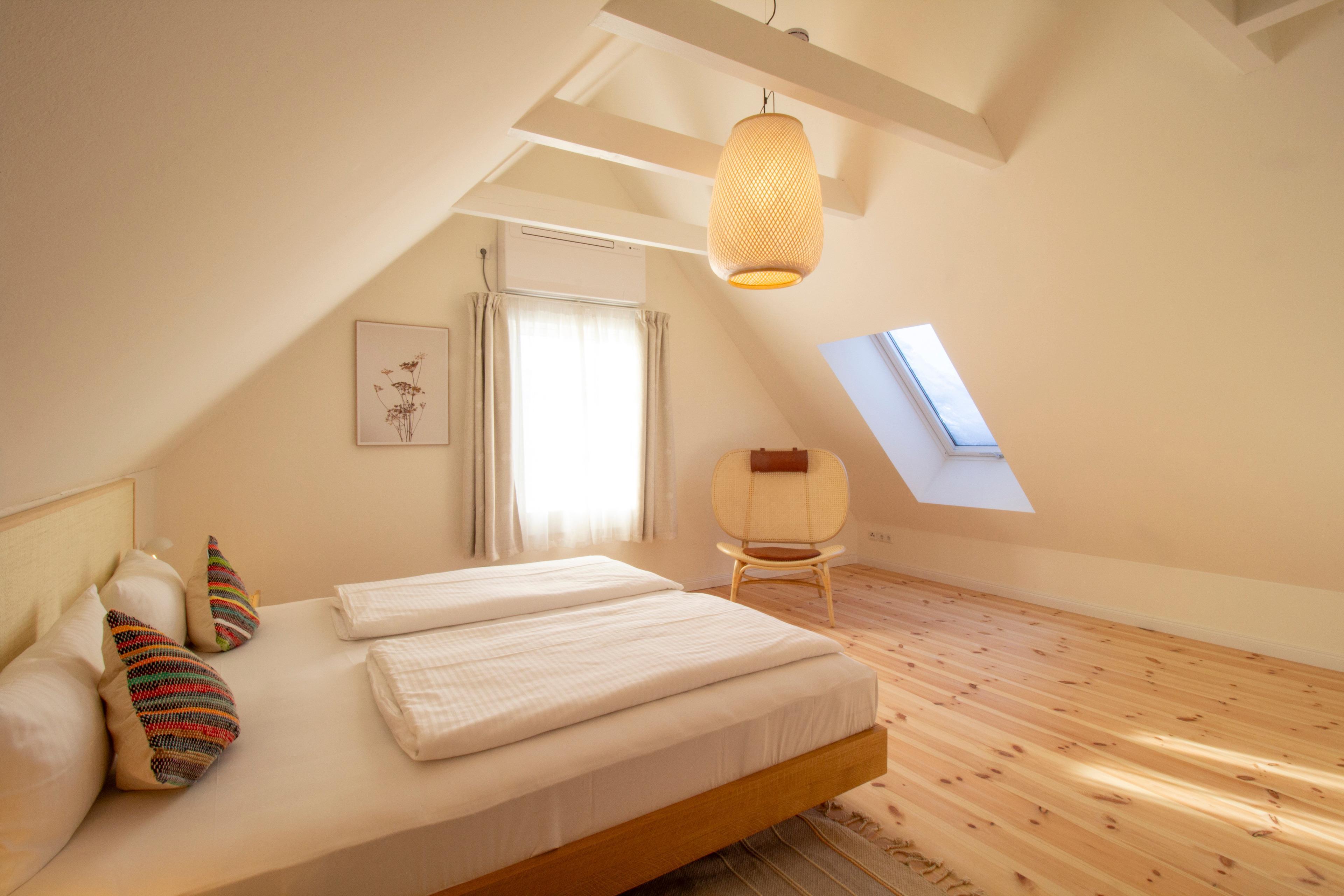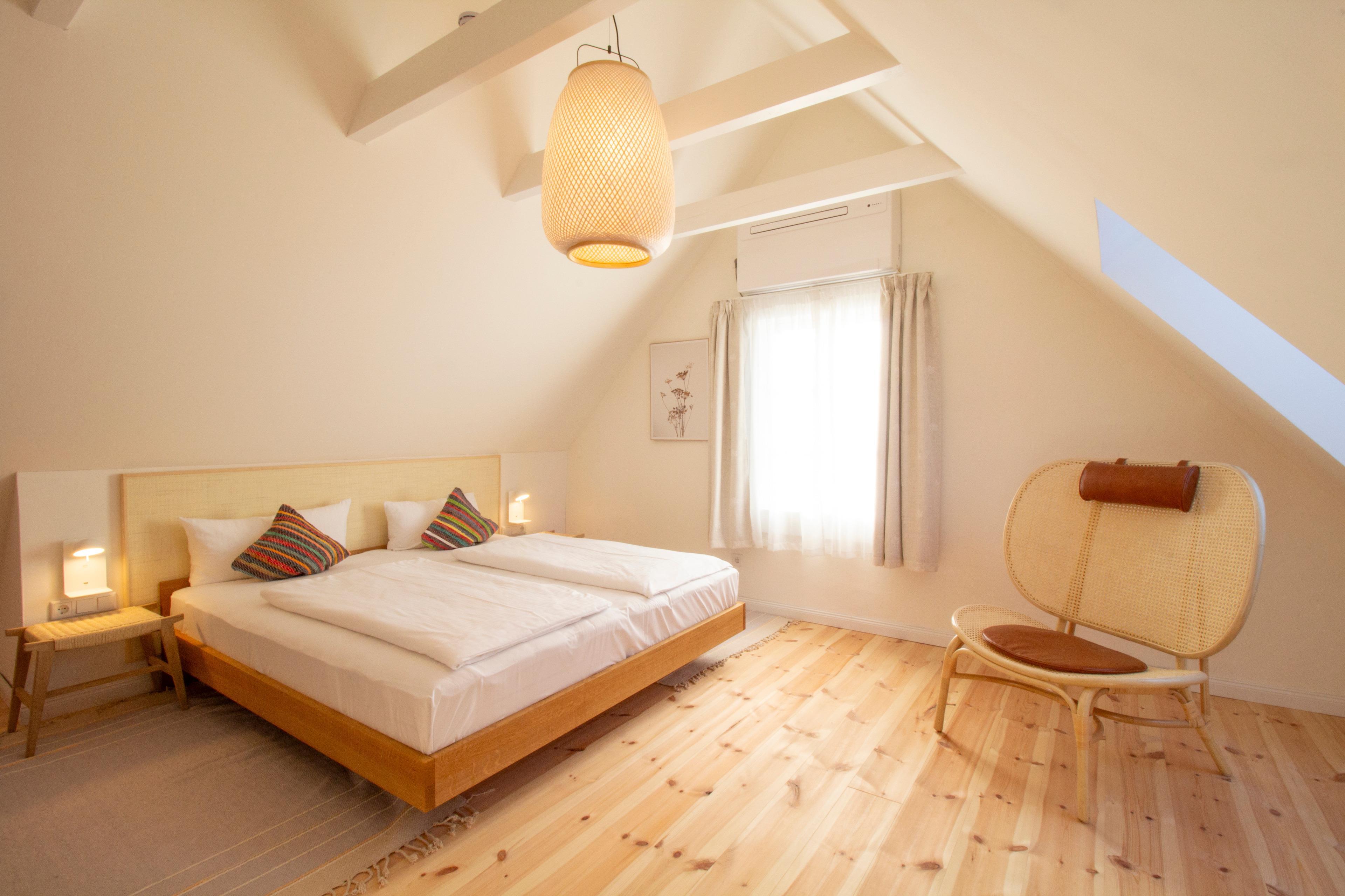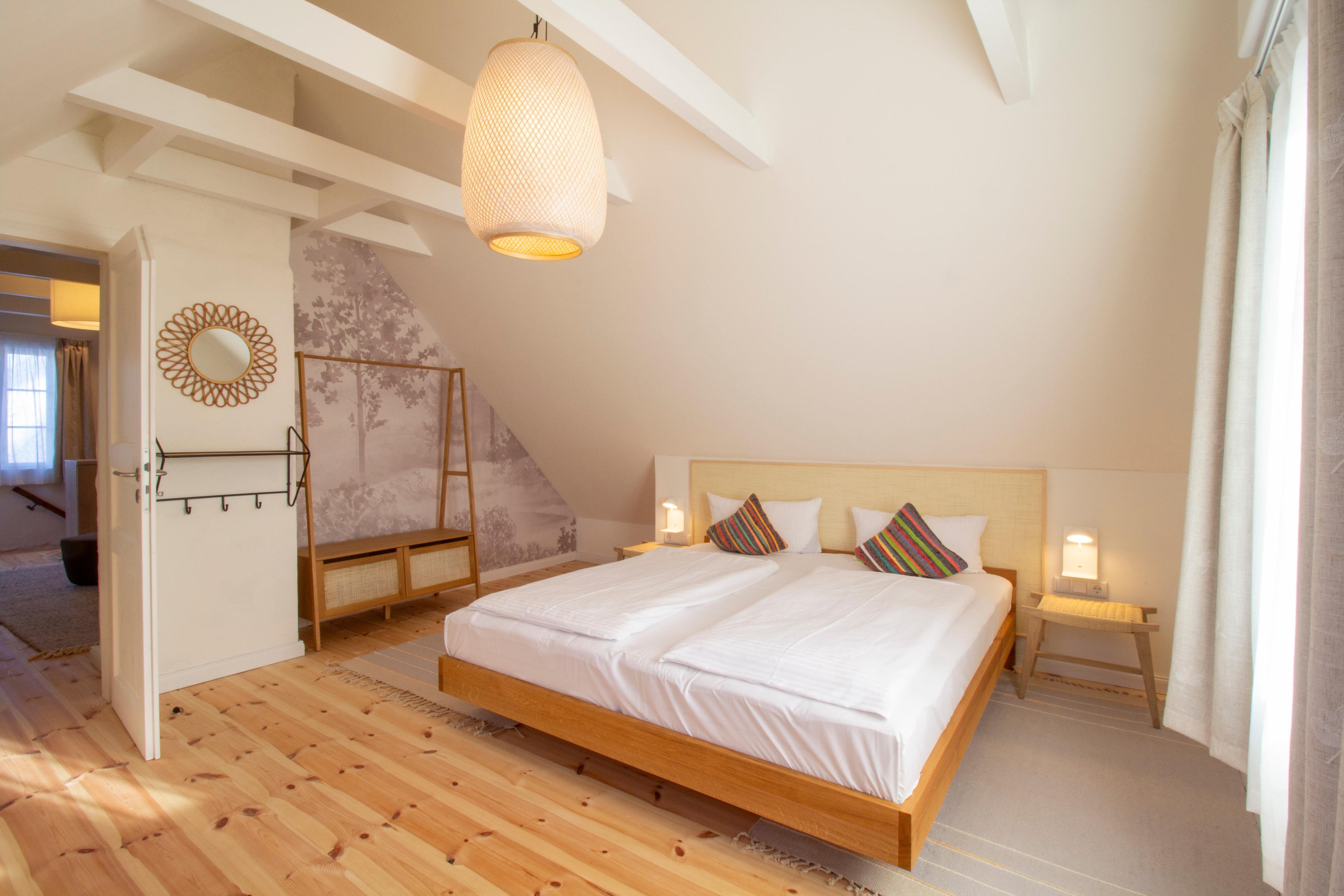 Die beiden Schlafzimmer, welche Ruhe und Entspannung bieten sollen, sind mit 180cm breiten Massivholz-Doppelbetten ausgestattet, die mit hochwertigen Hotelmatratzen für erholsamen Schlafkomfort sorgen. Im Obergeschoss befindet sich zudem ein Design-Schlafsofa, das als zusätzliche Schlafgelegenheit für Gäste oder als Ort zum Ausruhen dient.
