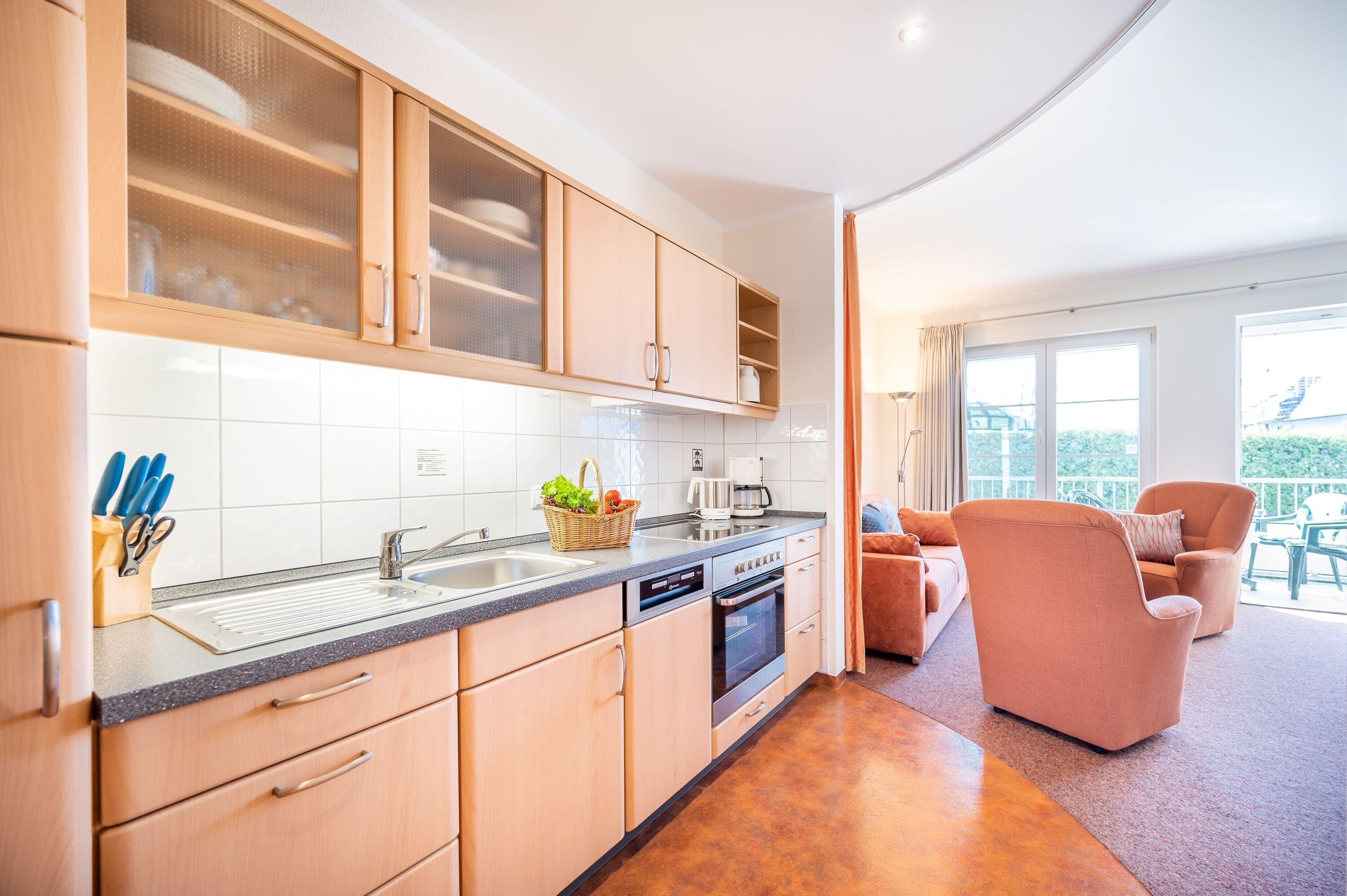 Die Küchenzeile ist mit einem Kühlschrank, einem Ceranfeld mit Backofen, einer Spülmaschine und einer Mikrowelle ausgestattet. Ebenso finden sich hier alle nötigen Küchenkleingeräte (Wasserkocher, Kaffeemaschine, Toaster..).