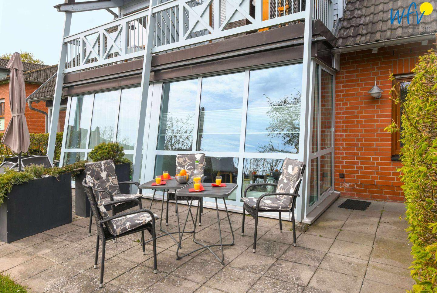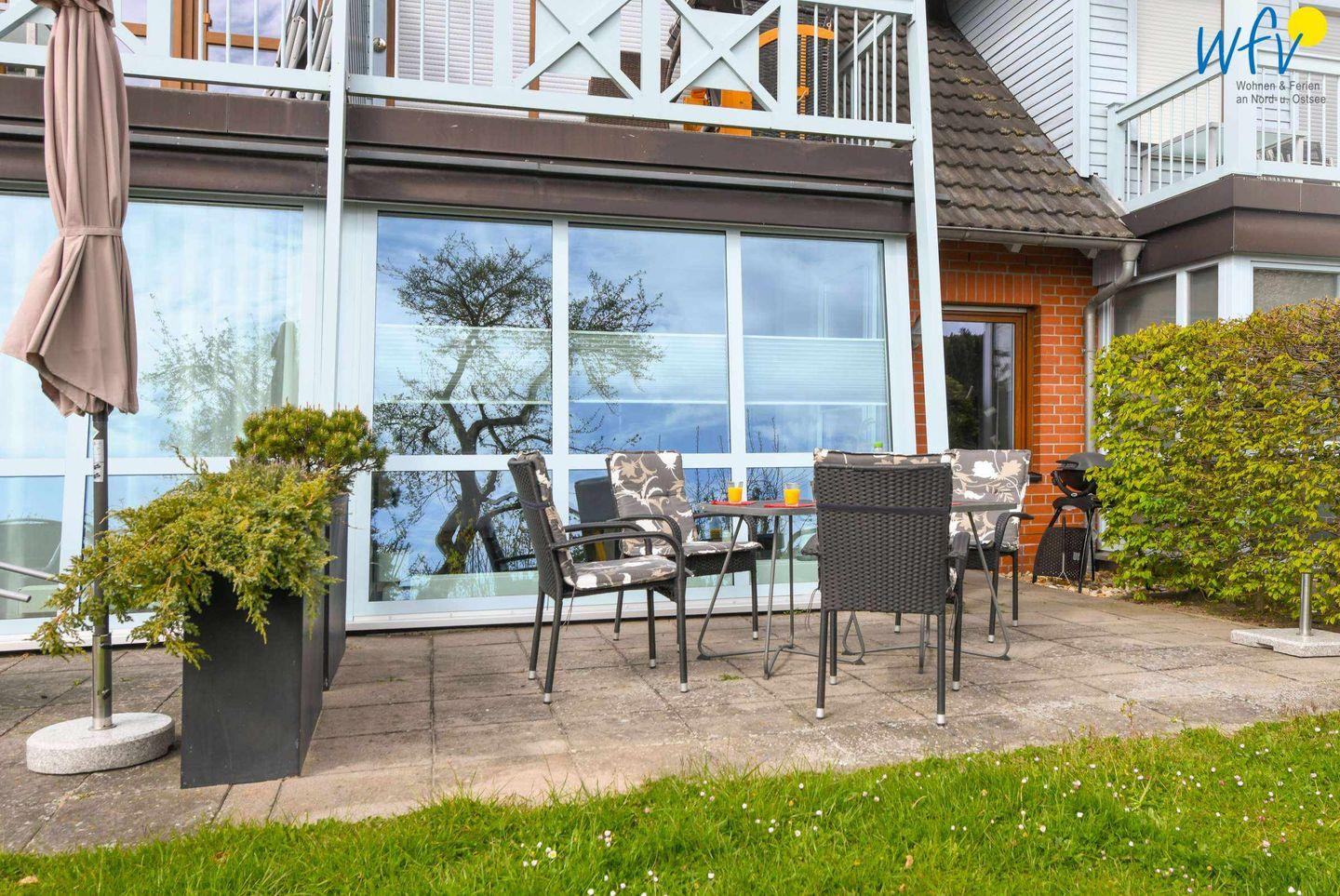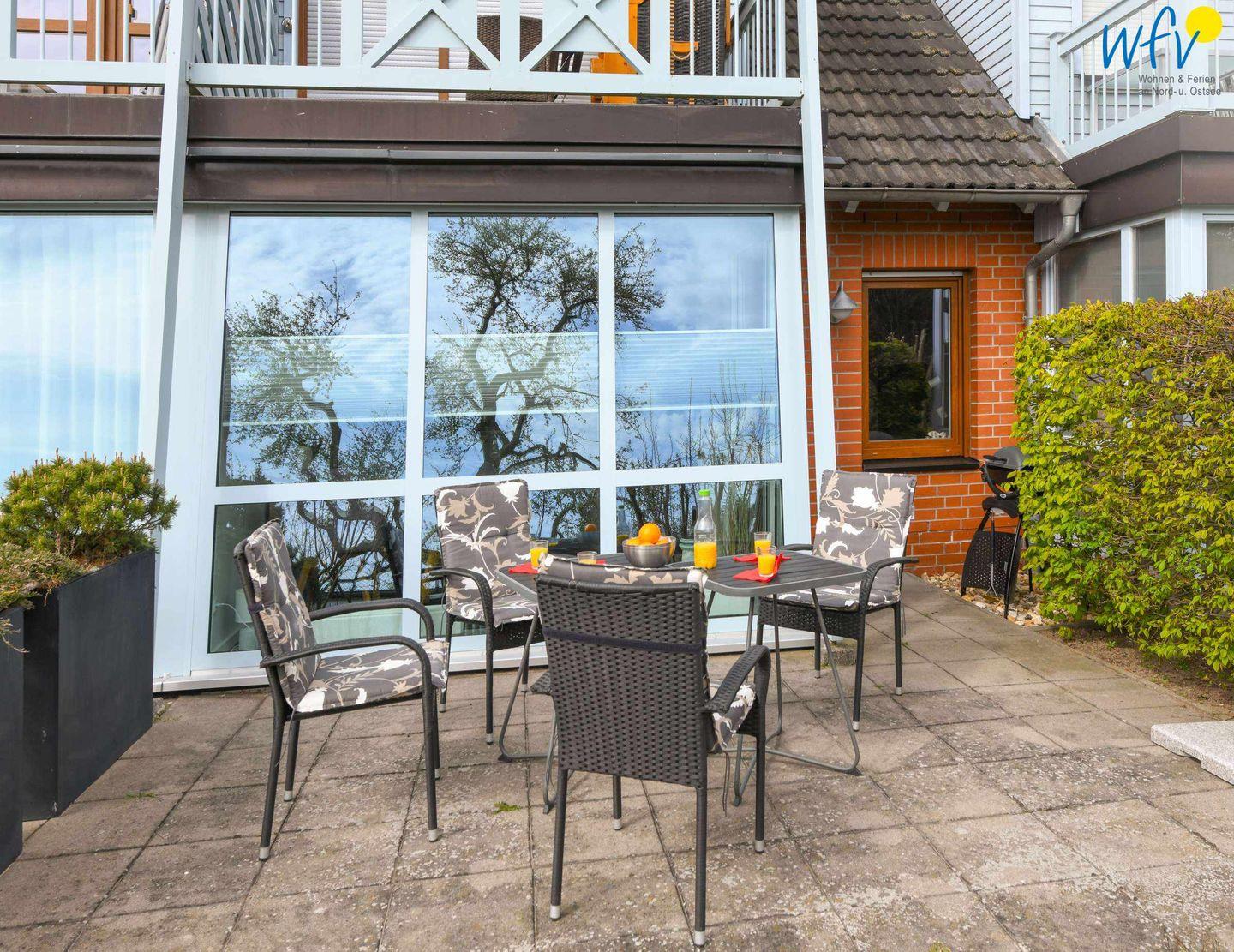 Vom Wintergarten aus gelangen Sie auf die möblierte Terrasse der Ferienwohnung! Mit bequemen Balkonmöbeln und wohltuender Ostseeluft ist hier 100% Erholung garantiert! Für Grillabende gibt es auf der wohnungseigenen Terrasse einen Weber Elektrogrill, außerdem im Außenbereich des Hauses einen gemeinschaftlichen Grillplatz mit Sitzbänken. Ihre Kleinen finden Spaß im Sandkasten und auf dem hauseigenen Spielplatz!