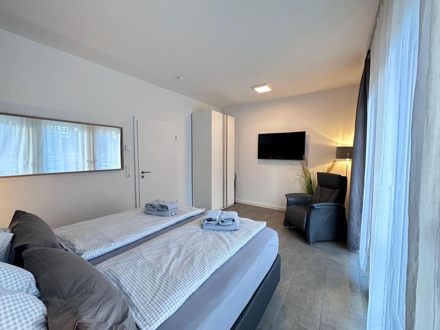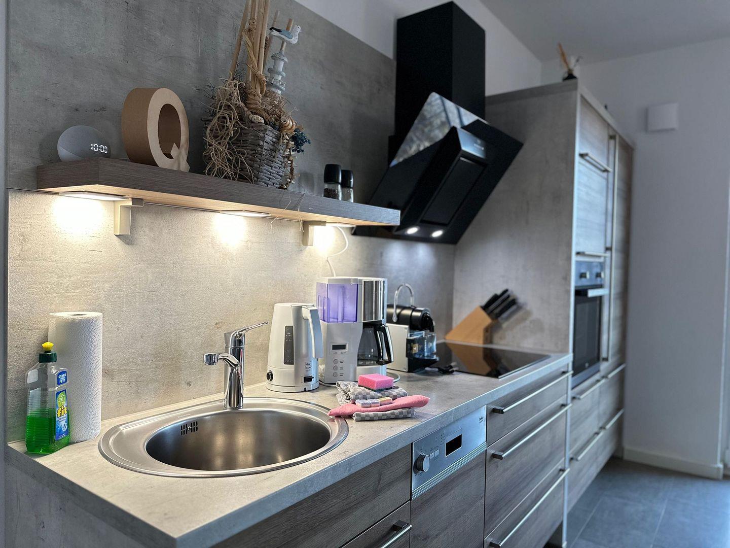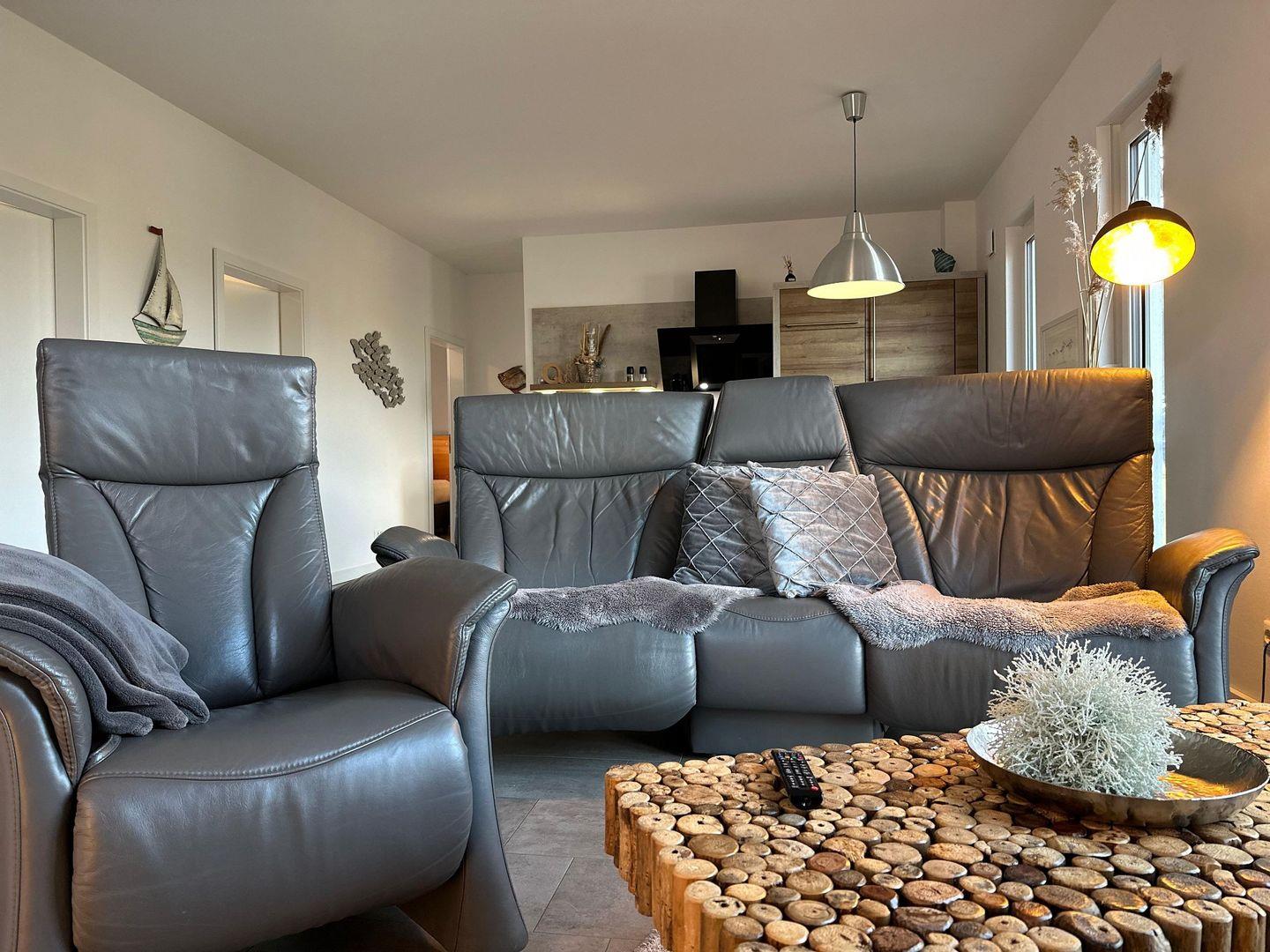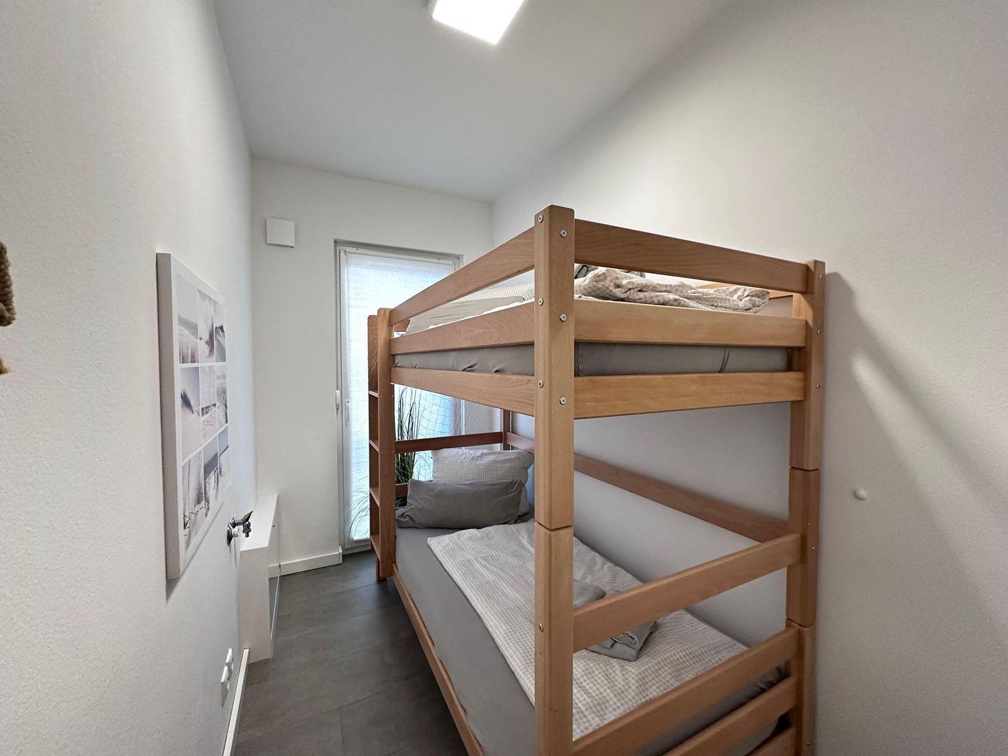 Zur Wohnung gehört eine gepflasterte Terrasse hinter dem Haus mit Windschutz, Grill und Gartenmöbeln, ideal für gemütliche Abende im Freien. Die Wohnung ist nur über eine Außen-Treppe am Haus erreichbar, da diese im Obergeschoss liegt. In der vollausgestatteten Küchenzeile mit Ceranfeld, Geschirrspülmaschine, Backofen, Kühlschrank (mit Gefrierfach), Dunstabzugshaube, Mikrowelle, Wasserkocher, Kaffeemaschine und Toaster finden Sie alles, was Sie für die Zubereitung köstlicher Mahlzeiten benötigen. Das Badezimmer ist mit einer Dusche, einem Waschtisch, einem Handtuchtrockner, einem Fön und einem WC ausgestattet. Zwei Schlafzimmer mit TV, Kleiderschrank und großem Boxspringbett sorgen für erholsame Nächte und sind verdunkelbar. Das 3. Schlafzimmer verfügt über ein Doppelstockbett.