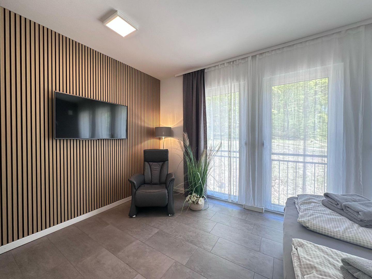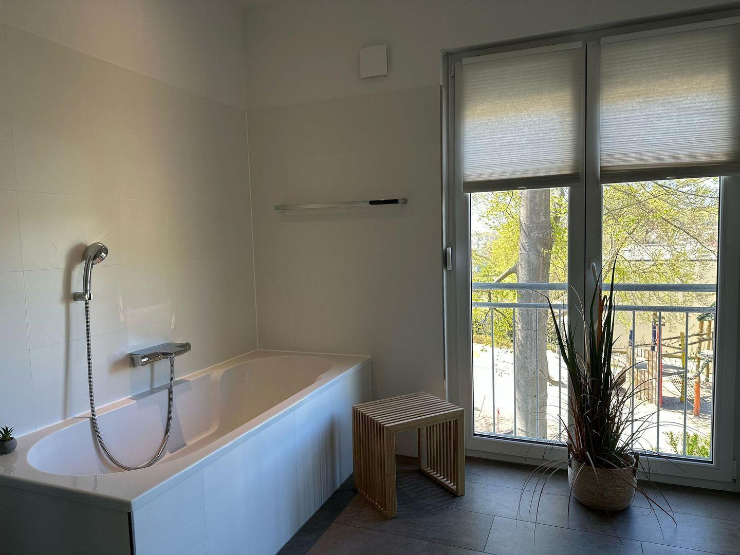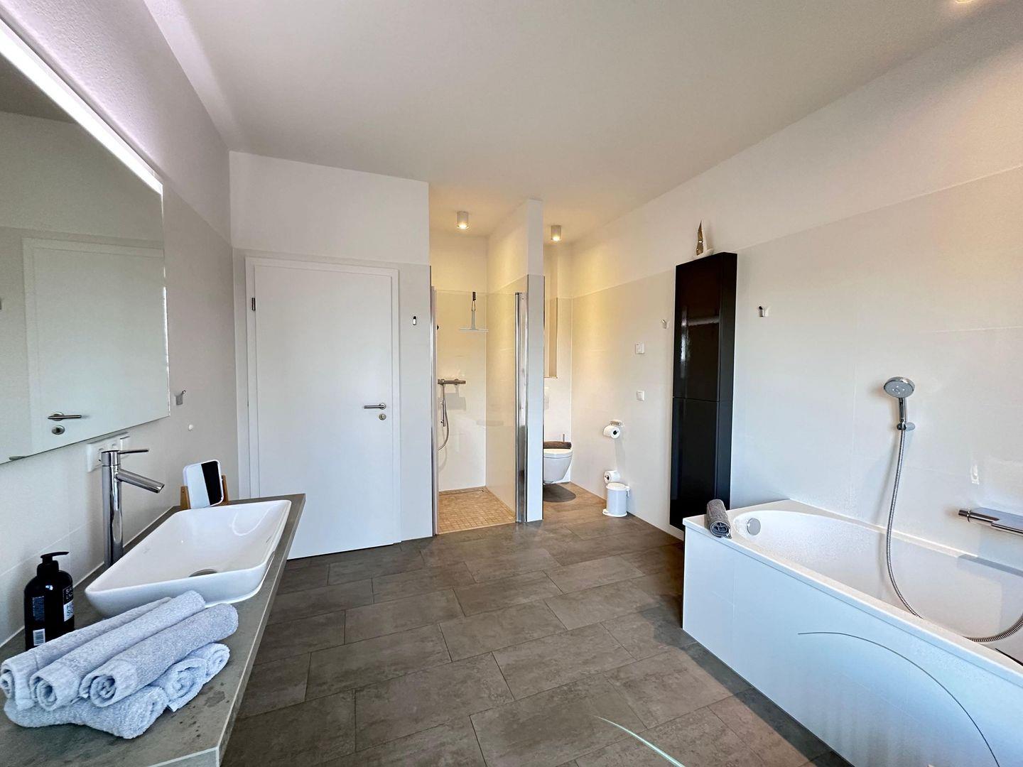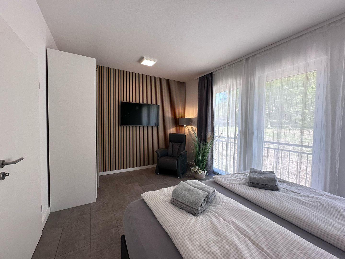 Zur Wohnung gehört eine gepflasterte Terrasse hinter dem Haus mit Windschutz, Grill und Gartenmöbeln, ideal für gemütliche Abende im Freien. Die Wohnung ist nur über eine Außen-Treppe am Haus erreichbar, da diese im Obergeschoss liegt. In der vollausgestatteten Küchenzeile mit Ceranfeld, Geschirrspülmaschine, Backofen, Kühlschrank (mit Gefrierfach), Dunstabzugshaube, Mikrowelle, Wasserkocher, Kaffeemaschine und Toaster finden Sie alles, was Sie für die Zubereitung köstlicher Mahlzeiten benötigen. Das Badezimmer ist mit einer Dusche, einem Waschtisch, einem Handtuchtrockner, einem Fön und einem WC ausgestattet. Zwei Schlafzimmer mit TV, Kleiderschrank und großem Boxspringbett sorgen für erholsame Nächte und sind verdunkelbar. Das 3. Schlafzimmer verfügt über ein Doppelstockbett.