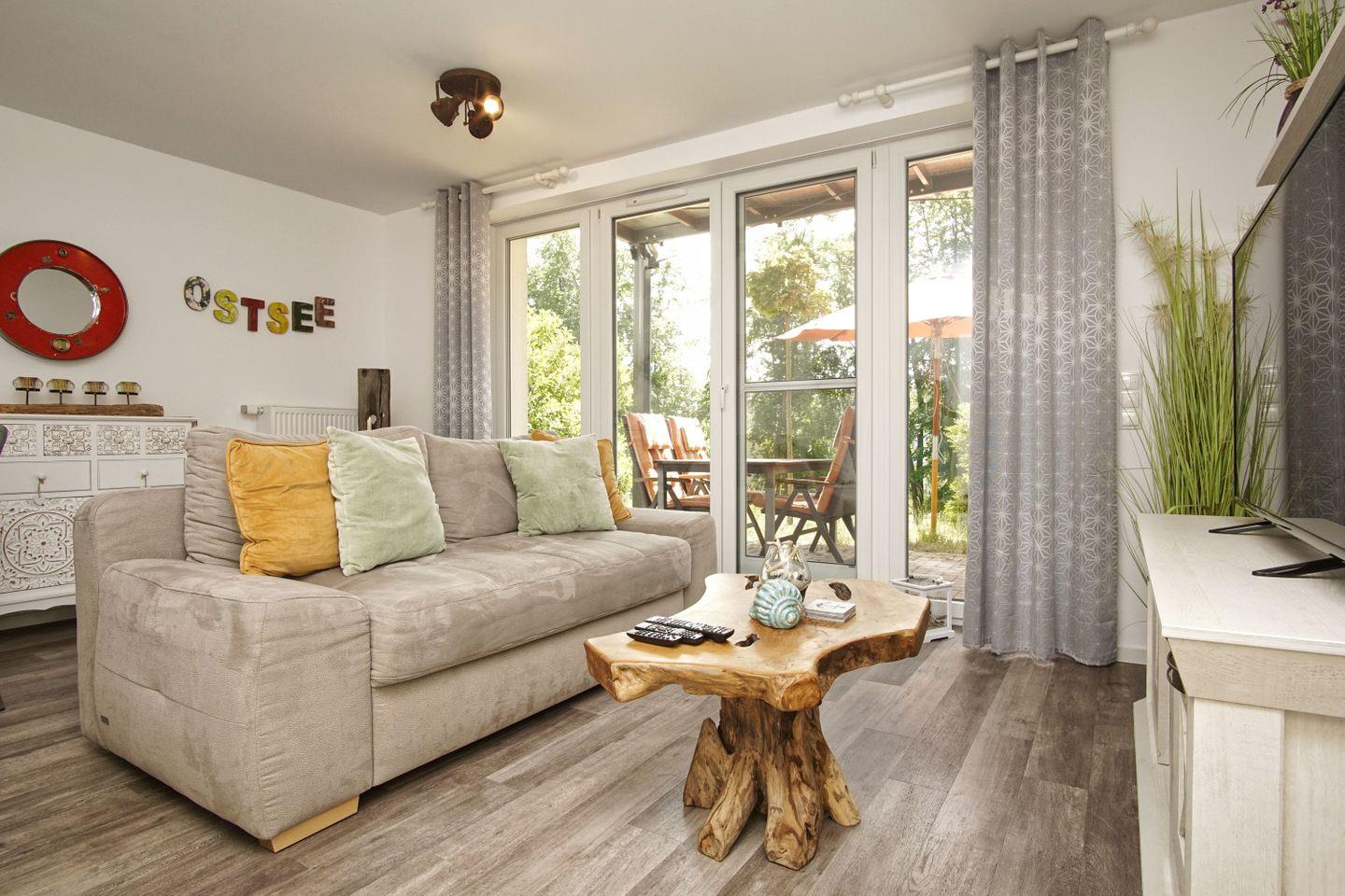 WOHNEN // Wohnraum mit Essbereich, Sitzgarnitur mit bequemer Couch, Sessel, Smart-TV, DVD-Player, Terrasse ++