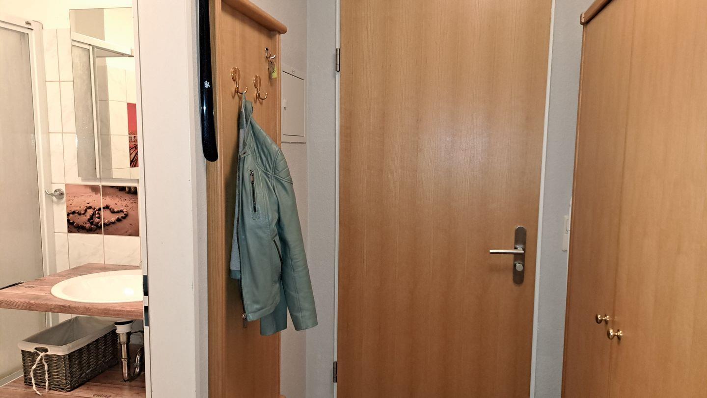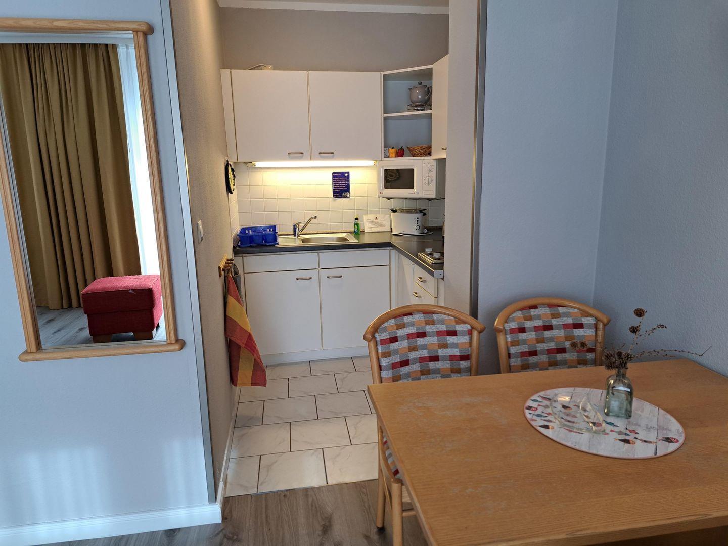 Die Wohnung umfasst einen Essbereich, ein Wohnzimmer mit Flachbild-TV und ein Badezimmer. Die warmen, heimeligen Innenräume schaffen eine gemütliche Atmosphäre.