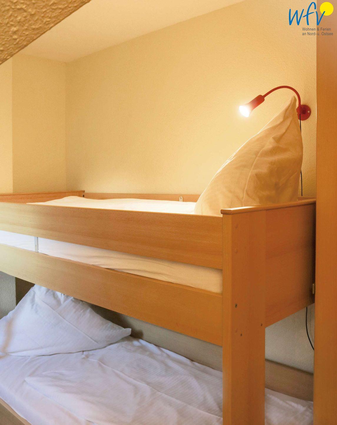 Auf der oberen Ebene der Ferienwohnung gelangen Sie über die Galerie in das separate Schlafzimmer mit Doppelbett sowie in ein weiteres separates Schlafzimmer mit Etagenbett. Im Letzteren fühlen sich besonders unsere kleinen Gäste wohl. Alternativ kann auch die Couch im Wohnzimmer als Schlafsofa genutzt werden.