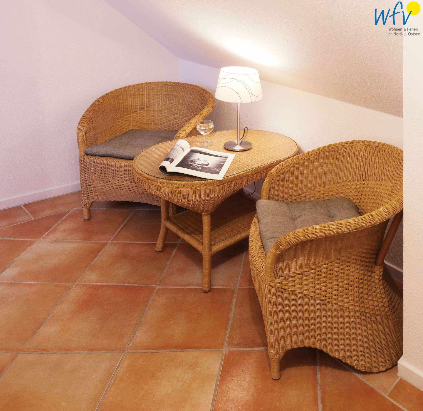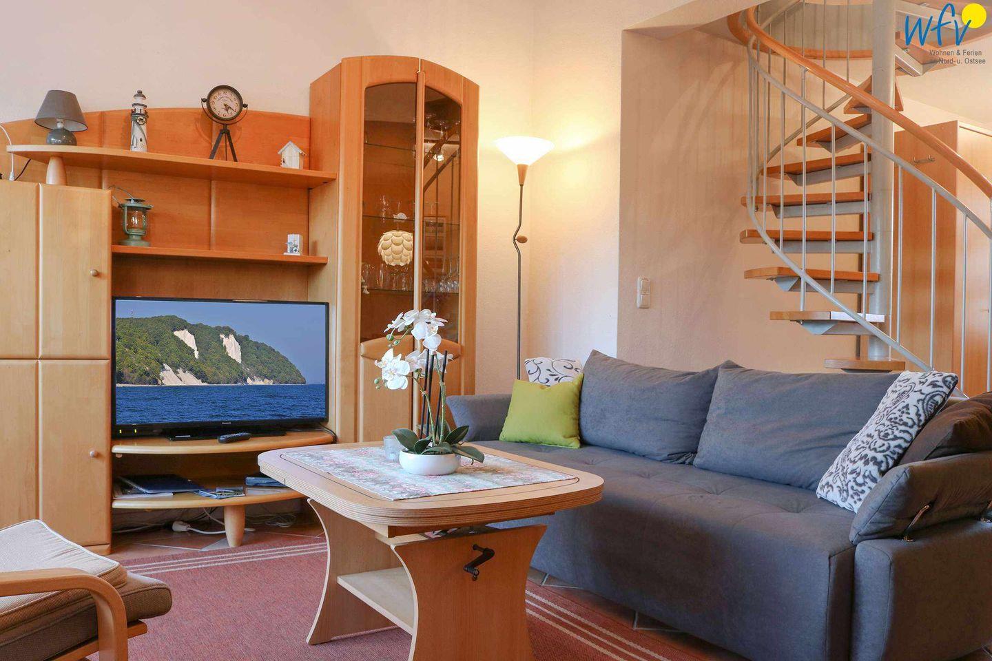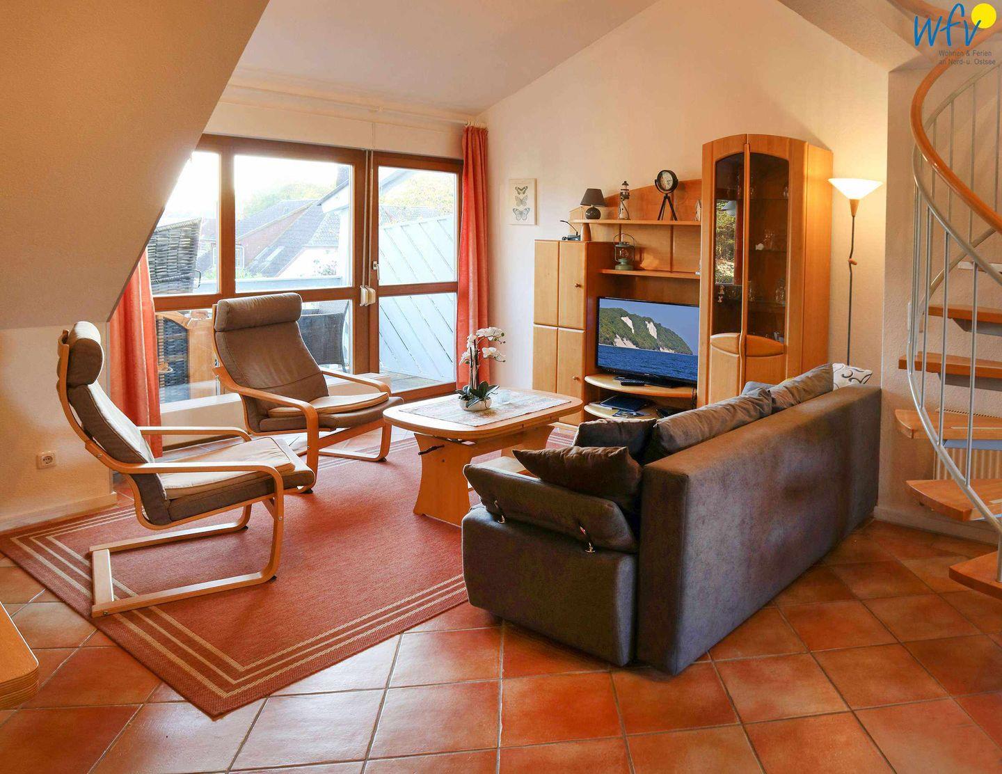 Ein schöner Lichteinfall, stilvolles Mobiliar und ein sonniger Balkon machen die Rügener Ferienwohnung zu einem Wohlfühlort für entspannte Urlaubstage. Für gemütliche Lesenachmittage und gemeinsame Stunden am Abend ist der Wohnraum mit einer Couch, Relaxsesseln, einem TV mit DVD- (Blu-ray)-Player sowie einer Stereoanlage eingerichtet. Auch freies WLAN empfangen Sie selbstverständlich kostenfrei.