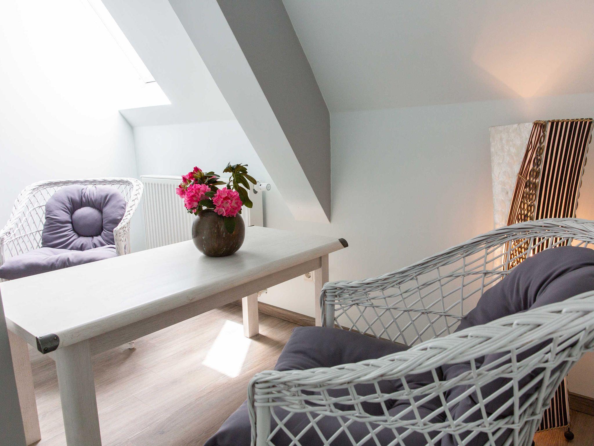 • Im Aussenbereich finden die Gäste einen Spielplatz, Sitzmöglichenkeiten zum Erholen und Entspannen und Fahrradunterstellmöglichkeiten, eine Gemeinschaftsküche, ein Aufenthaltsraum sowie eine barrierefreie Dusche und WC sind vorhanden. Im Hauptgebäude befinden sich sechs Zimmer. Die Zimmer haben einen direkten Zugang über eine Treppe im Innenbereich des Gebäudes. Jedes Zimmer hat ein eigenes Bad mit DU/WC, direkt gegenüberliegend. Im Objekt gibt es eine Gemeinschaftssauna (buchbar vor Ort gegen Aufpreis). Im Zimmer sieben ist das Bad über eine Außentreppe erreichbar.