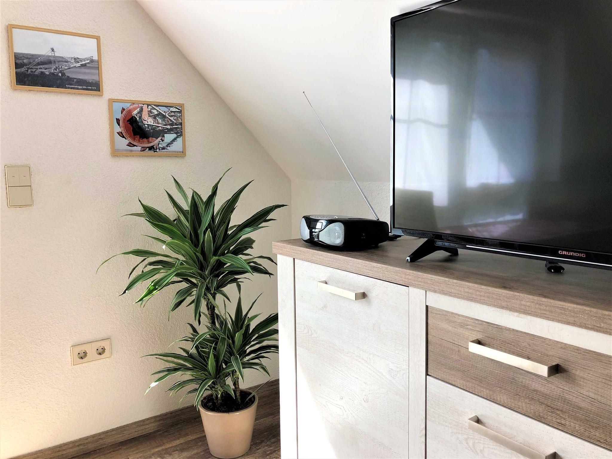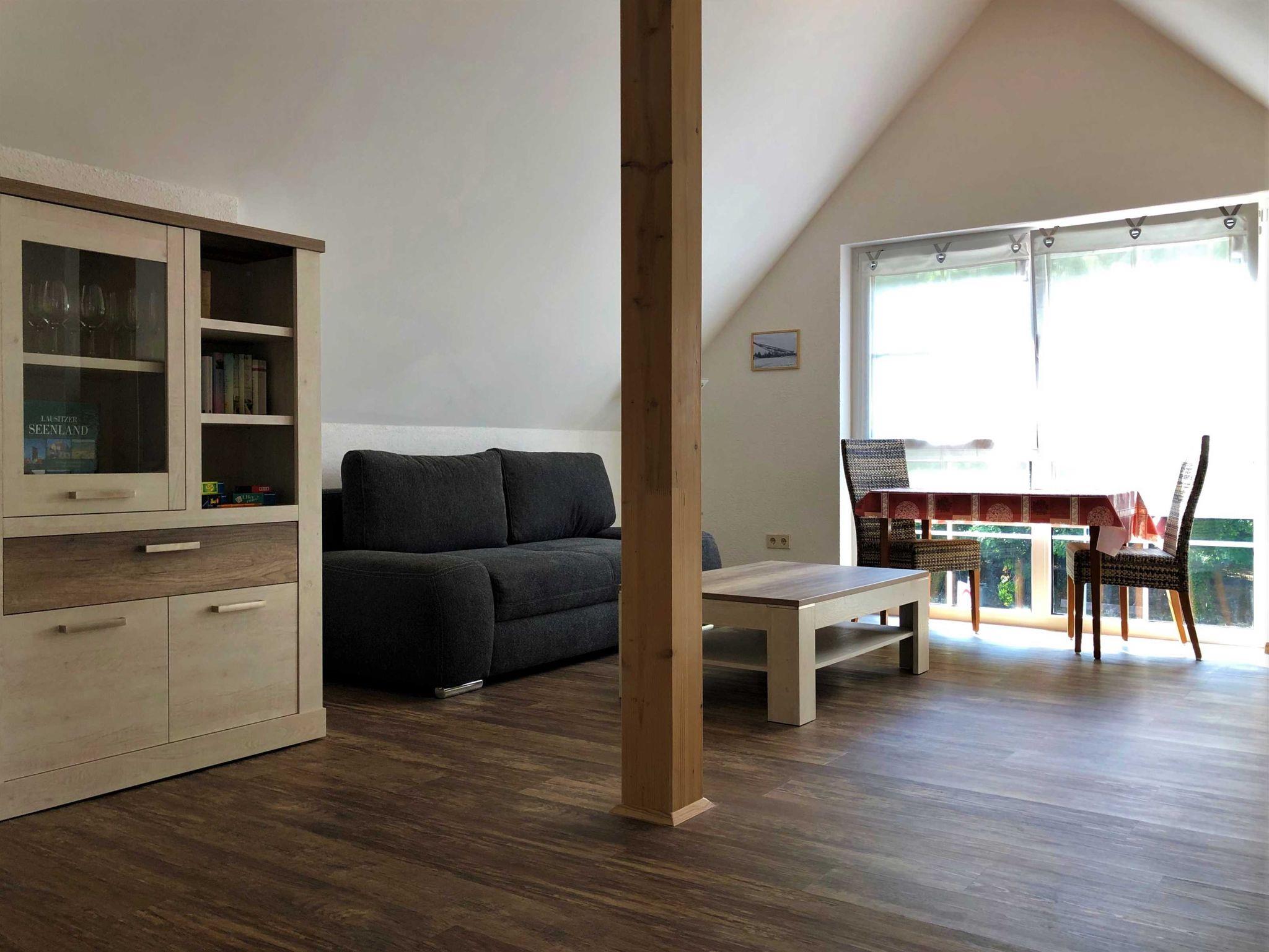 In der Ferienwohnung findet der Gast einen separaten Schlafraum, 1 kombinierten Wohn - Schlafraum mit TV, 1 Küche (komplett ausgestattet mit Backofen, Elektoherd, Geschirrspüler und Kühlschrank sowie Kaffemaschine, Wasserkocher und Toaster), die offen zum Wohnraum ist und ein Bad mit Badewanne und DU/WC.