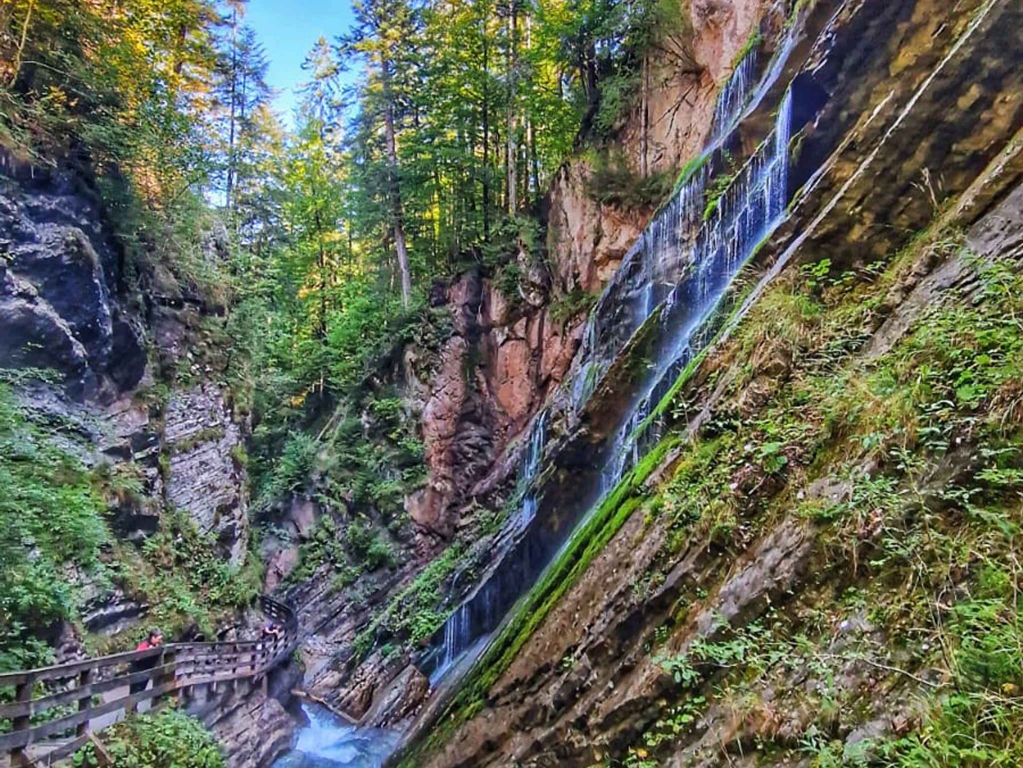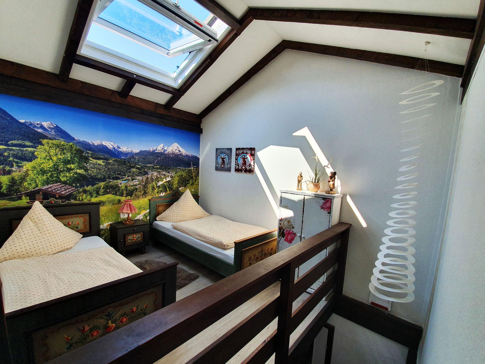 Die Ferienwohnung besitzt einen Wohnraum (30 m²) mit gemütlicher Couch, einem Esstisch mit vier Stühlen, einer Kochnische mit Kühlschrank/Gefrierfach, Spülmaschine, einem 2er Induktionskochfeld und diversen Küchengeräten (Thermomix TM5, Kaffeefilter- & Kaffeepadmaschine, Milchaufschäumer, Toaster, MINIbackofen, Mikrowelle, Eierkocher, Rührgerät, Stabmixer, Wasserkocher). Ein weiterer Esstisch befindet sich auf dem unteren Balkon. Von einer kleinen Diele mit Garderobe gelangen Sie zum Badezimmer mit einer Waschmaschine, Dusche & WC. Das erste Stockwerk erreichen Sie über eine Raumspartreppe (nicht für ältere Personen oder Menschen mit körperlichen Einschränkungen empfohlen). Die Raumspartreppe wird im Frühjahr 2026 durch eine normale Treppe ersetzt. Auf der offenen Galerie (Kinderzimmer) in der oberen Etage sind zwei Einzelbetten, dahinter finden Sie das weitere Schlafzimmer mit einem Doppelbett und einem Smart TV. Von dem Schlafzimmer kommen Sie zu einem weiteren Balkon mit zwei Relaxsesseln und schönem Blick auf den bekannten Watzmann.