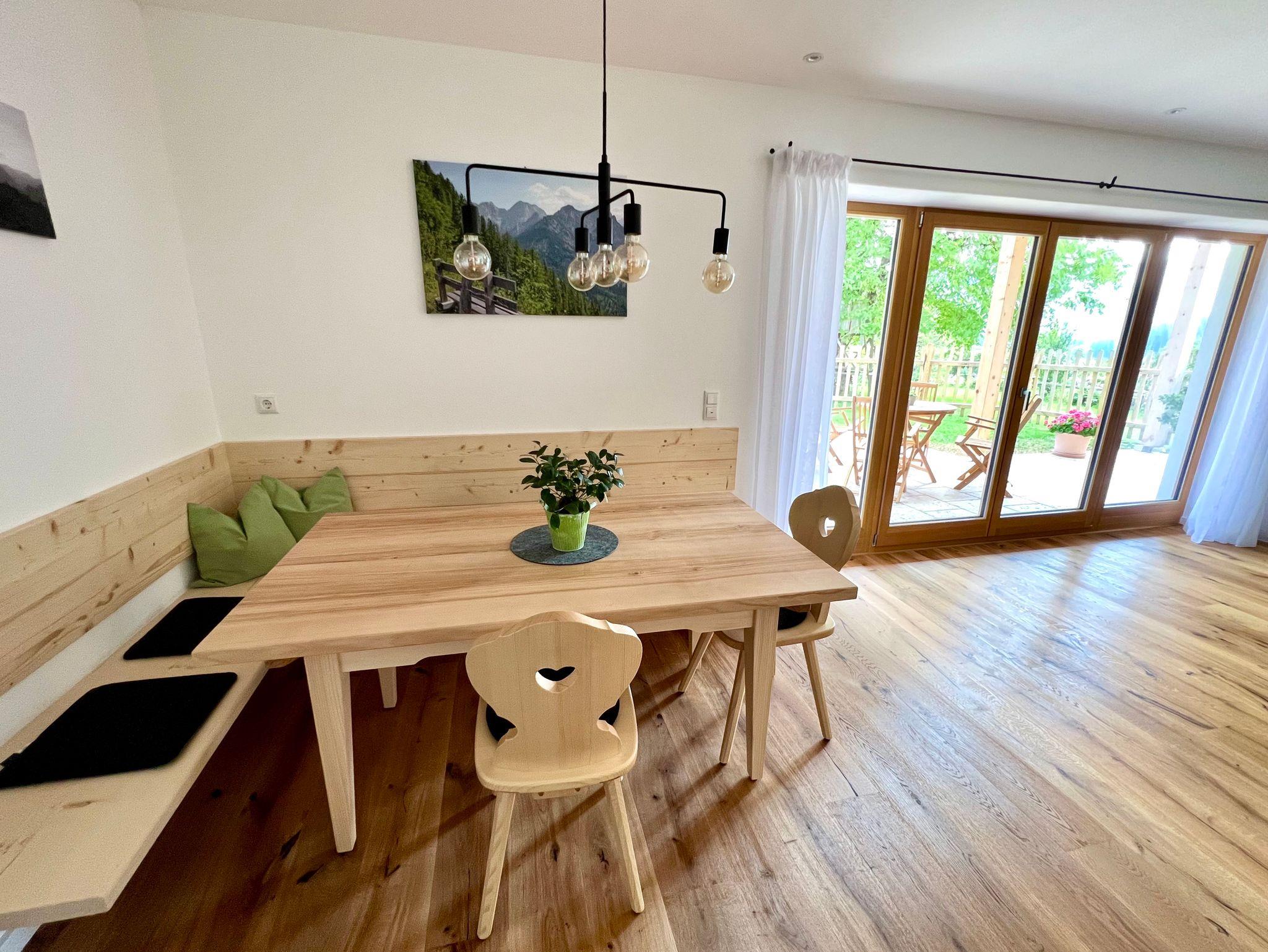 Die Ferienwohnung Rosalie mit 100 m² ist im Erdgeschoß mit einer schönen Terrasse. Sie verfügt über zwei Schlafzimmer mit Zirbenbetten (1 x Doppelbett, 2 x Einzelbetten, Kinderreisebett auf Anfrage), eine vollausgestattete Küche (Kaffeemaschine, Toaster, Wasserkocher, Essig, Öl, gängige Gewürze, Backpapier, Frischhaltefolie, Spülmaschinentabs, Spülmittel, usw.), ein Wohn- und Esszimmer, ein Bad mit Infrarotkabine und ein Waschraum (Waschmaschine, Trockner, Wäscheständer). Im Keller befindet sich noch ein eingerichtetes Regal mit einer Auswahl an Spielen, Kinderbüchern und Spielsachen. Bei der Auswahl der Materialien achteten wir darauf heimische Hölzer zu verwenden (Eiche, Fichte, Lärche, Zirbe). Außerdem bieten wir einen Carport mit 2 Stellplätzen mit Stromanschluss an.