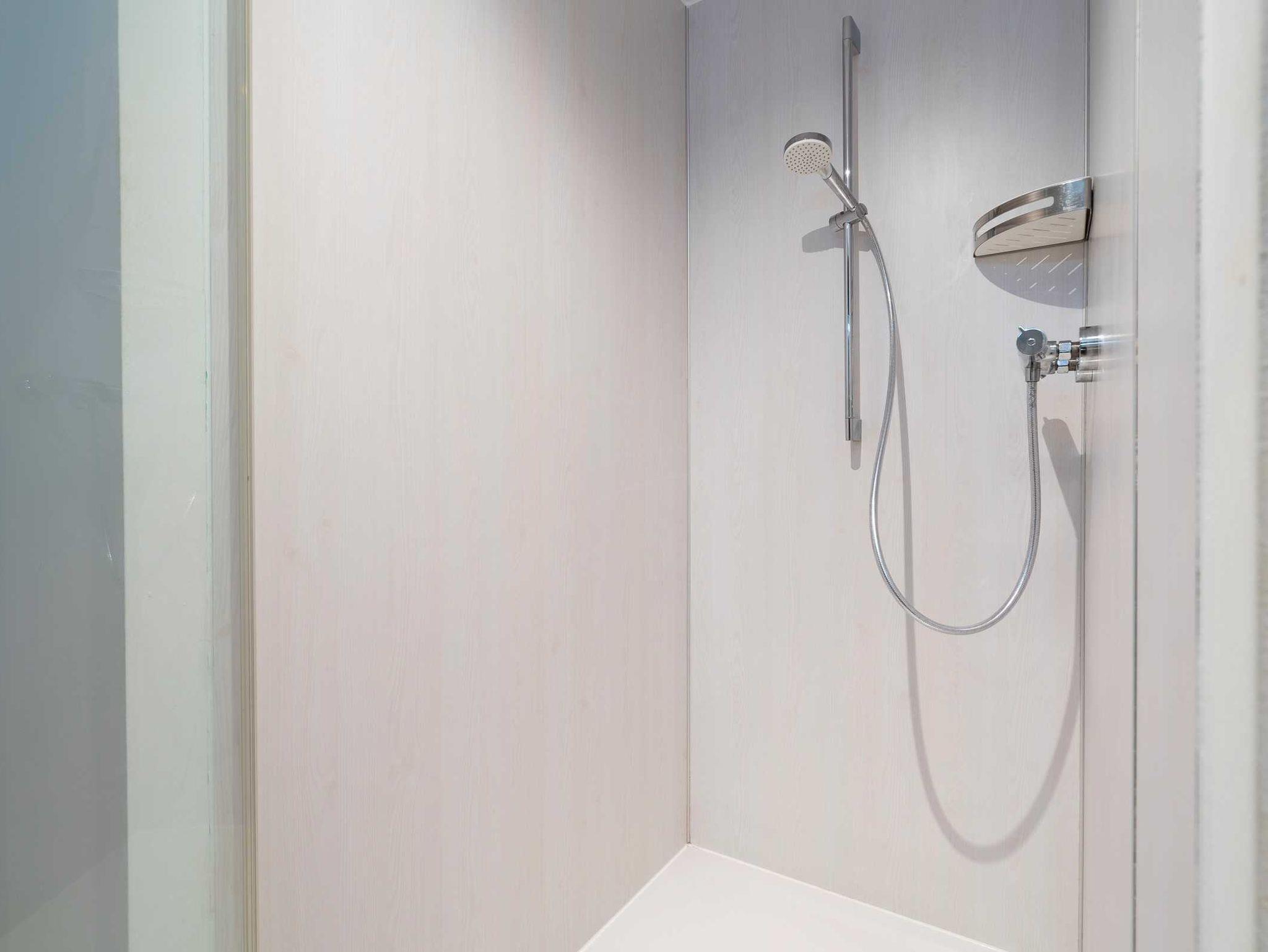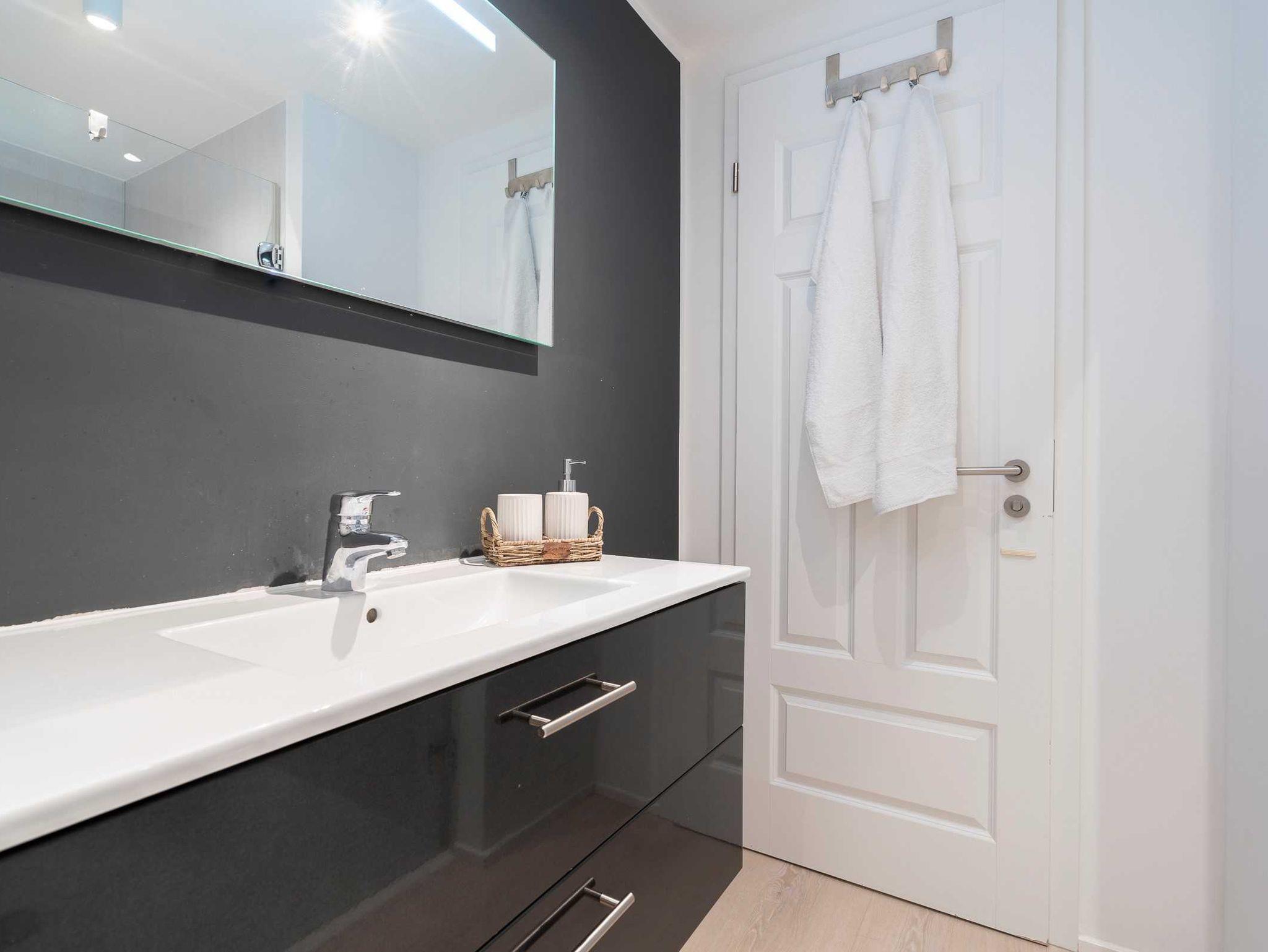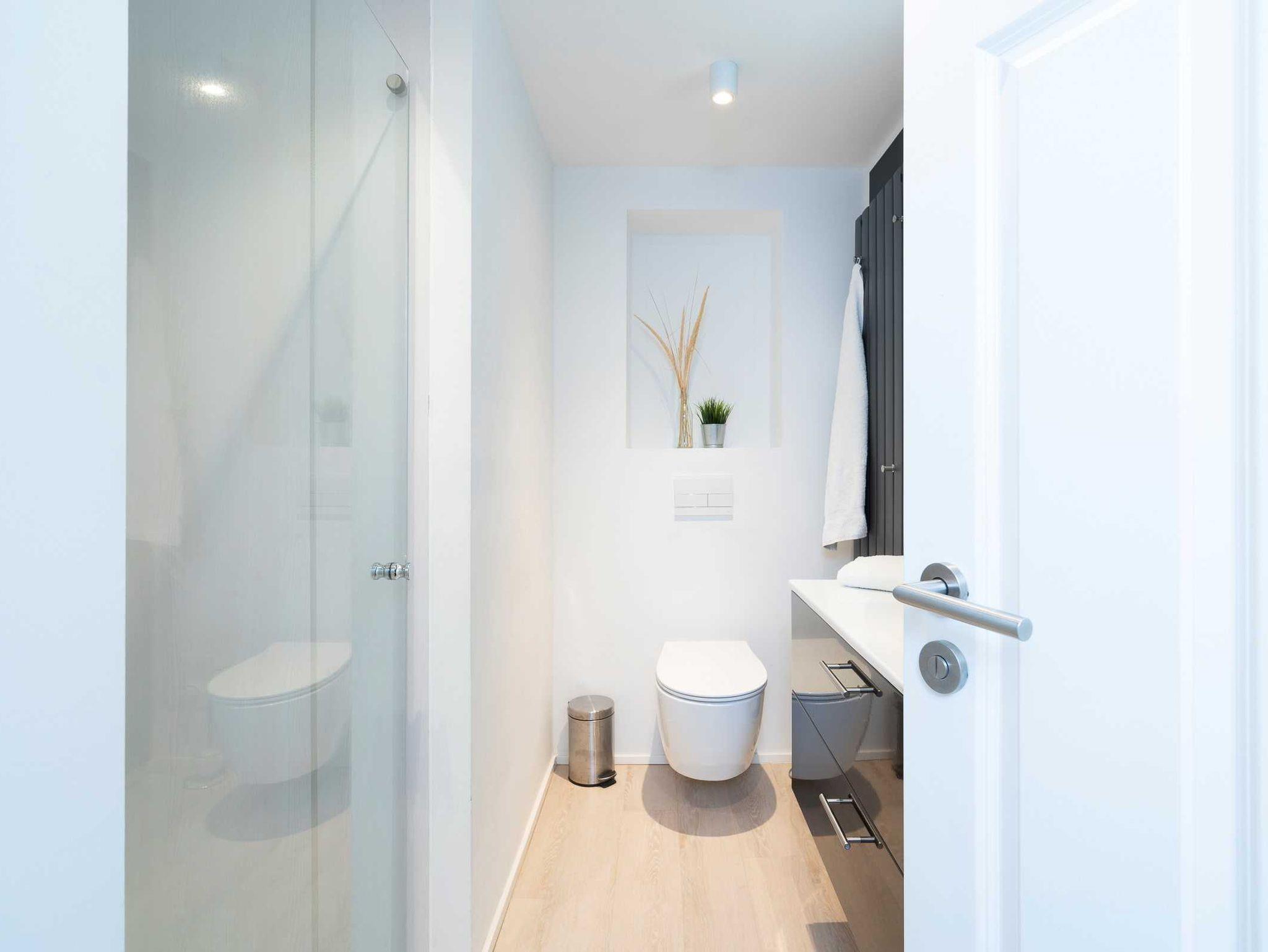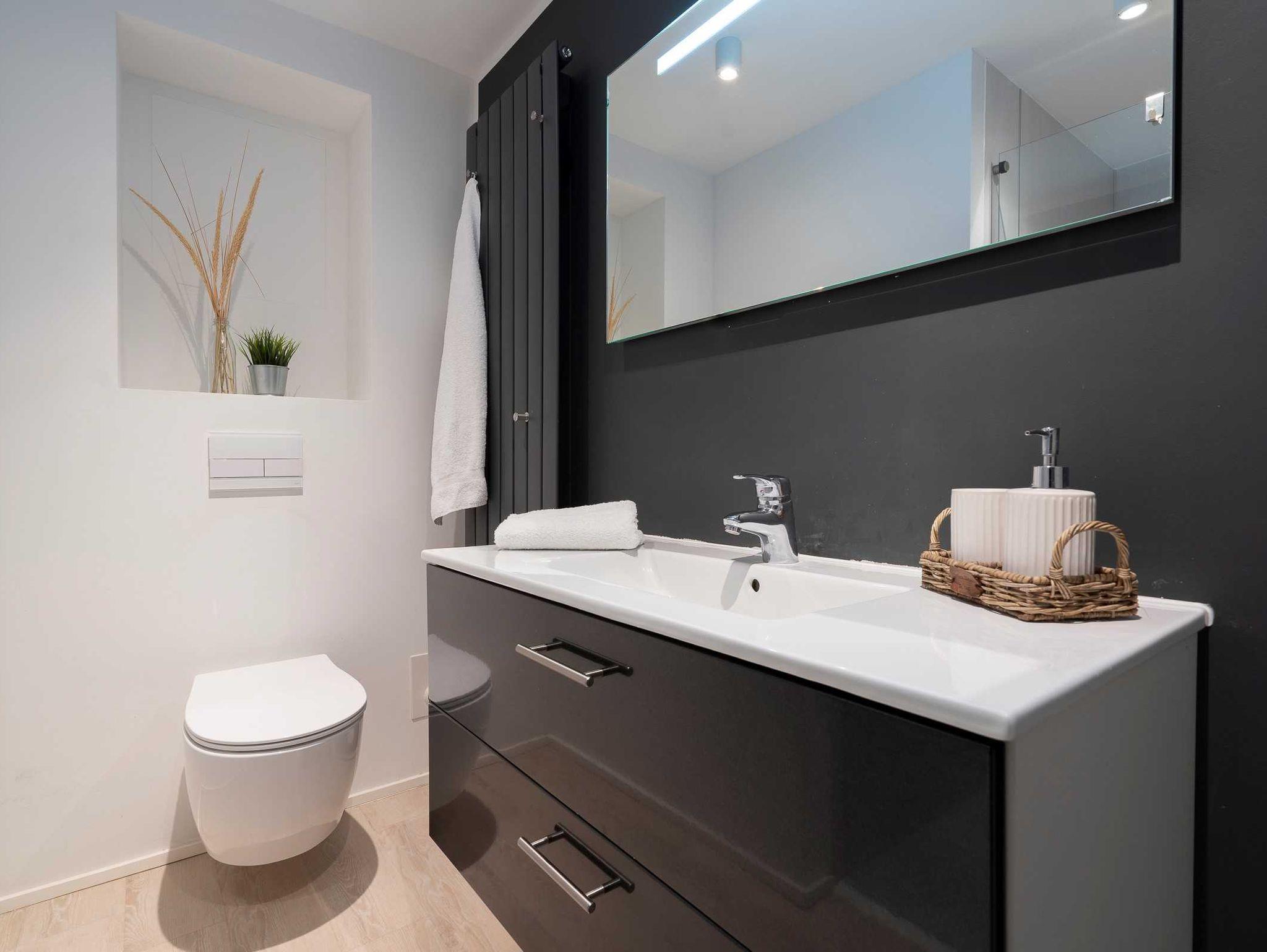 Das Bad ist gefliest. Es hat eine Fußbodenheizung, einen großen Handtuch-Heizkörper, einen Porzellanwaschtisch mit Steckdose und Föhn und eine große bodengleiche Ganzglasduschkabine. Der Boden ist mit grauen Feinsteinzeug gefliest und die Wände sind hell geputzt.