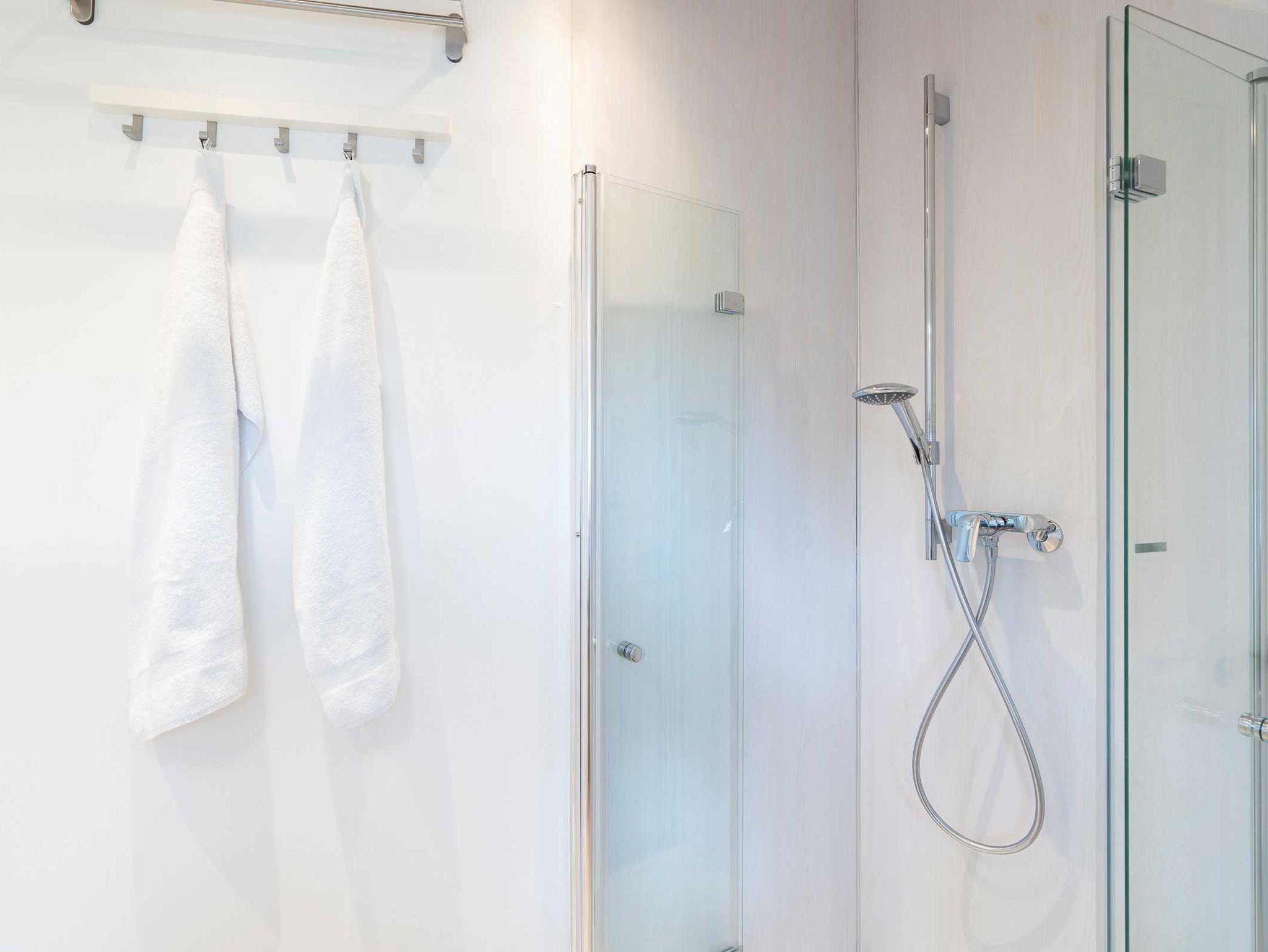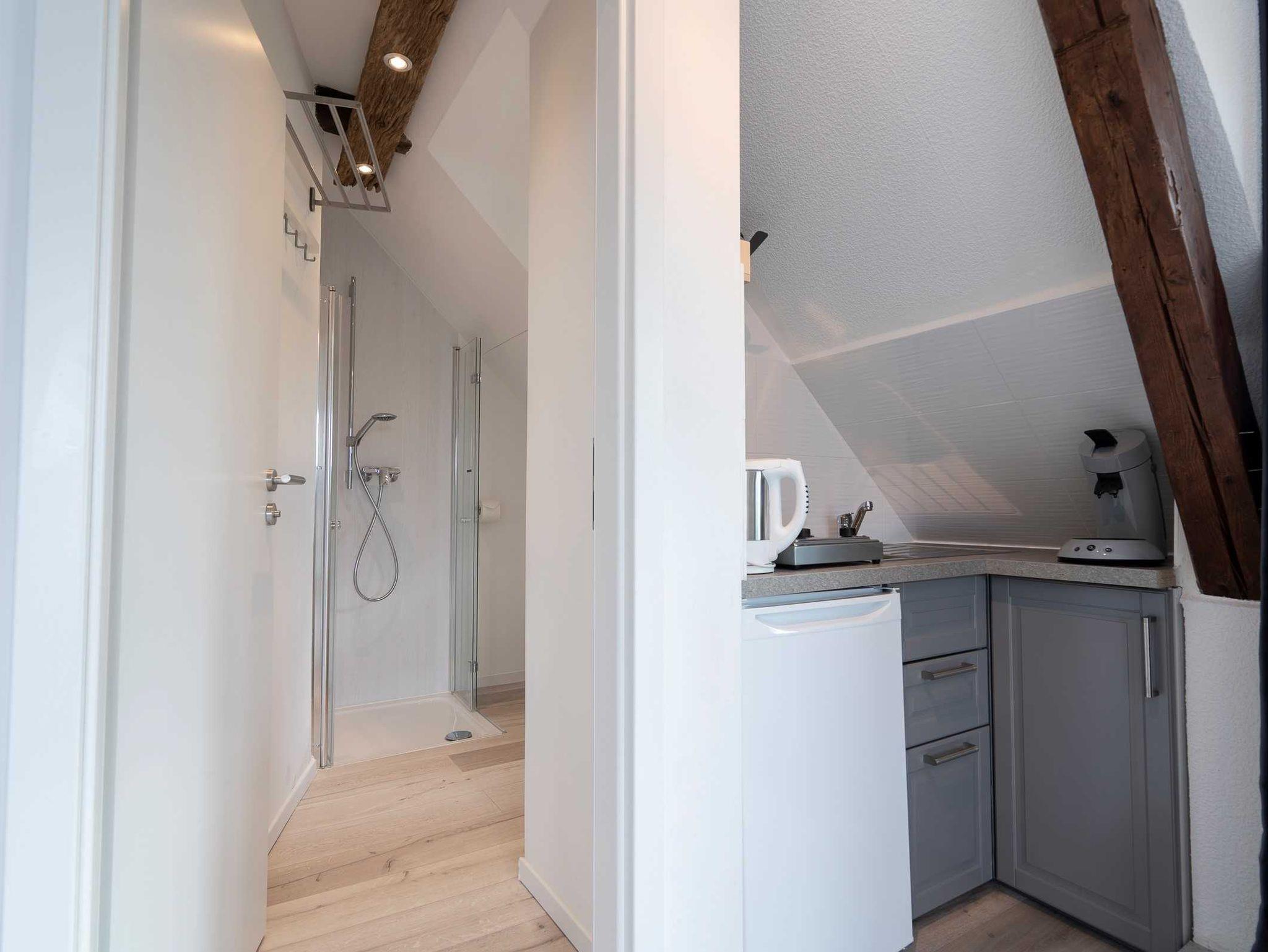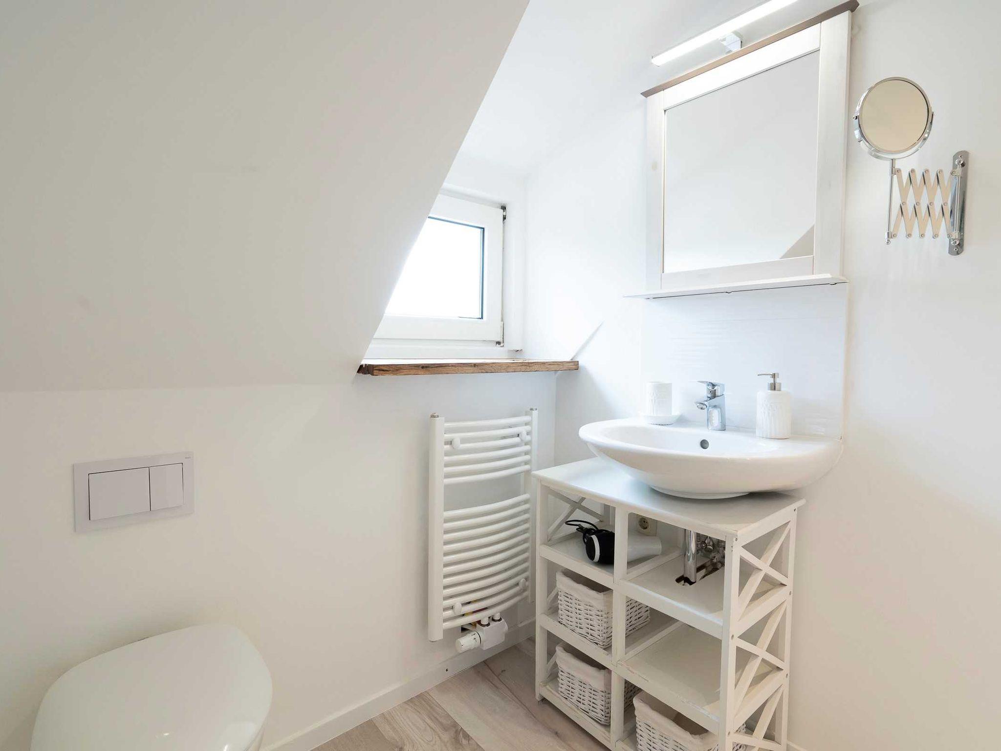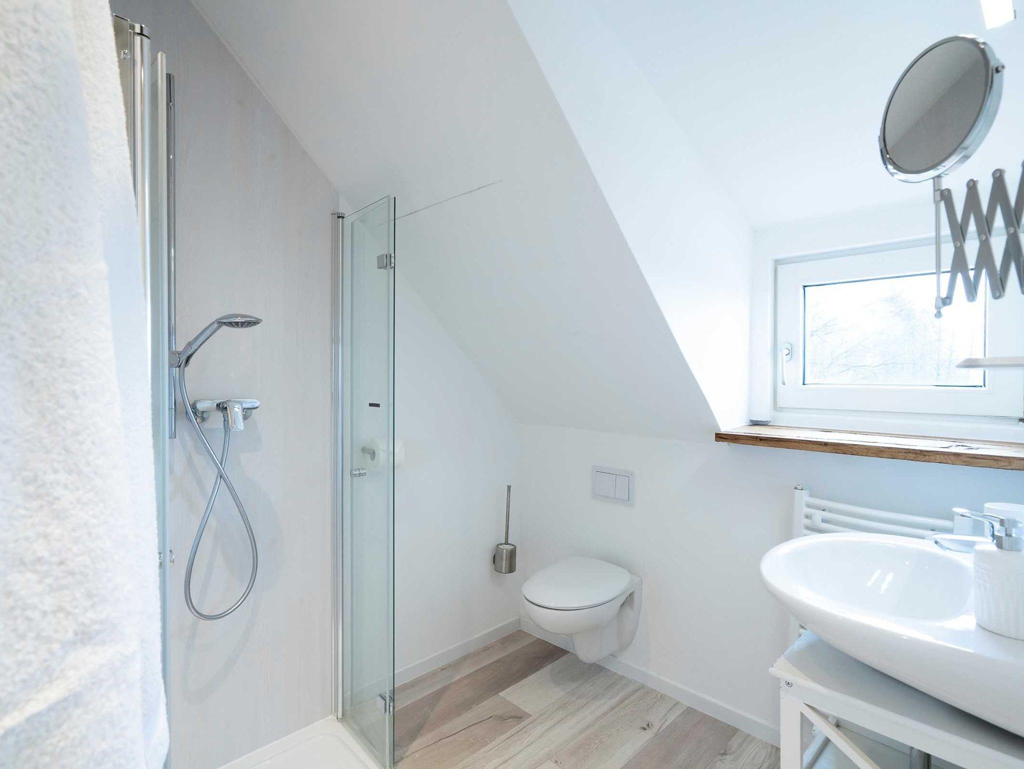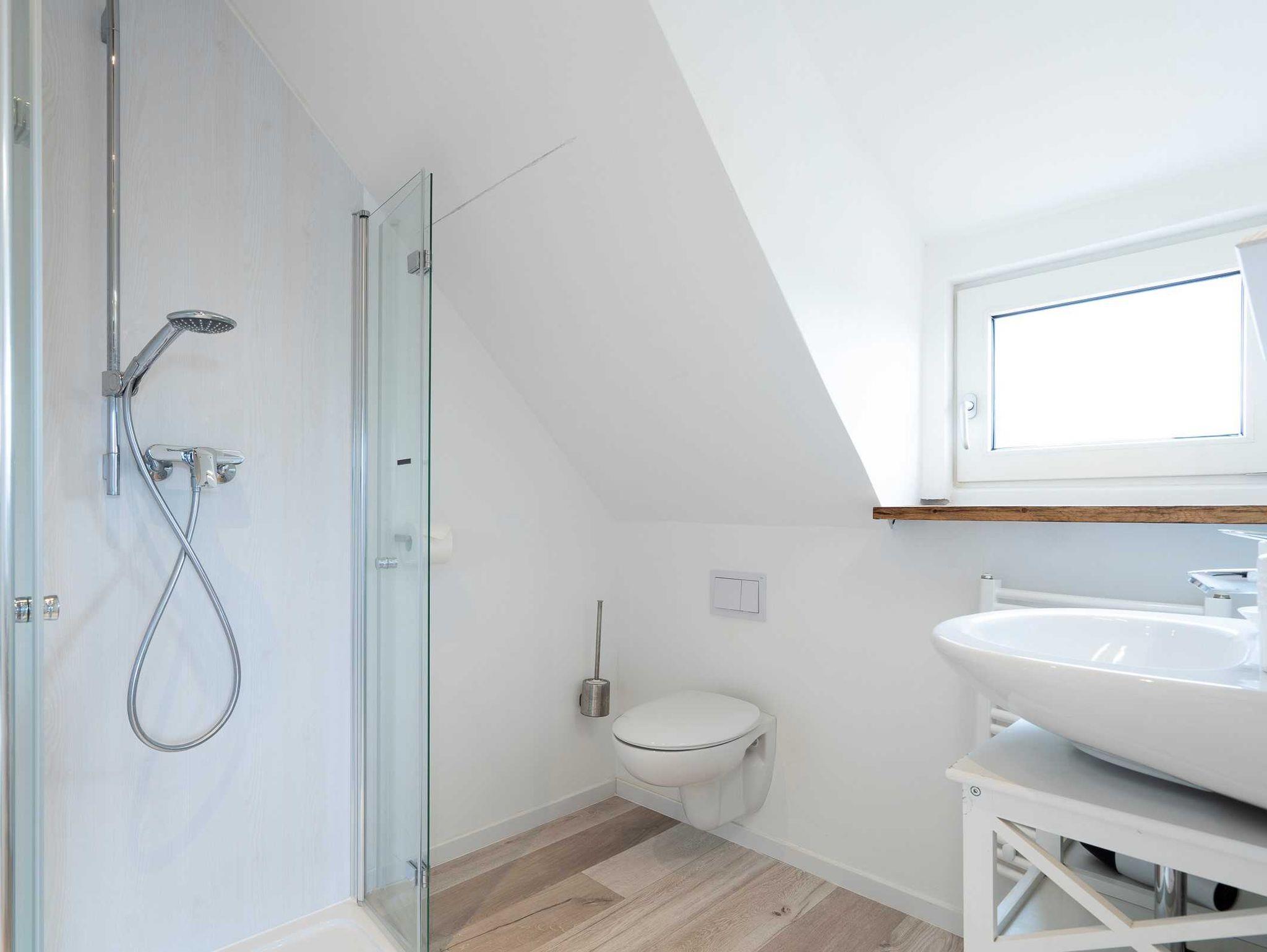 Das Bad ist geschmackvoll in die Dachschräge eingebaut. Es gibt einen Handtuch-Heizkörper und eine Walk-In-Dusche.