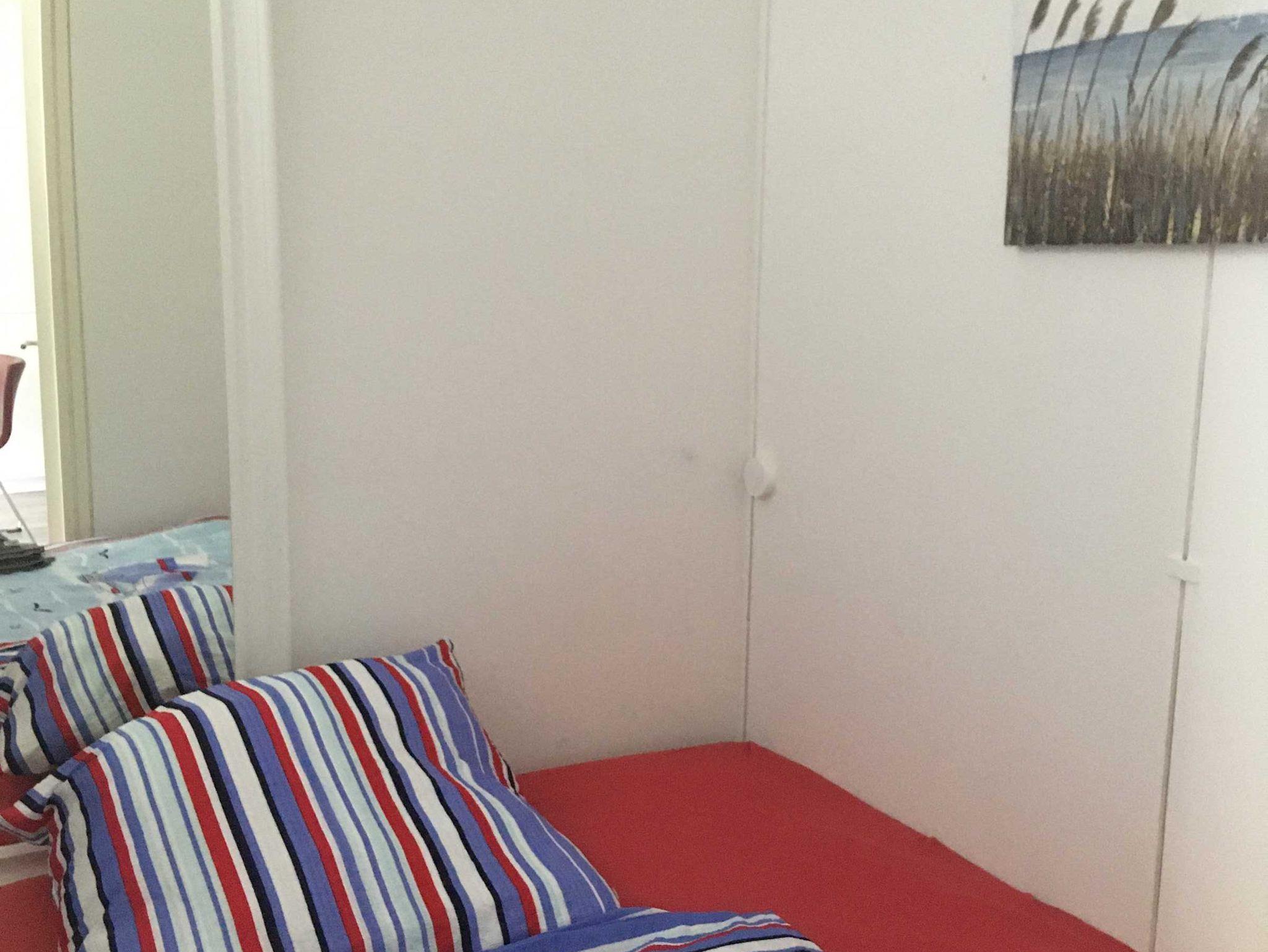Im 3. Zimmer befinden sich eine ausziehbare Couch und ein offener Schrank.