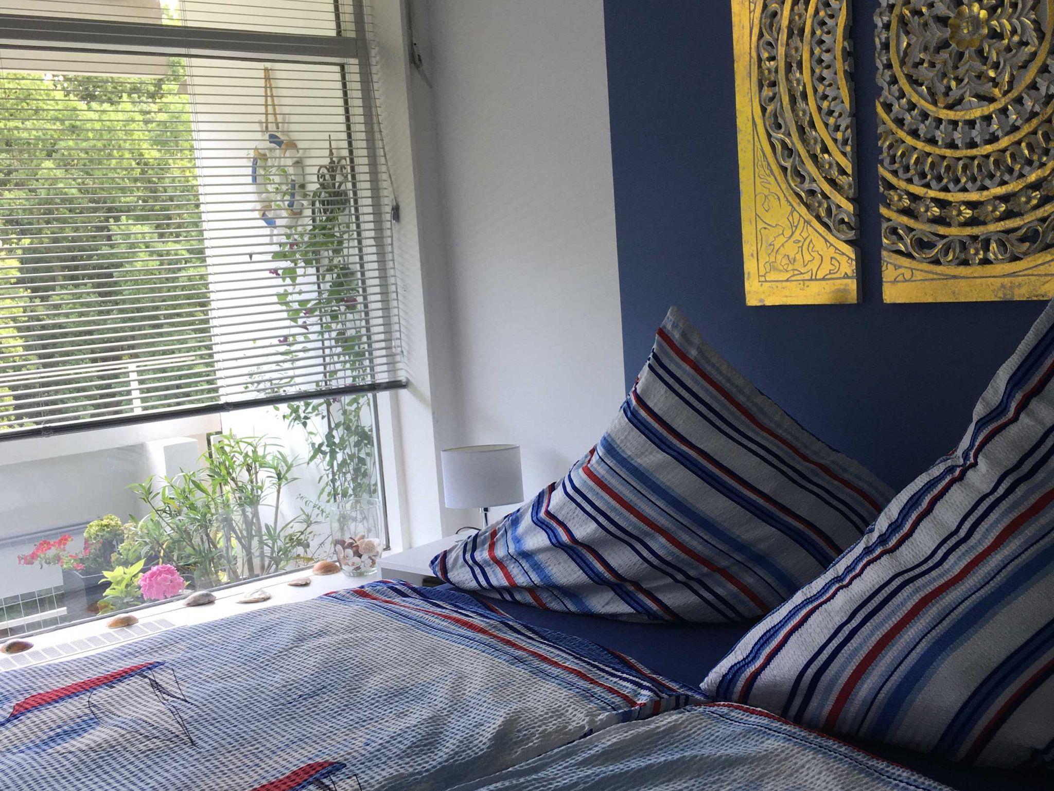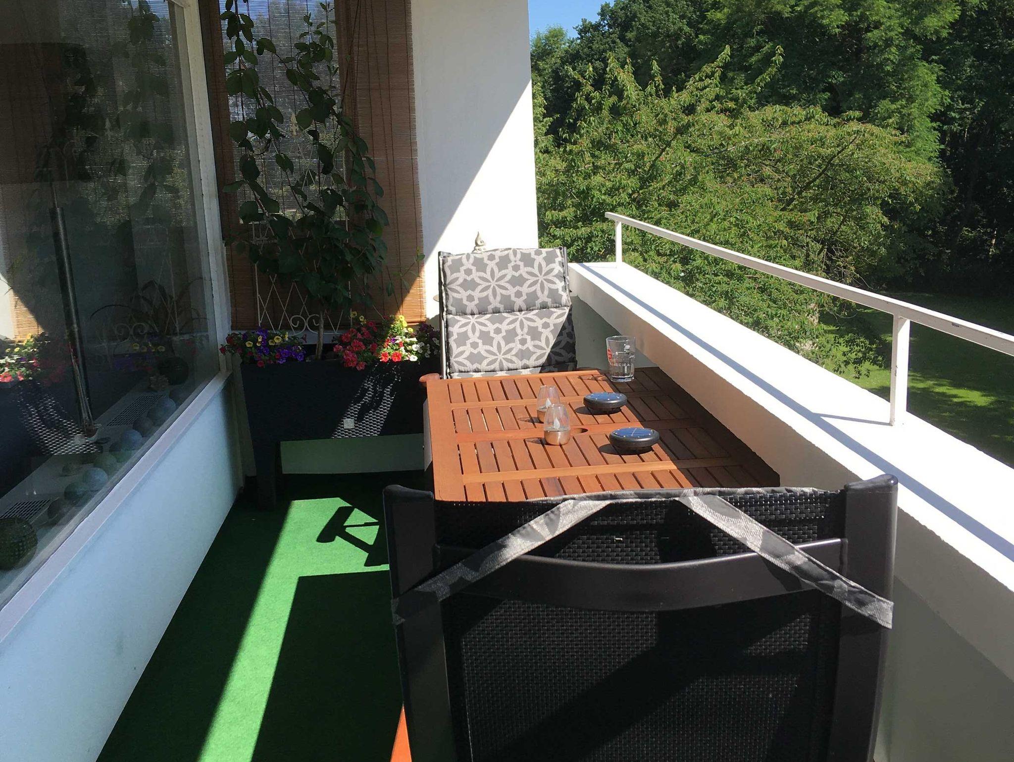 Der großzügige, nach Süd-Ost ausgerichtete und überdachte Balkon (6 x 1,5 m) mit Blick in die gepflegte Gartenanlage und ein angrenzendes Wäldchen, ist mit Hochlehnstühlen und einem großen Tisch ausgestattet. Hier können unsere Gäste beim Frühstück bis 13 Uhr herrlich die Morgensonne genießen; die Wohnung wird somit nicht aufgeheizt und es sind dadurch angenehme Temperaturen in der Wohnung und auf dem Balkon.