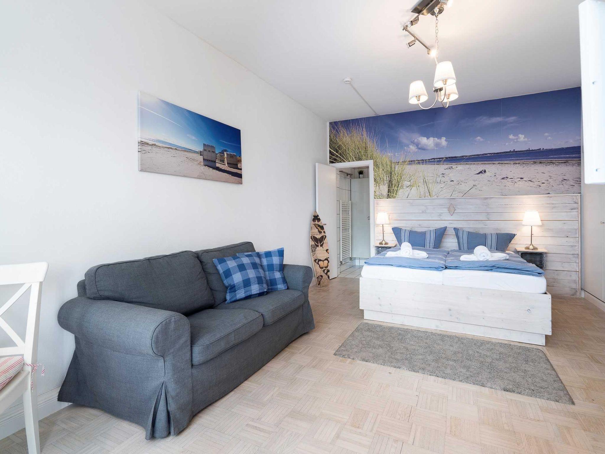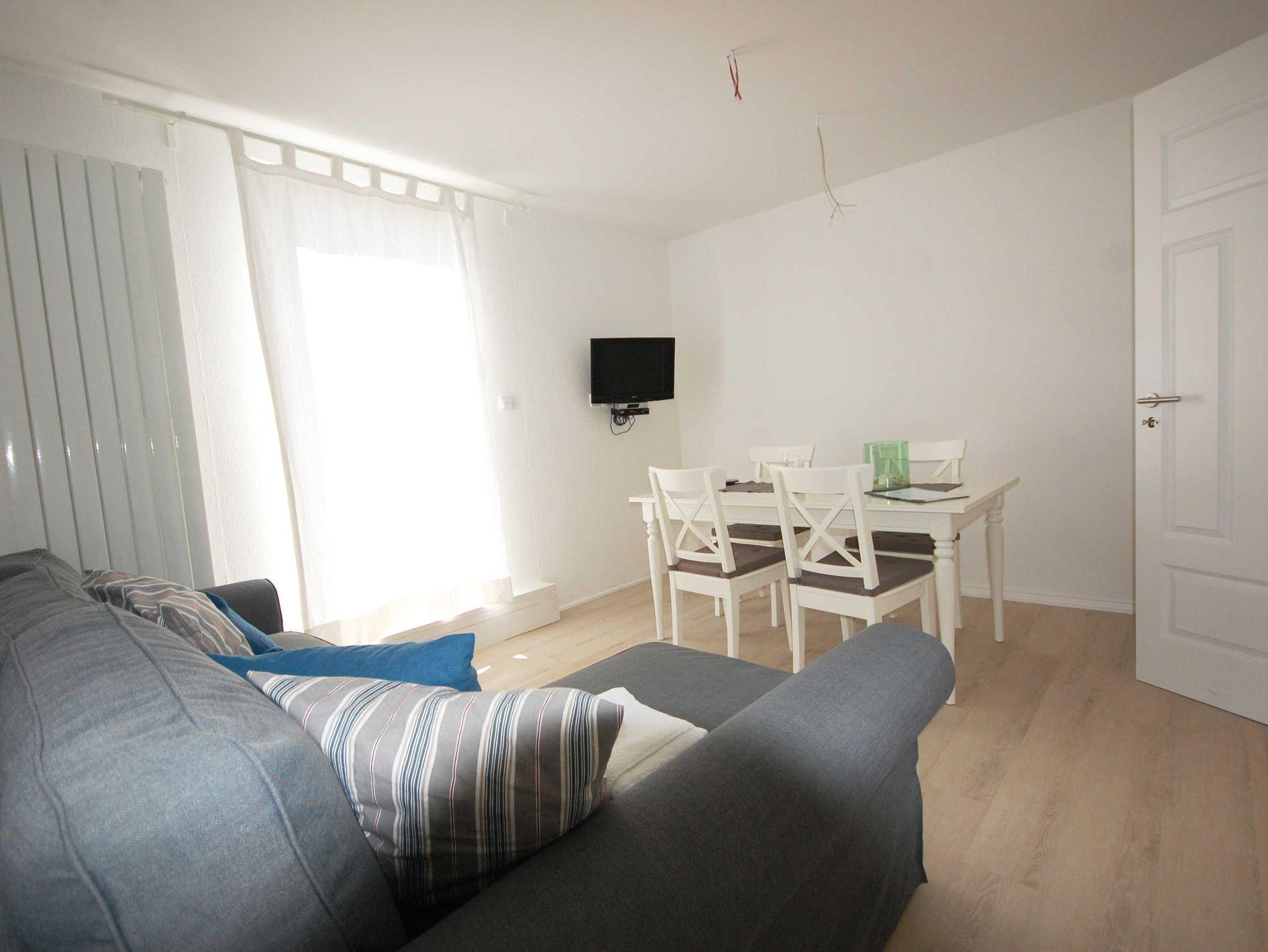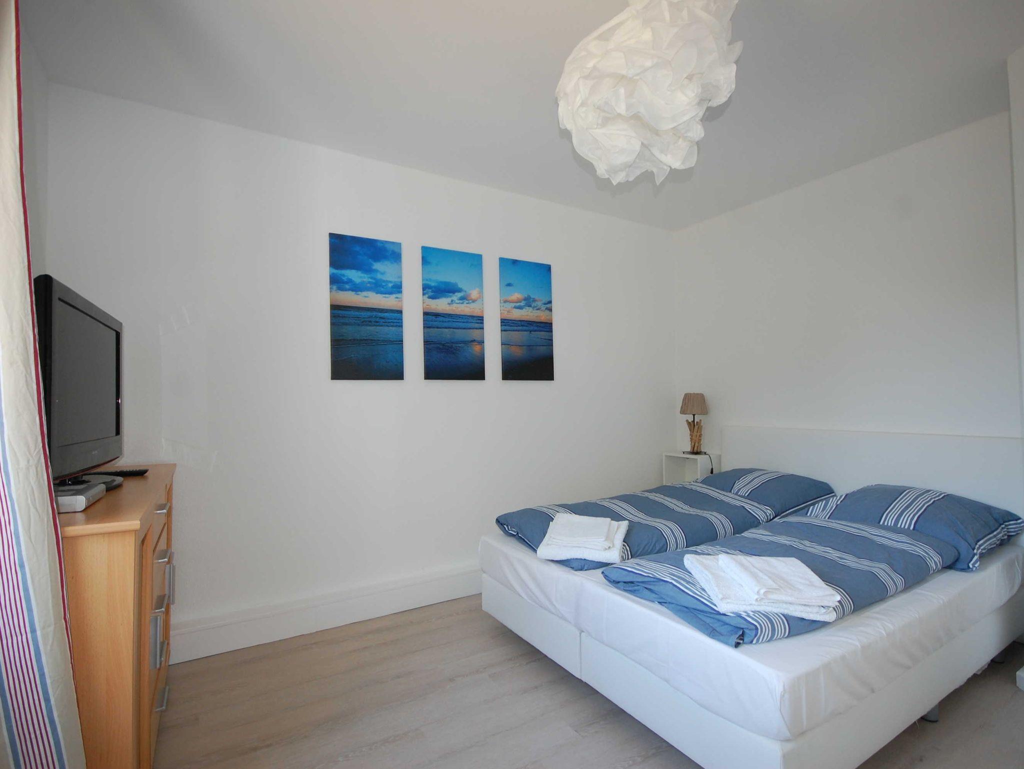 In beiden Schlafzimmern stehen jeweils ein 180-cm-Doppelbett bereit. Das Wohnzimmer ist mit einem Ausziehsofa ausgestattet und bietet zusätzlich einen eigenen Fernseher. Auch in den Schlafzimmern gibt es jeweils TV-Geräte. Am großen Esstisch im westlich ausgerichteten Wohnzimmer finden bis zu 6 Personen bequem Platz. Ein WLAN-Internetradio mit Handyanschluss rundet die Ausstattung ab.