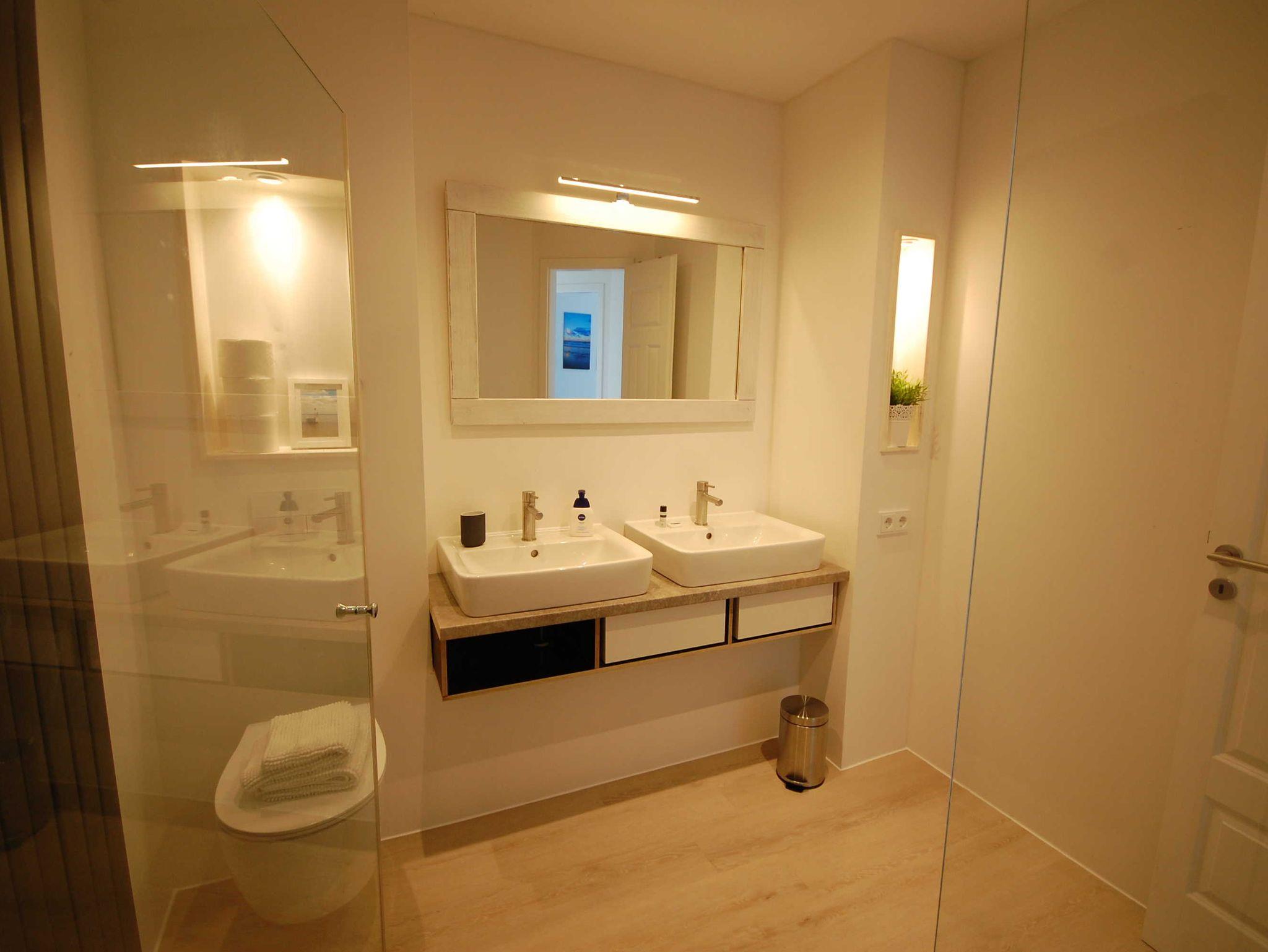 Im modernen Bad erwarten unsere Gäste eine Walk-In-Dusche, Fußbodenheizung, ein großer Handtuchheizkörper sowie ein Doppelwaschtisch aus Porzellan mit praktischem Unterschrank, Schubladen, Steckdose und Föhn.