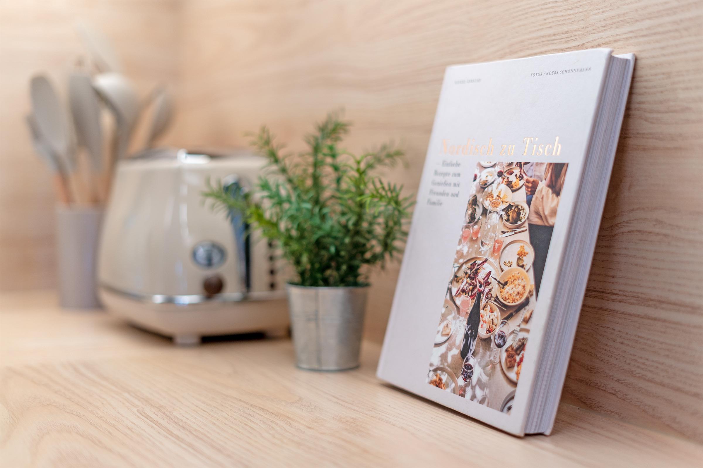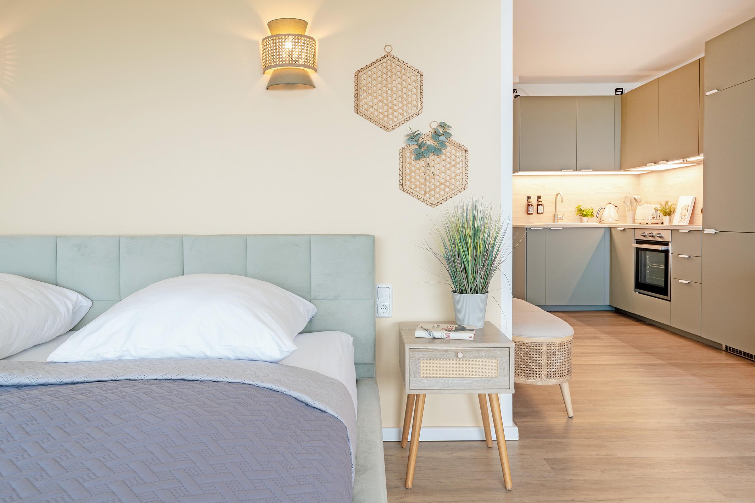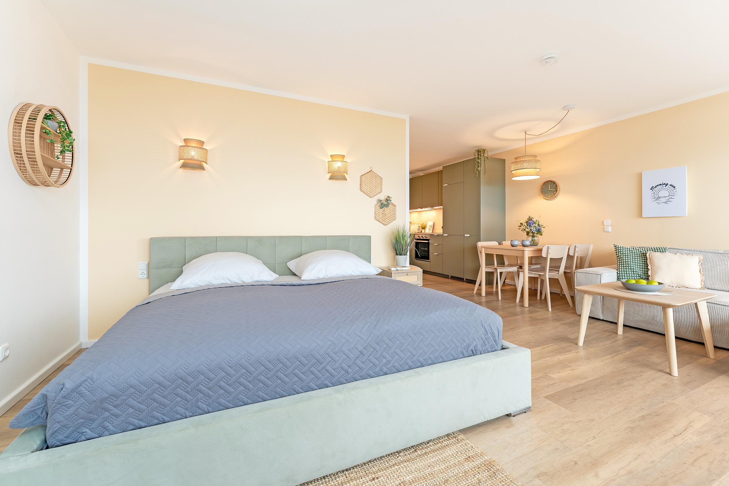 Der helle Wohn- und Schlafbereich ist modern eingerichtet und verfügt über ein großes Doppelbett (200x200 cm) sowie ein Schlafsofa (160x200 cm), sodass hier bis zu vier Gäste bequem Platz finden. Große Fenster mit Verdunklungsmöglichkeiten (Rollos) lassen viel Tageslicht herein und eröffnen einen herrlichen Blick auf die Ostsee. Die angrenzende Küchenzeile ist vollständig ausgestattet mit Backofen, Induktionsherd, Geschirrspülmaschine, Kühlschrank, Kaffeemaschine und Toaster – perfekt, um auch im Urlaub komfortabel zu kochen. Ein kleiner Essbereich lädt zu gemeinsamen Mahlzeiten ein. Das Badezimmer ist modern gestaltet und verfügt über Dusche/WC sowie einen beheizbaren Handtuchhalter für zusätzlichen Komfort.