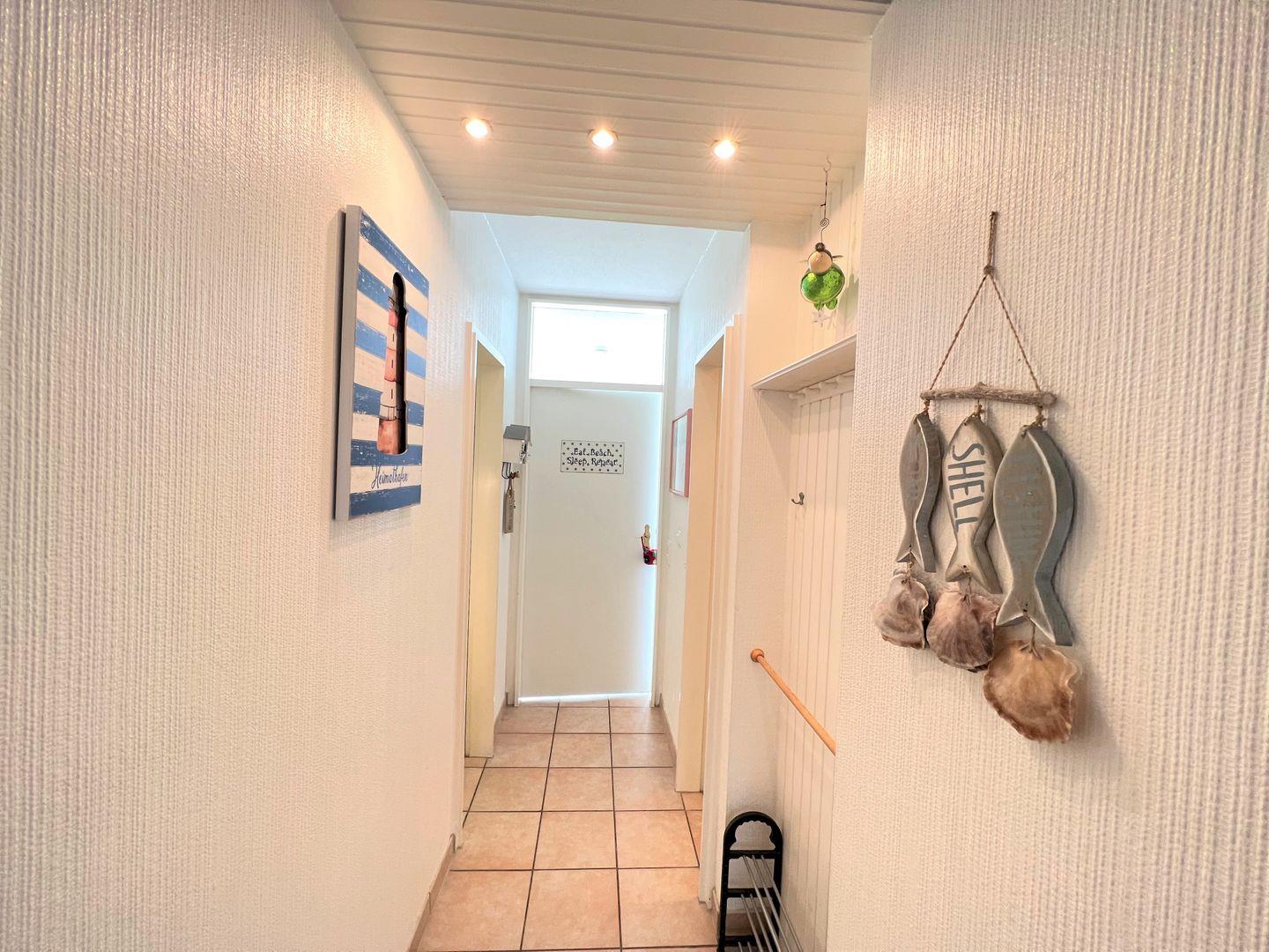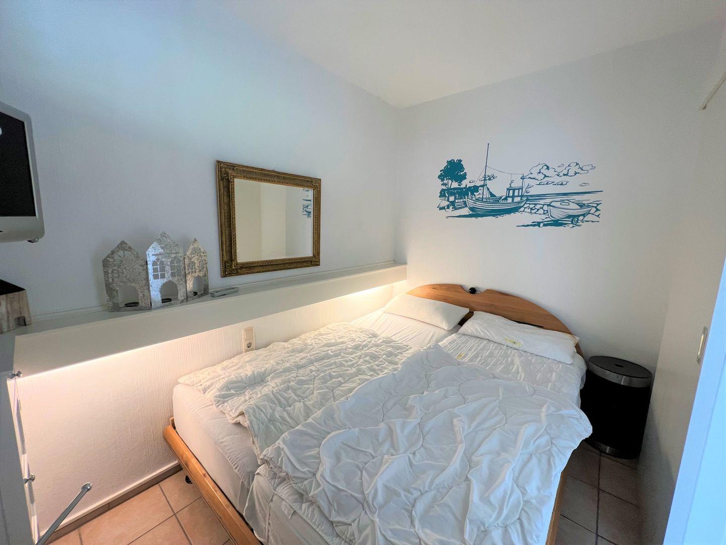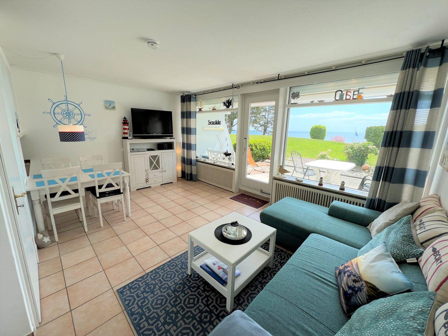 Das Apartment Nr. 015 befindet sich in der 1. Reihe der Terrassenhäuser in unmittelbarer Strandnähe. Genießen Sie von der Terrasse aus den Meerblick. Die Küche mit Spülmaschine und Backofen hat eine Durchreiche zum maritimen Wohn-und Esszimmer. Ein Schlafzimmer mit Doppelbett, ein Kinderzimmer mit Etagenbett und ein Badezimmer mit Dusche runden diese Ferienunterkunft ab. Die Schlafräume haben ein Oberlicht zum Öffnen. WLAN ist inklusive.