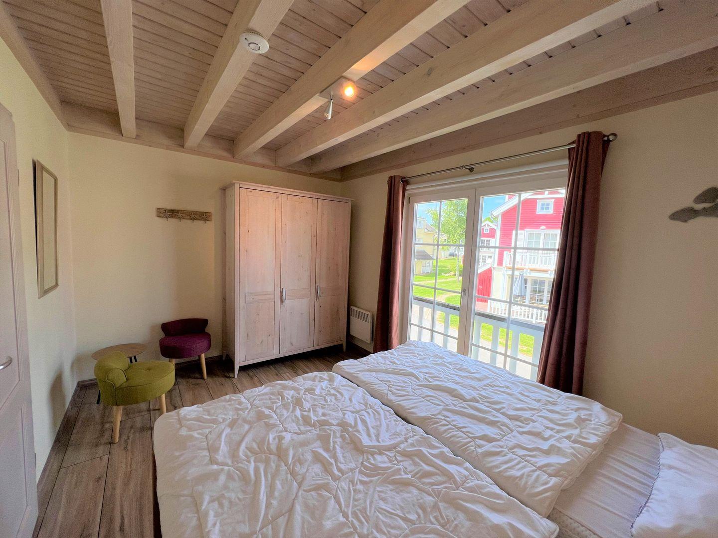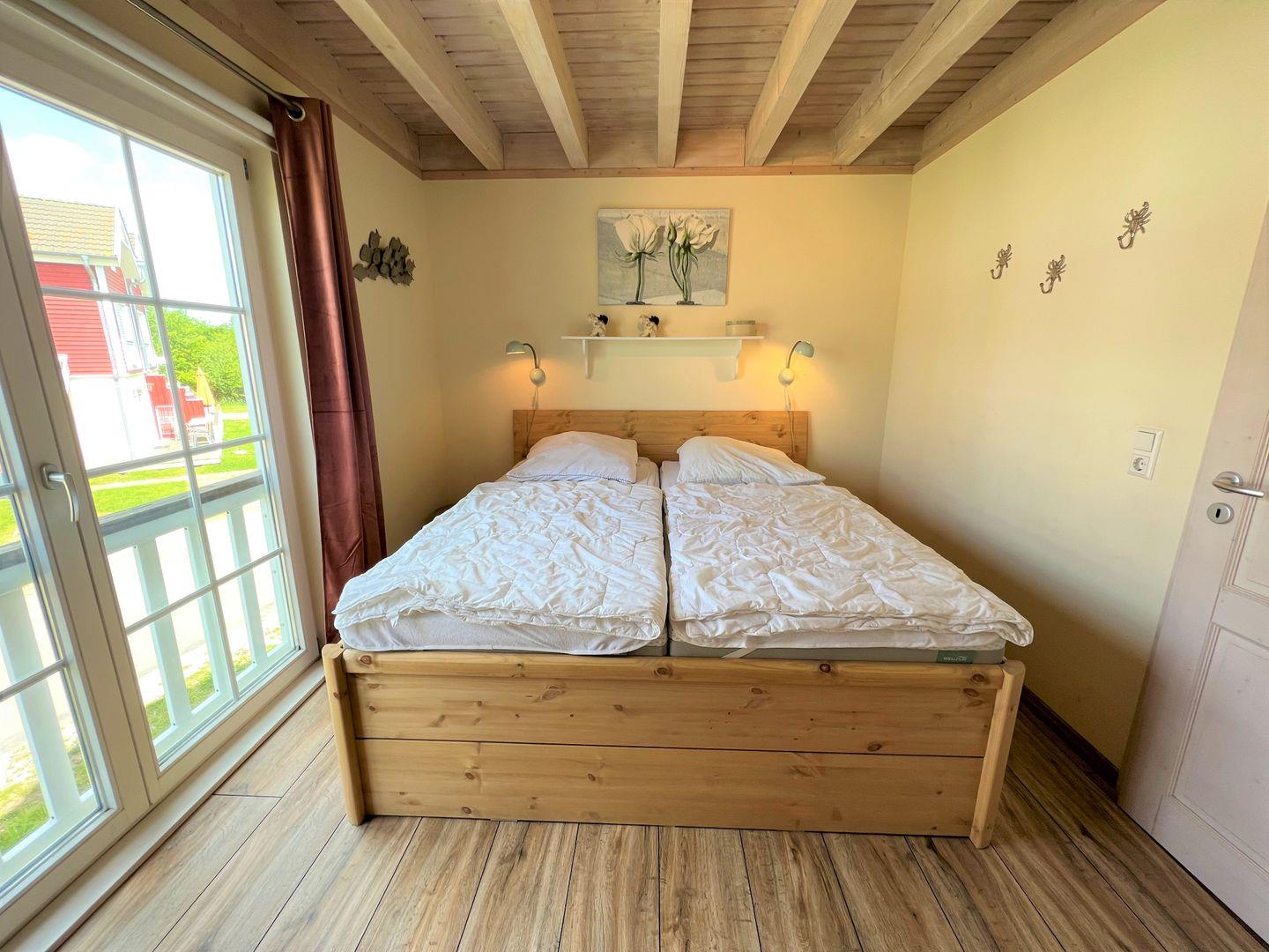 Unsere 84 qm großen Doppelhaushälften vom Typ "Windjammer" bieten viel Platz und Wohlfühl-Komfort über 3 Etagen. Der Wohn-Essbereich mit Kamin und der offene Küchenbereich liegen im Erdgeschoss, sowie die Sauna mit Dusche und WC. Der Komfort einer eigenen Sauna wird sehr von unseren Wintergästen geschätzt. Die Küche ist mit Spülmaschine, Backofen, Herd und Waschmaschine voll ausgestattet. Vom Wohn- und Essbereich haben Sie Zugang zur Terrasse, von der Sie den Ostseeblick genießen können. In der ersten Etage sind zwei Schlafräume mit Doppelbetten (jeweils 2 x 80 cm x 200 cm), sowie das Bad mit WC und Whirlwanne. Einen 3. Schlafbereich mit zwei getrennten Betten (jeweils 80 cm x 200 cm) findet man in der 2. Etage in einer offenen Schlafgalerie unterm Dach - Ostseeblick inklusive. Die Beheizung erfolgt über Elektroheizungen und den Kamin.