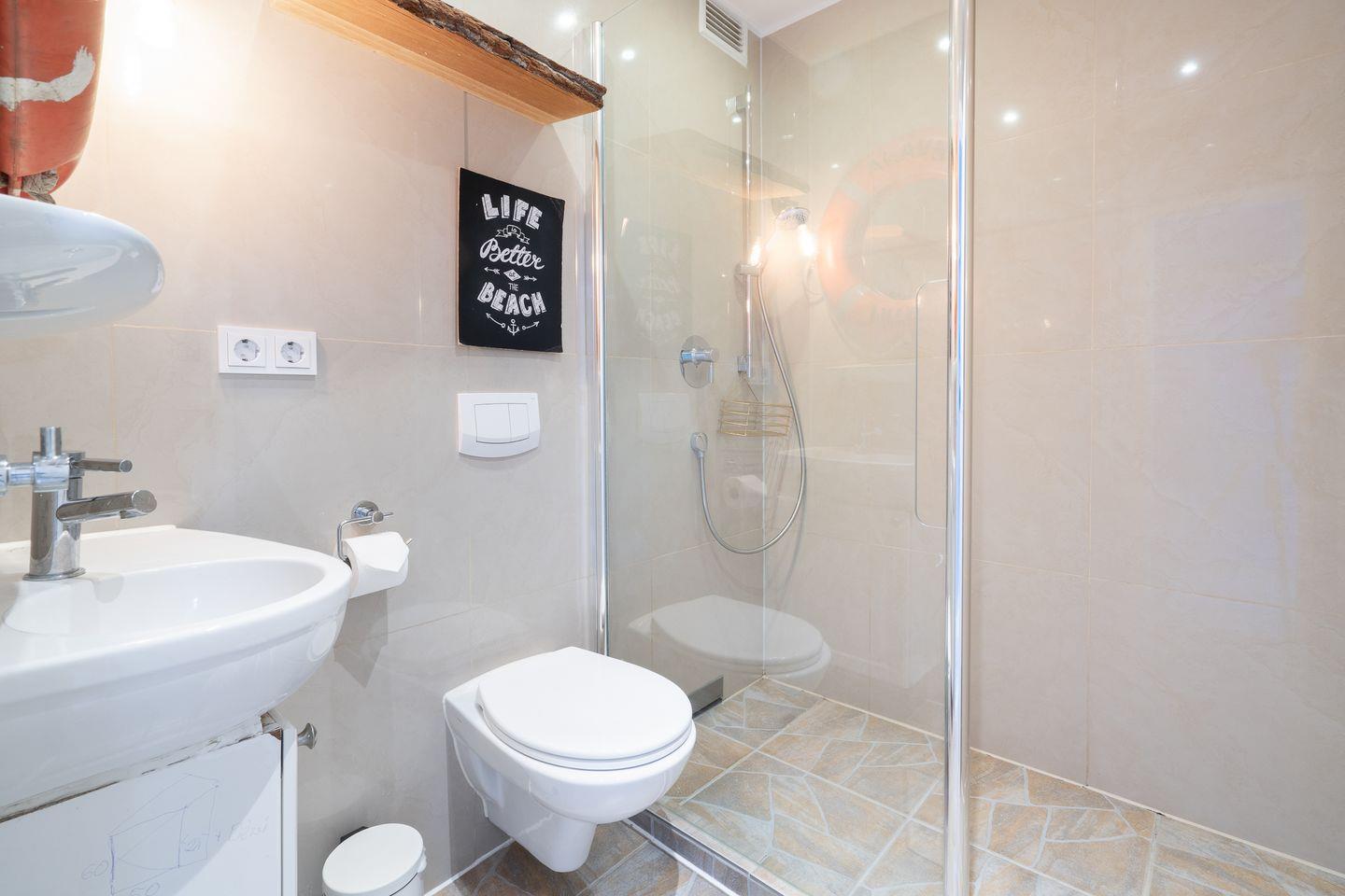 Die Ferienwohnung mit Balkon bietet allen Komfort für erholsame und entspannte Tage an der Ostsee. Von Sonnenaufgang bis zum Nachmittag können Sie die Sonne genießen, eine Markise ist auf dem Balkon vorhanden. Mit 55qm Wohnfläche ist Platz für bis zu 4 Personen. Das helle und maritim gestaltete Wohnzimmer bietet durch die großen Panoramafenster einen atemberaubenden Blick auf die Ostsee. Hier finden Sie ein Boxspringbett (160 cm x 200 cm) direkt vor der großen Panoramascheibe. Verdunklungsrollos sorgen für einen erholsamen Schlaf. Im separaten Schlafraum mit TV befindet sich ein ausziehbares Einzelbett (2x 80 x 200 cm). Der Essbereich und eine Wohnlandschaft mit zwei Ruhesesseln und Leseecke mit Flatscreen-TV (55 Zoll) runden die tolle Ausstattung der Wohnung ab. Eine große Auswahl an Gesellschaftsspielen, Büchern und DVDs lädt zum gemütlichen und entspannten Verweilen ein. Die separate Küche ist klein, aber hochwertig mit Backofen und Herd ausgestattet. Das moderne Duschbad ist innenliegend. Ohne eine Straße überqueren zu müssen, sind es nur wenige Gehminuten zum schönen Sandstrand. PKW-Stellplatz inklusive.