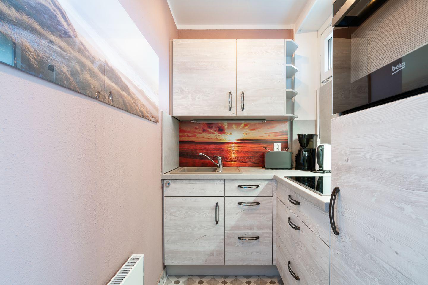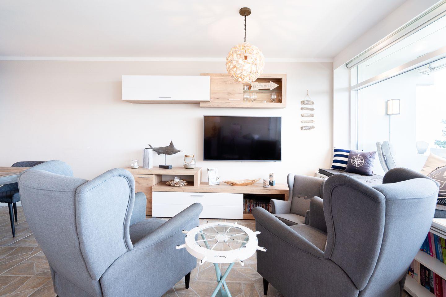 In 1. Reihe entdecken Sie hier Ihre Liebe zum Strand. Mit 55qm Wohnfläche ist Platz für bis zu 4 Personen. Das helle und maritim gestaltete Wohnzimmer bietet durch die großen Panoramafenster einen herrlichen Blick auf die Ostsee. Hier steht ein Boxspringbett direkt vor der großen Panoramascheibe. Im separaten Schlafraum mit TV befindet sich ein ausziehbares Einzelbett. Die kleine, abgetrennte Küche ist mit Backofen und Herd ausgestattet, das innenliegende Duschbad ist modern. WLAN ist inklusive.