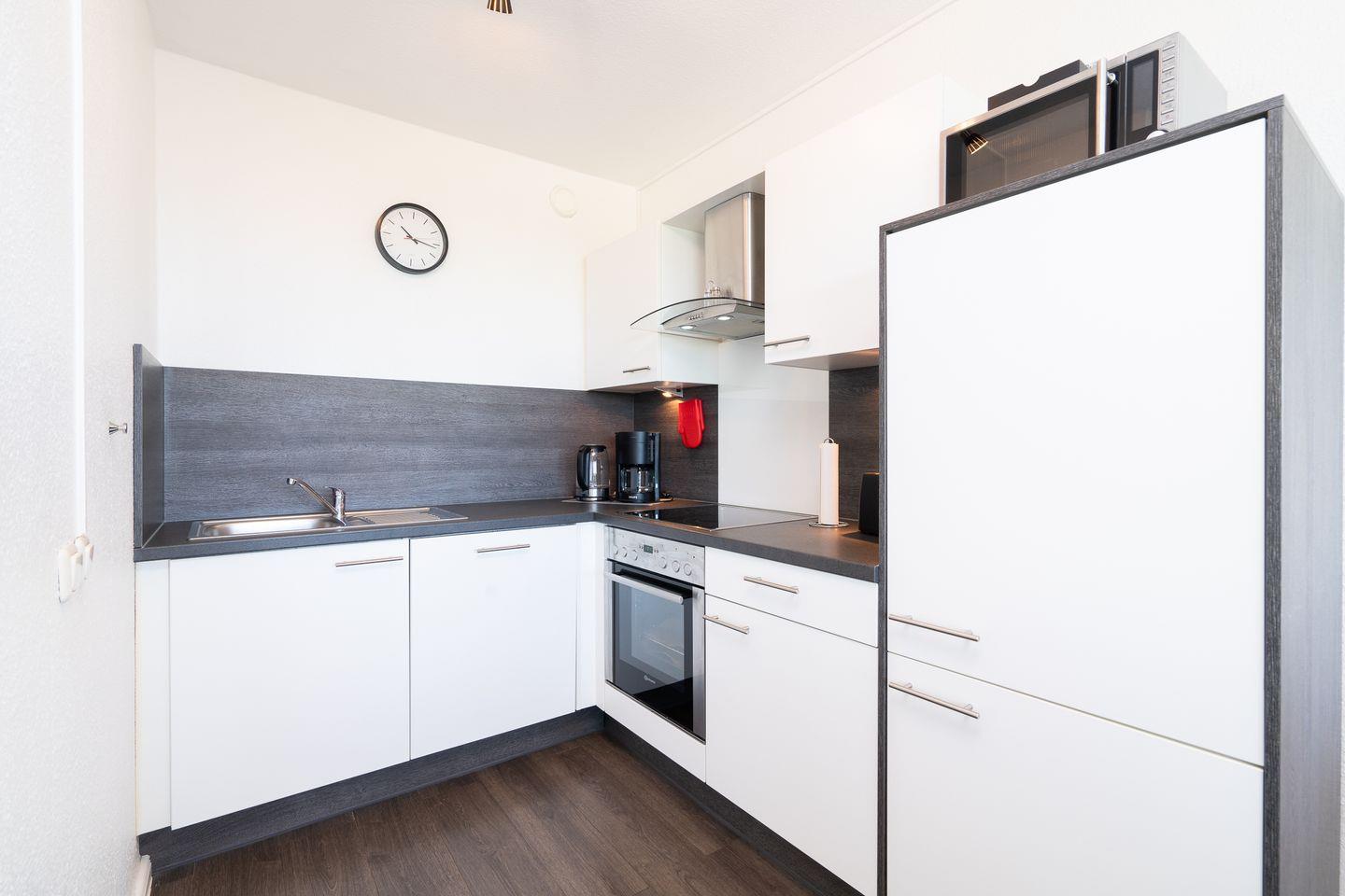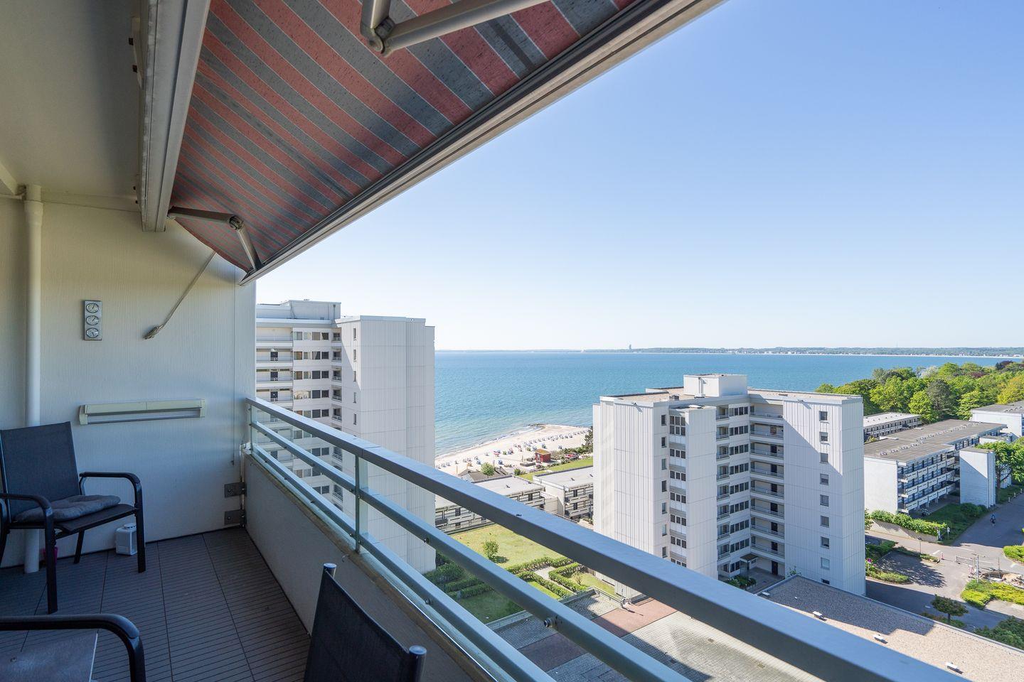 Die 3-Raum-Ferienwohnung befindet sich in der 10. Etage mit Balkon in Süd-West-Lage und schönem Ostseeblick. Im ersten Schlafraum befindet sich ein Doppelbett und im zweiten ein franz. Bett. Im Wohnbereich befindet sich zudem eine Schlafcouch. Die Küche ist zum Wohn- und Essbereich hin offen und ist mit Geschirrspüler, Herd und Backofen ausgestattet. Das moderne Duschbad ist inneliegend. Der Strand ist fußläufig max. 5 min. entfernt.