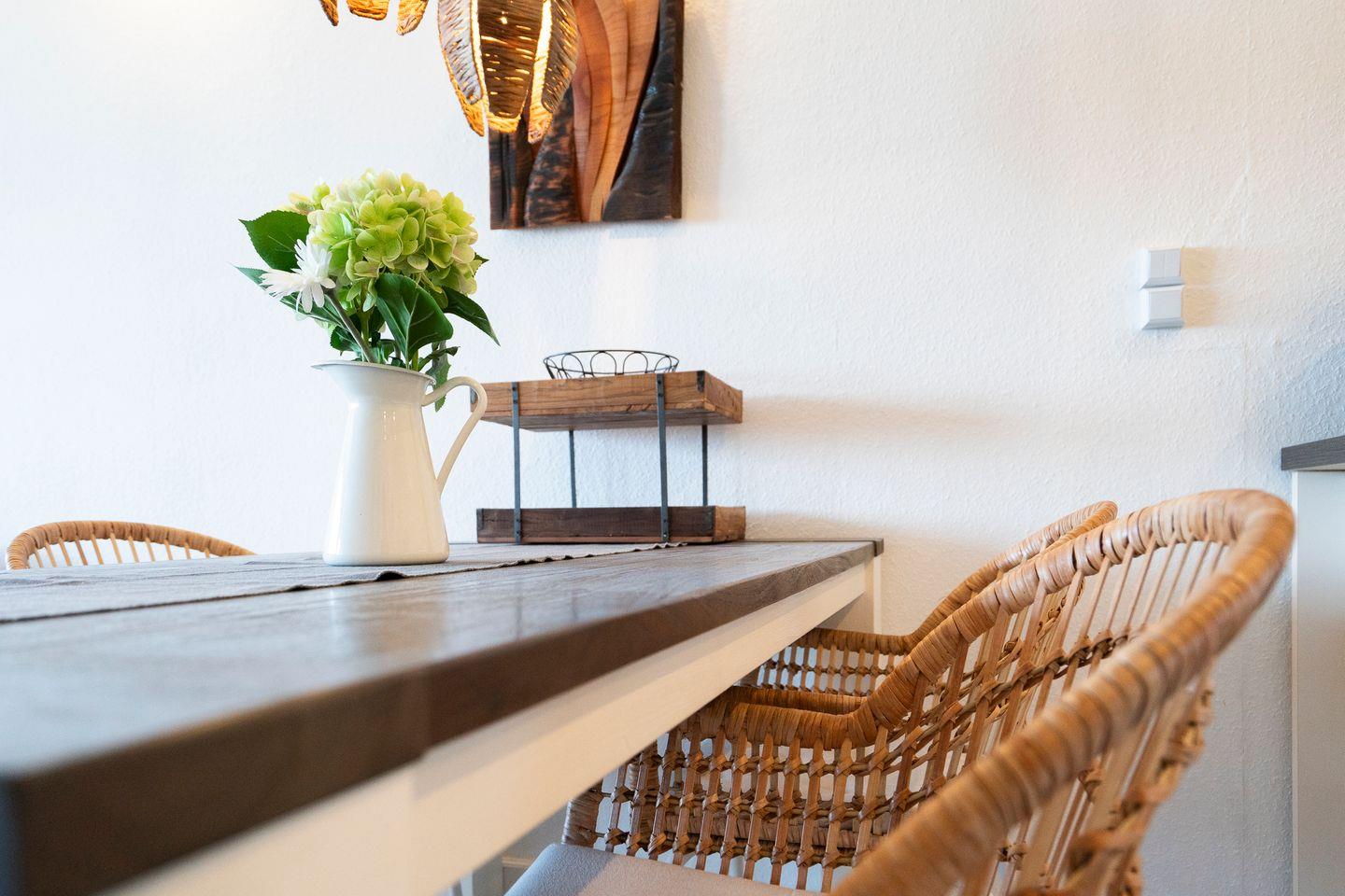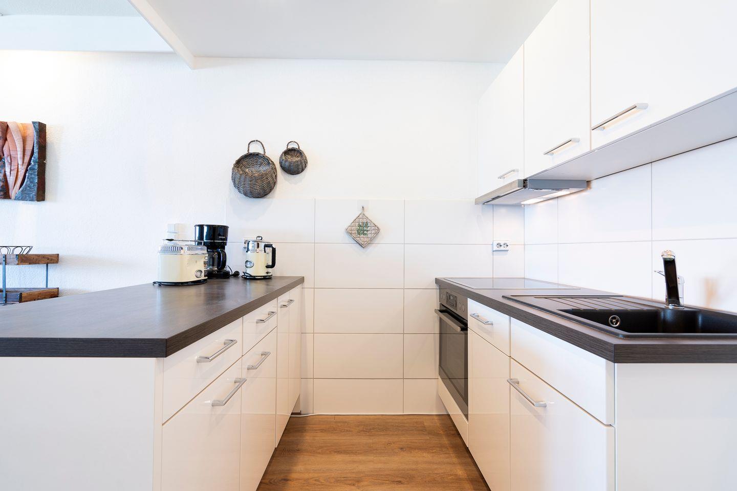 Die voll ausgestattet Küchenzeile überzeugt u.a. mit großem Kühlschrank, separatem Gefrierfach, Spülmaschine, Cerankochfeld und Backofen.