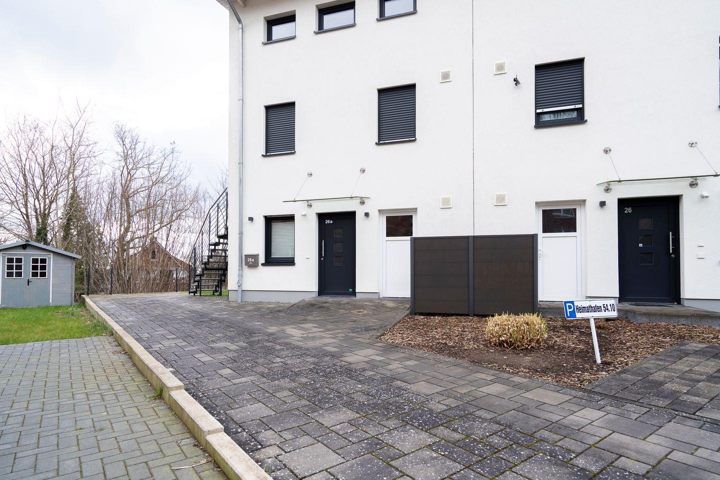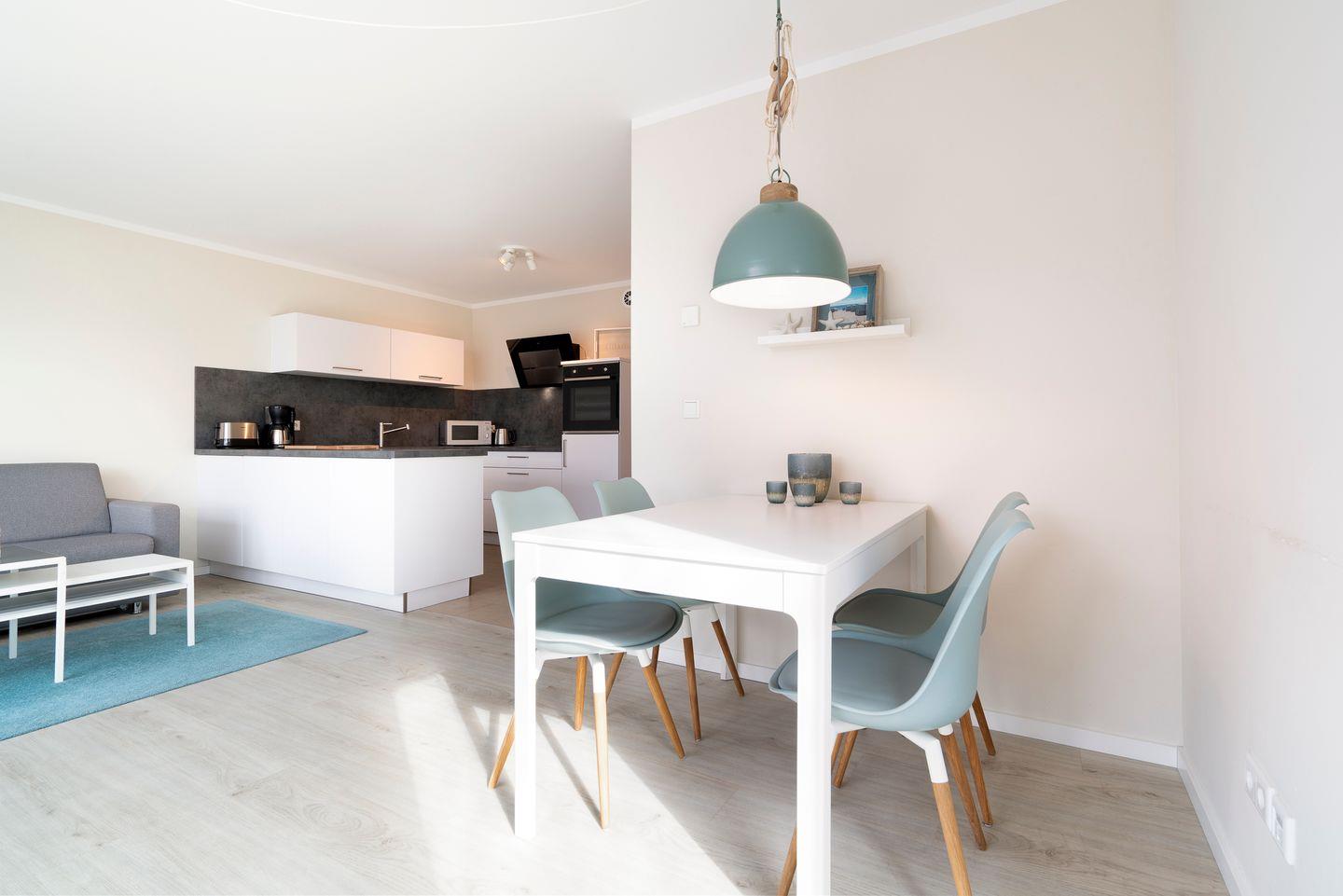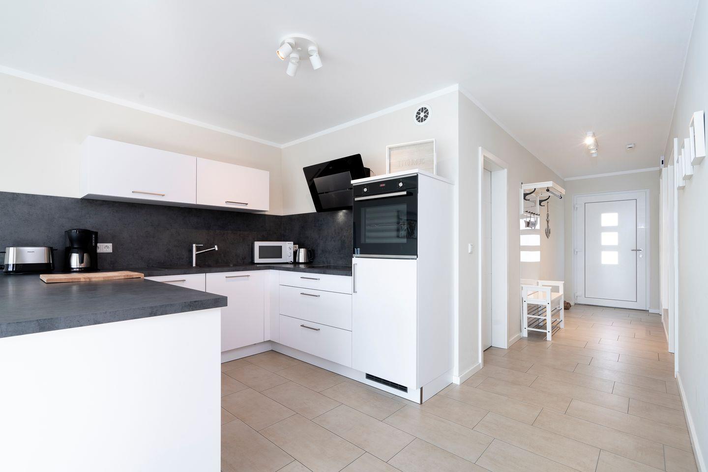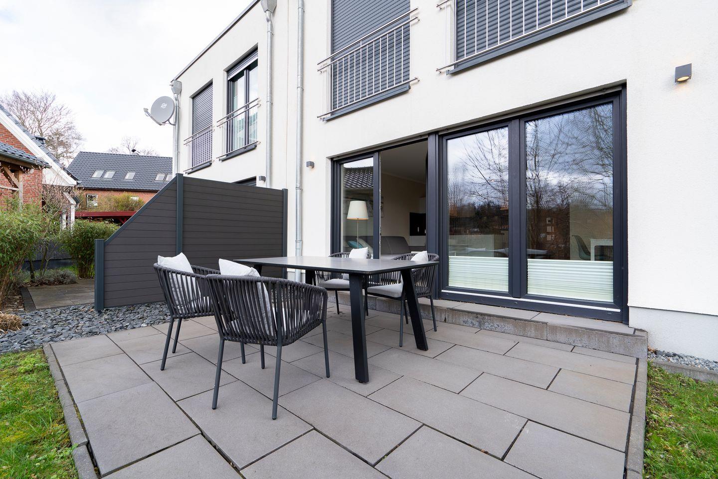Die top-moderne EG-Wohnung befindet sich in einem Neubau und wurde erst in 2018 fertig gestellt. Im Schlafraum befindet sich ein Doppelbett (2 x 0,9m x 2m). Die offene Küche ist in den Wohnraum integriert und komplett ausgestattet. Im Wohnbereich befindet sich eine Schlafcouch für die 3te Person und der Zugang zur Terrasse. Das Bad ist mit WC und Dusche. Die Wohnung wird angenehm per Fußbodenheizung geheizt. In der Nähe befindet sich die Bahn, diese ist aber bei geschlossenen Fenstern (3-Fach-Verglasung) nicht zu hören. Das Objekt ist gut isoliert. Zum Strand sind es ca. 10 Gehminuten.