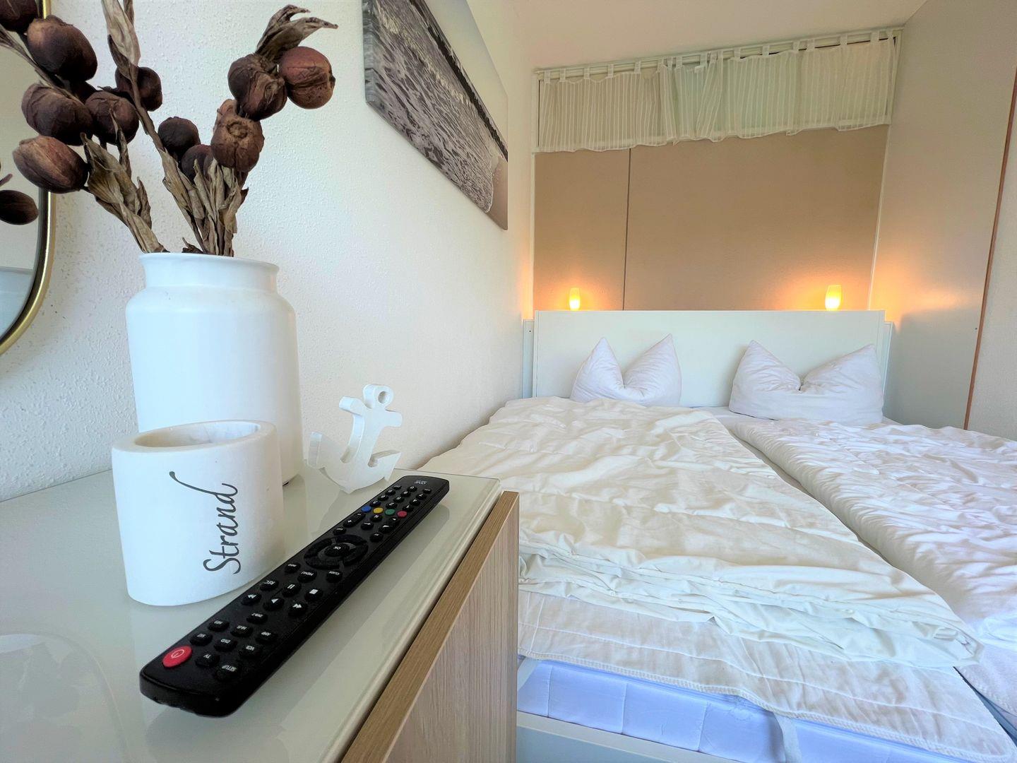 hier finden Sie eine maritime, hell und freundlich eingerichtete 50 qm 3-Raum-Ferienwohnung in der Apartmentanlage Panoramic. Es gibt einen Wohnraum mit Essbereich und einem Balkon in Ostlage mit Blick ins Grüne. In der Wohnung sind 2 innenliegende Schlafräume - das erste Schlafzimmer mit Doppelbett (180 x 200 cm), das zweite mit einem 80 x 200 cm Bett, welches man zu einer größeren Liegefläche ausklappen kann (dann 160 x 200 cm). Ist das Bett nicht ausgezogen, hat ein Kinderbett ausreichend Platz.. Der zweite Schlafraum hat ein Oberlicht zum anderen Schlafraum. Die Küche ist zum Essbereich offen und ist mit Spülmaschine, Backofen und Herd ausgestattet. Das moderne und helle Wannenbad ist innenliegend. Zum Strand sind es nur wenige Minuten zu Fuß.
