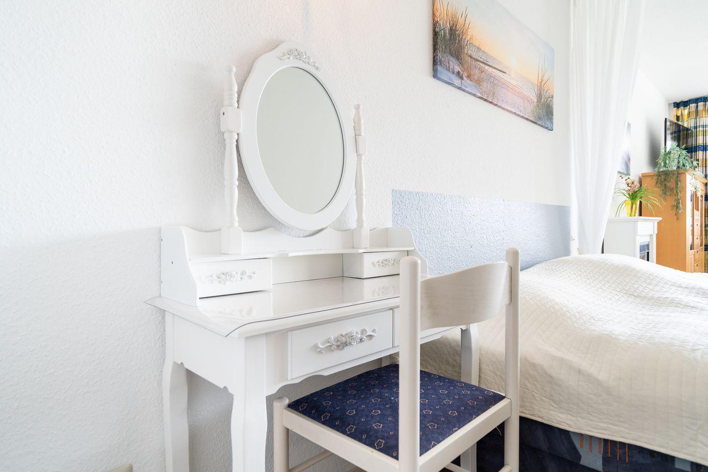 die geräumige 1-Raum-Ferienwohnung mit Balkon in Süd-Ost-Lage ist für maximal 2 Personen ausgestattet. Die Küche ist zum Ess- und Wohnbereich offen und mit Spülmaschine, Backofen und Herd ausgestattet. Das Doppelbett (2x 90 cm x 200 cm) kann mit einem Vorhang optisch vom gemütlichen Wohnraum getrennt werden. Es gibt ein innenliegendes, helles Duschbad. PKW-Stellplatz inklusive. Zum Strand sind es nur wenige Fußschritte.