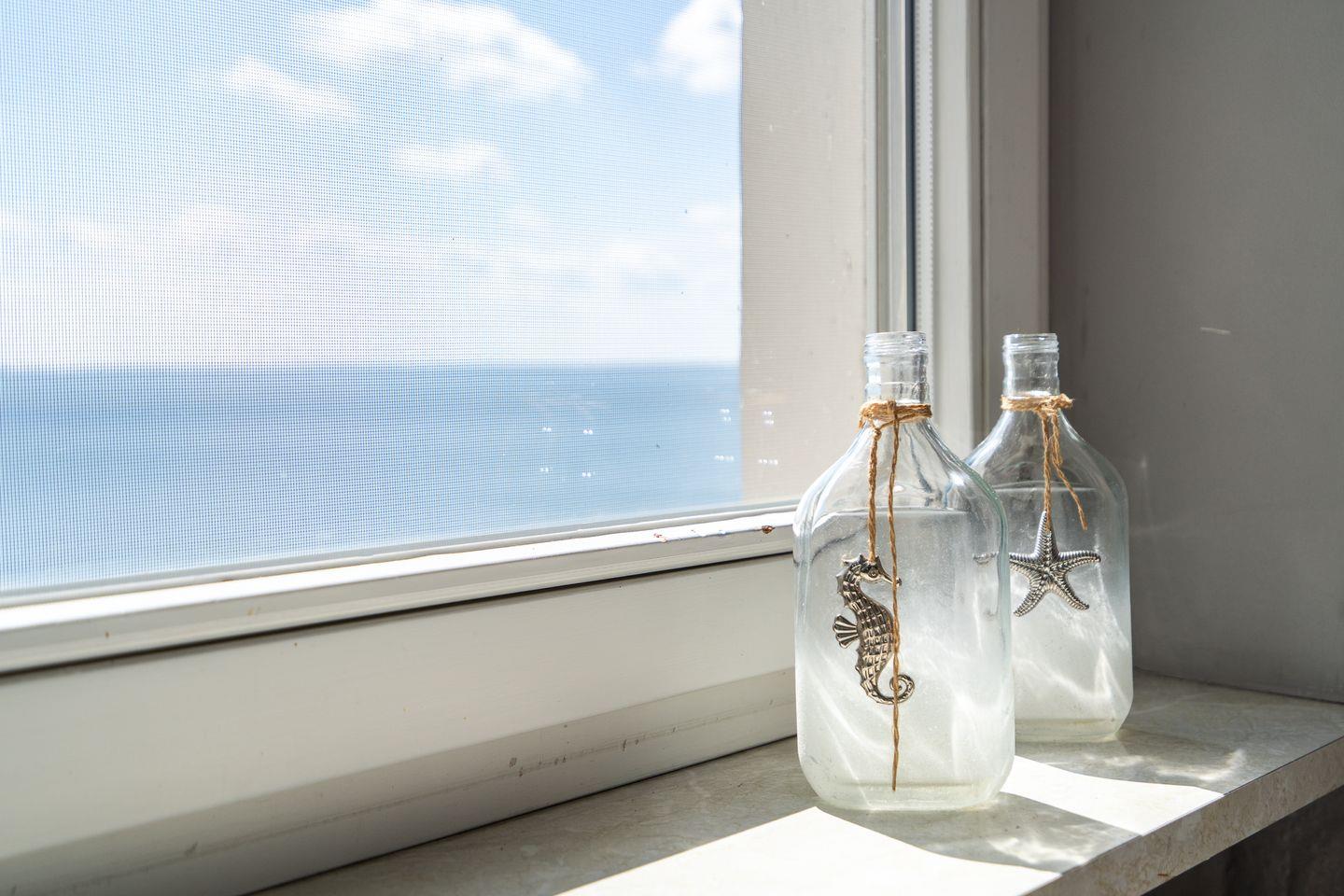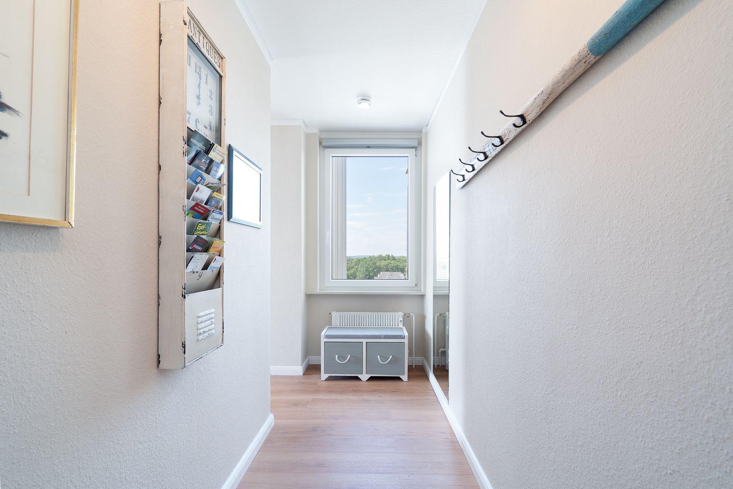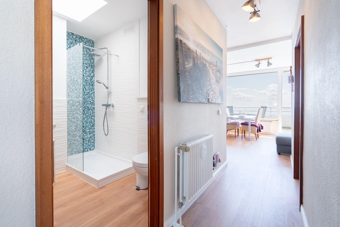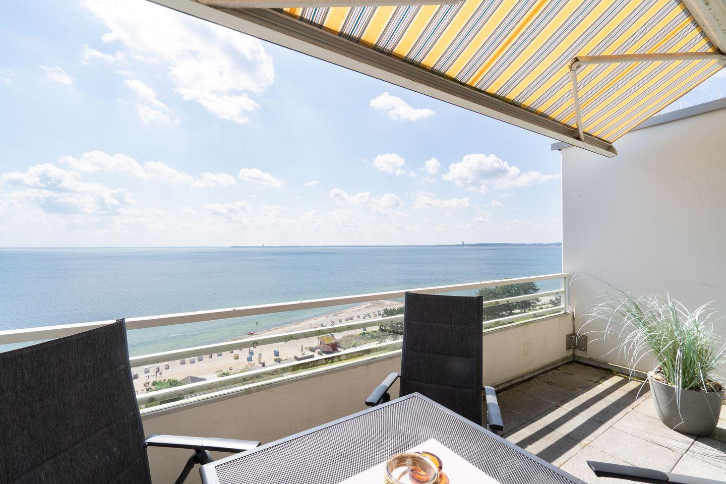 Die 55 qm große gemütliche Ferienwohnung bietet vom 8. Stock aus ein traumhaftes Panorama über die Ostsee - von Sonnenaufgang bis zum Nachmittag können Sie hier die Sonne genießen. Vom Wohnzimmer mit großem Panoramafenster haben Sie Zugang zum großzügigen Balkon, eine Markise ist vorhanden. Die kleine Küche mit Herd und Backofen ist in den Wohn- und Essbereich integriert. Das Schlafzimmer hat ein großes Doppelbett mit durchgängiger Matratze (180 x 200 cm) und ein Fenster mit Ostseeblick - aufwachen und das Meer sehen, so kann der Tag beginnen! Das Sofa im Wohnzimmer hat eine Schlaffunktion (140 x 200 cm). Das Wannenbad ist innenliegend. Der rechte Fahrstuhl fährt nur mit Schlüssel in die 8. Etage.