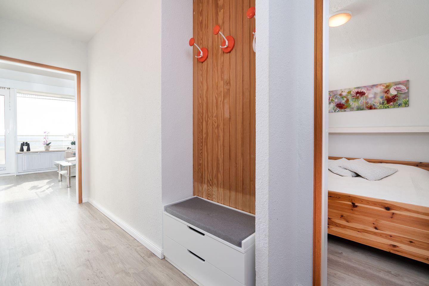Die Ferienwohnung mit zwei Schlafzimmern ist ideal für Ihren entspannten Familienurlaub am Strand. Vom hellen kombinierten Wohn- und Essbereich haben Sie Zugang zum Balkon, von der 5. Etage aus haben Sie einen wunderschönen Blick auf die Lübecker Bucht. Die Küche ist mit Herd und Backofen ausgestattet und mit einer Durchreiche zum Wohn-/Essbereich hin offen. Das erste Schlafzimmer hat ein Doppelbett, im zweiten Schlafzimmer steht ein Etagenbett. Das Wannenbad ist innenliegend. Zum Strand und zur Promenade sind es nur wenige Gehminuten. Der PKW-Stellplatz im Parkdeck ist inklusive. Er ist nur über eine Treppe erreichbar, ein Seiteneingang führt aber zum Fahrstuhl zum ebenerdigen Be-und Entladen.
