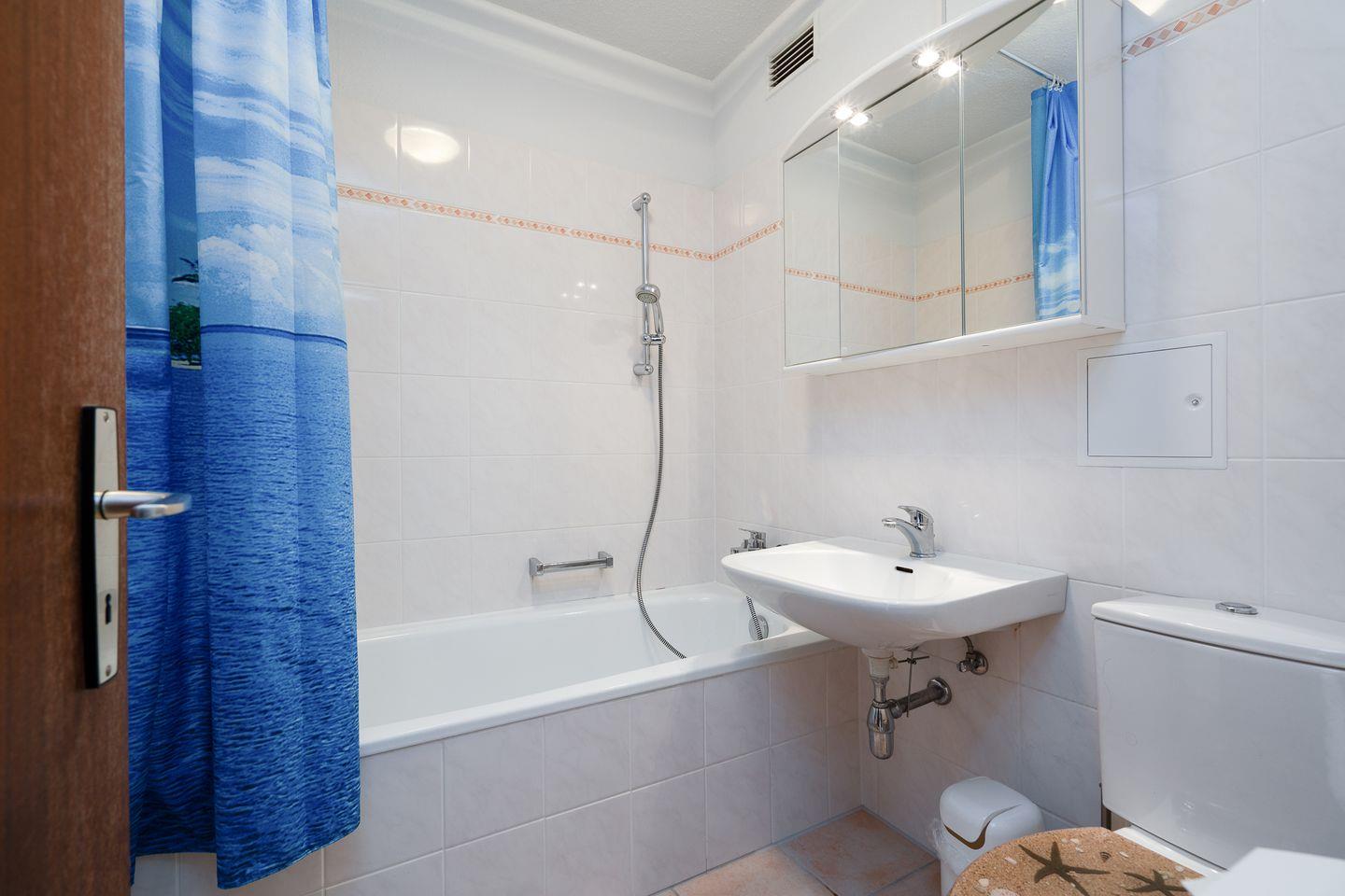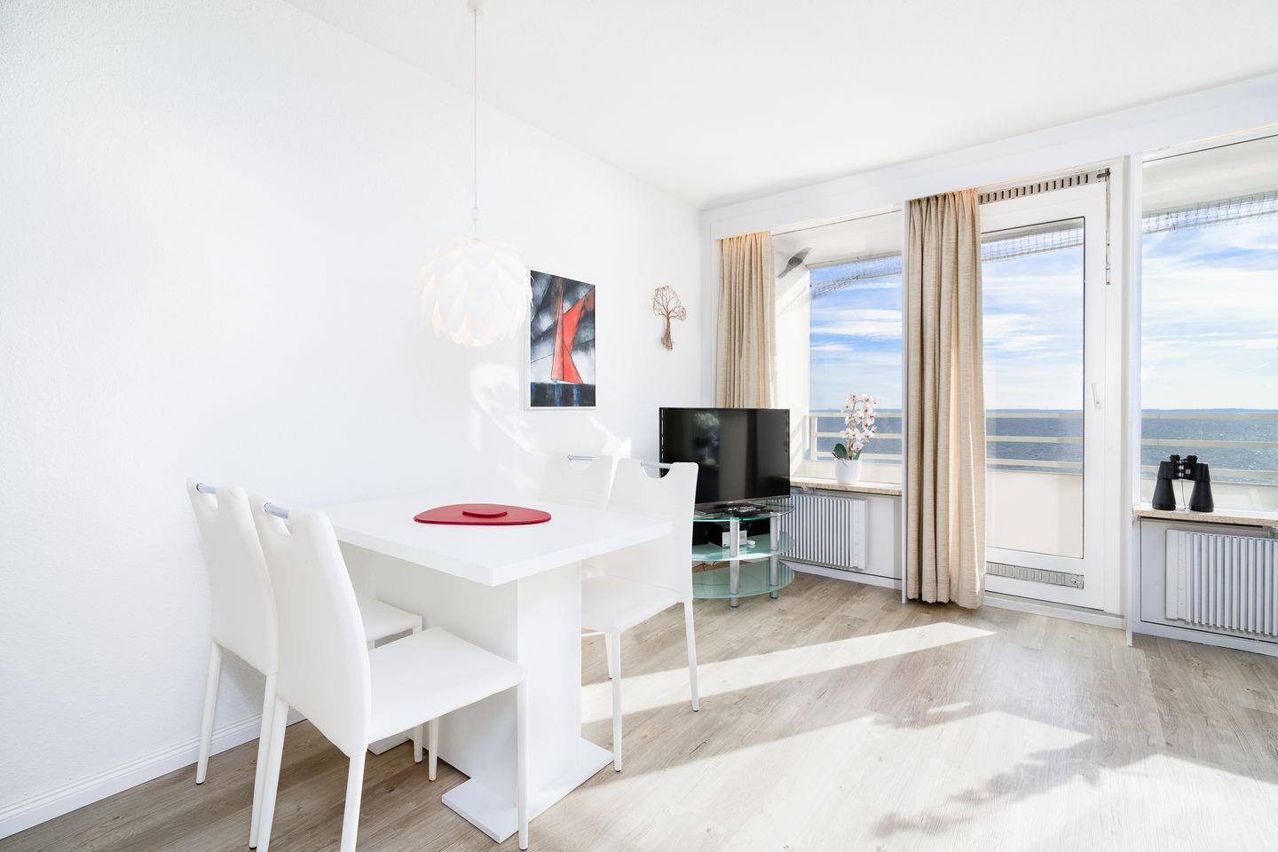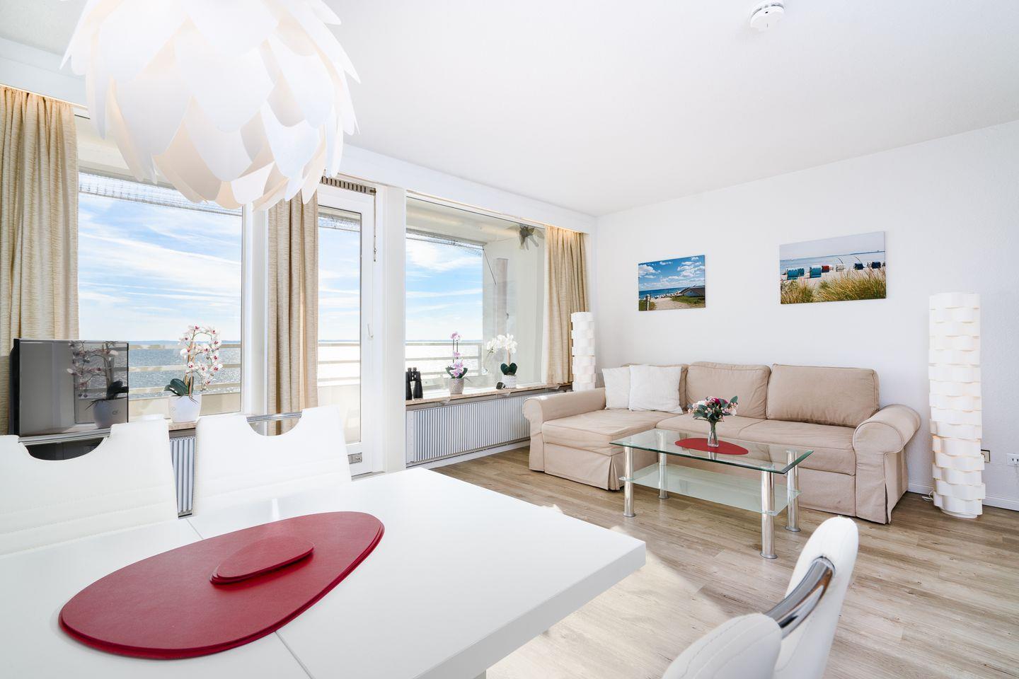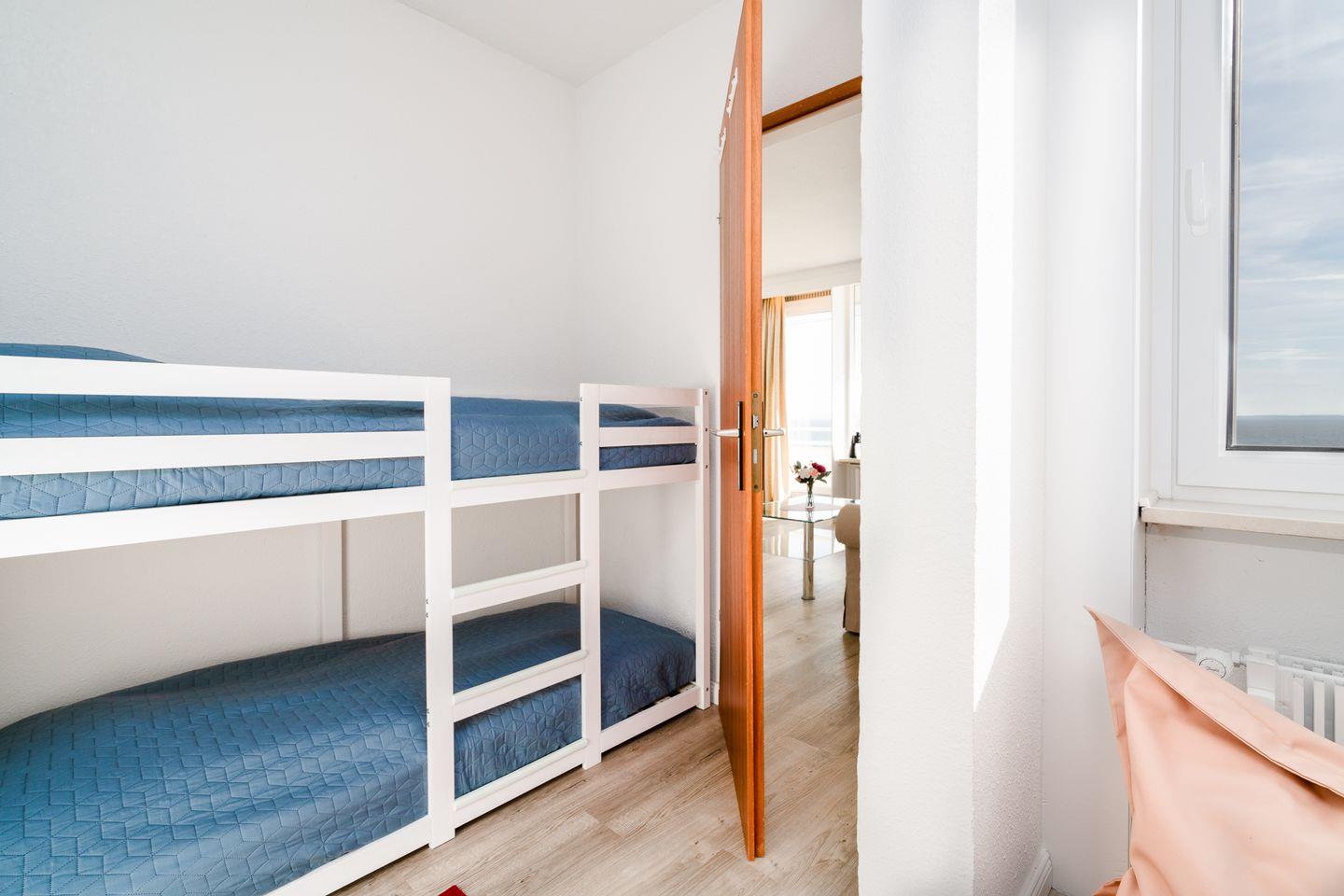 Die Ferienwohnung mit zwei Schlafzimmern ist ideal für Ihren entspannten Familienurlaub am Strand. Aus der 5. Etage aus haben Sie einen wunderschönen Blick auf die Lübecker Bucht. Die Küche mit Herd und Backofen ist mit einer Durchreiche zum Wohn-/Essbereich hin offen. Das erste Schlafzimmer hat ein Doppelbett, im zweiten steht ein Etagenbett. Das Wannenbad ist innenliegend. Zum Strand sind es nur wenige Gehminuten. WLAN inklusive.