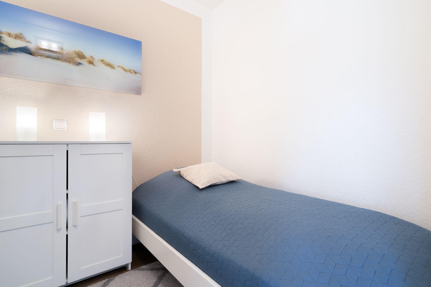 Die schöne 3-Raum-Ferienwohnung ist für 4 Personen geeignet. Der geräumige Wohn-/Essraum bietet eine gemütliche Sitzecke, sowie einen Esstisch. Von hier haben Sie auch Zugang zum Balkon mit Sitzgruppe und Strandkorb. Die mit Spülmaschine, Backofen und Herd ausgestattete Küche ist zum Wohn-/Essbereich hin offen. Im ersten Schlafraum stehen zwei Einzelbetten, im zweiten steht ein Etagenbett. Das moderne Duschbad ist innenliegend. Zum Strand sind es nur wenige Gehminuten. WLAN inklusive.