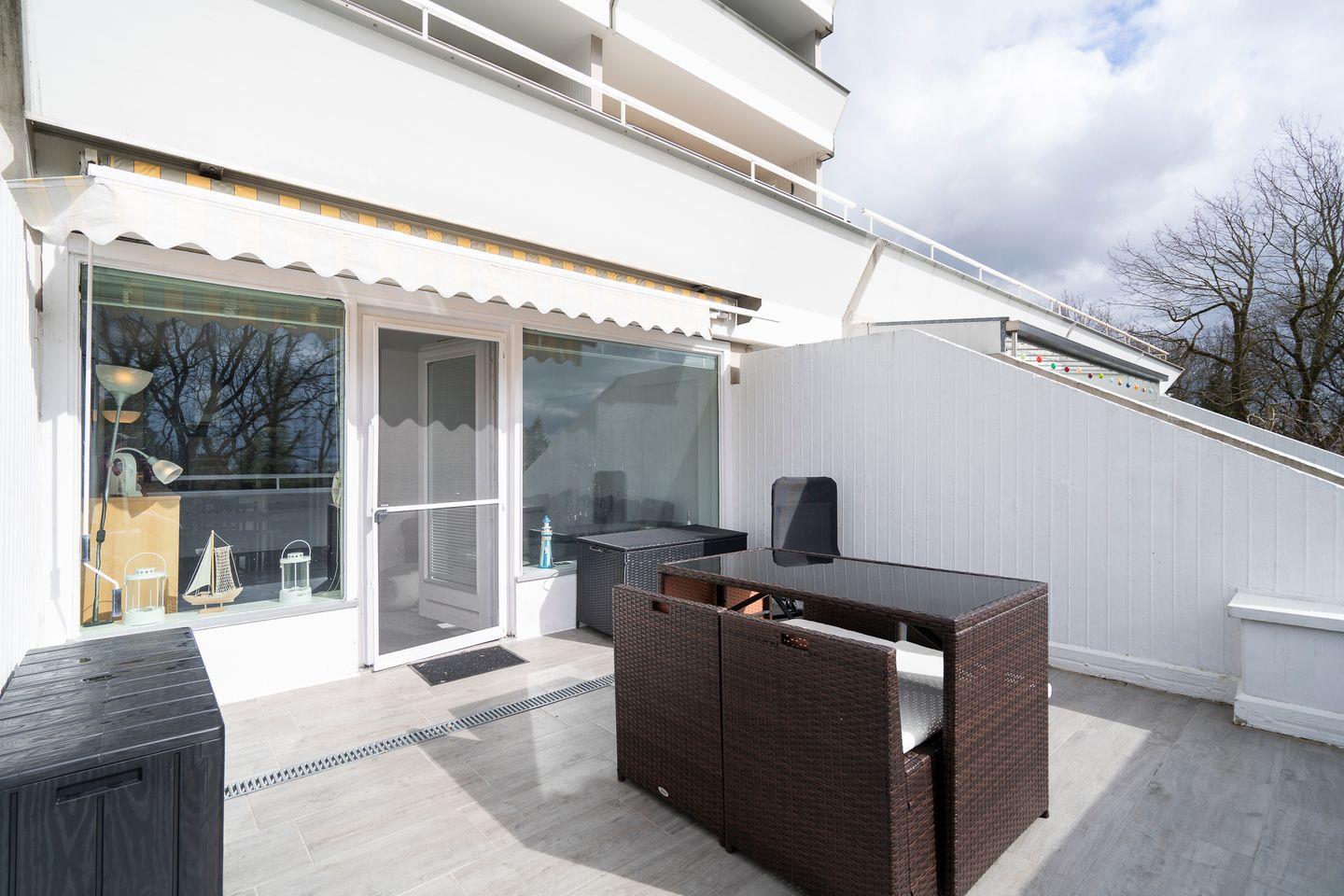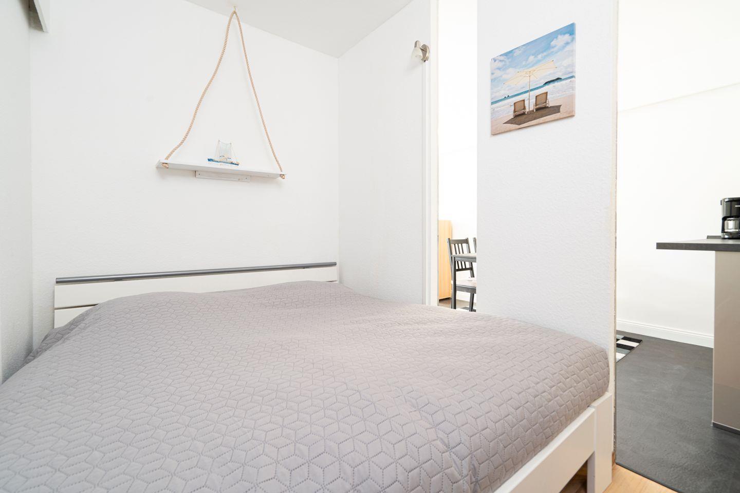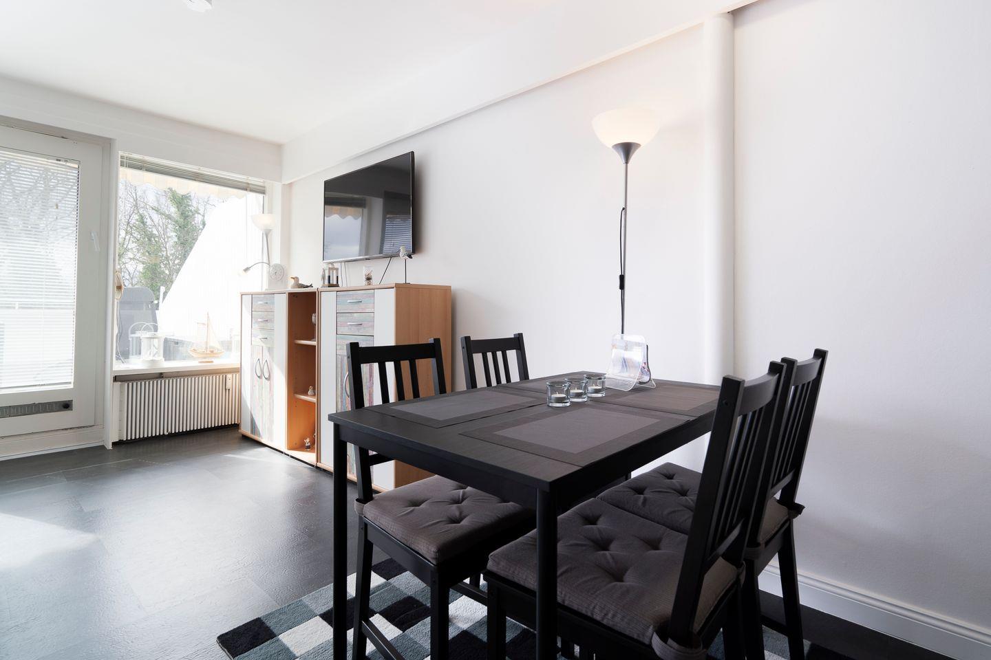 Genießen Sie auf dem großzügigen Balkon in Südlage die Sonne und lassen Sie Ihre Seele baumeln! Vom kombinierten Wohn- und Essbereich mit offener Küche haben Sie Zugang zum möblierten Balkon. Die Küche ist mit Spülmaschine, Backofen und Herd ausgestattet. Das Schlafzimmer verfügt über ein bequemes Doppelbett (160 cm x 200 cm) und ist optisch durch Raumteiler vom Rest der Wohnung getrennt. Auf dem Schlafsofa (140 cm x 200 cm) im Wohnbereich ist Platz für zwei weitere Personen. Das moderne Bad ist mit einer bodentiefen Dusche und einem kleinen Fenster ausgestattet. Zum Strand sind es nur wenige Gehminuten. PKW-Stellplatz inklusive.