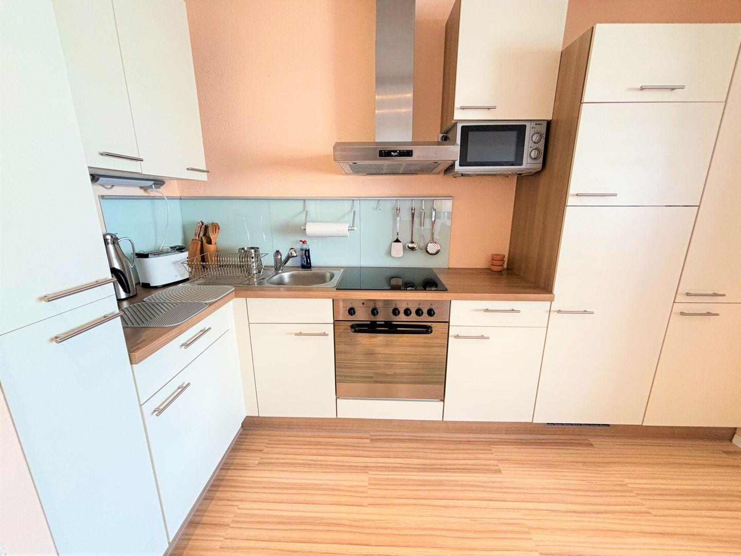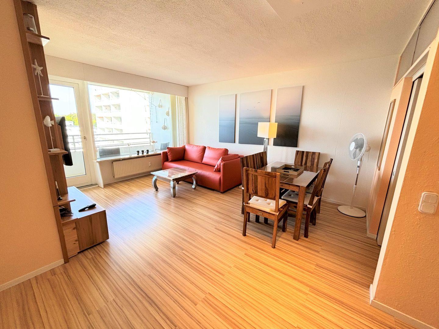 Die 2-Raum-Wohnung Nr. 301 liegt im 4. Stock und hat vom Balkon in Süd-West-Lage einen tollen Blick auf die Ostsee. Die mit Spülmaschine, Backofen und Herd ausgestattete Küche ist in den kombinierten Wohn- und Essbereich integriert. Vom Wohnraum durch ein Schiebeelement abgetrennt, befindet sich eine Schlafkammer mit einem Doppelbett und einem Fenster zum Balkon hin. Im 2. Schlafraum steht ein Doppelbett. Das Duschbad ist innenliegend. Zum Strand sind es nur wenige Fußschritte. WLAN inklusive.